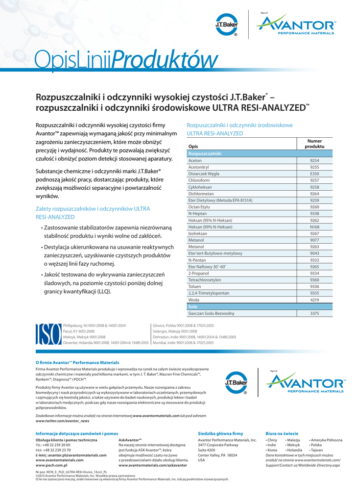 OpisLiniiProduktów Rozpuszczalniki i odczynniki wysokiej czystości J.T.Baker® – rozpuszczalniki i odczynniki środowiskowe ULTRA RESI-ANALYZED™ Rozpuszczalniki i odczynniki wysokiej czystości firmy Avantor™ zapewniają wymaganą jakość przy minimalnym zagrożeniu zanieczyszczeniem, które może obniżyć precyzję i wydajność. Produkty te pozwalają zwiększyć czułość i obniżyć poziom detekcji stosowanej aparatury. Substancje chemiczne i odczynniki marki J.T.Baker® podnoszą jakość pracy, dostarczając produkty, które zwiększają możliwości separacyjne i powtarzalność wyników. Zalety rozpuszczalników i odczynników ULTRA RESI-ANALYZED •Zastosowanie stabilizatorów zapewnia niezrównaną stabilność produktu i wyniki wolne od zakłóceń. •Destylacja ukierunkowana na usuwanie reaktywnych zanieczyszczeń, uzyskiwanie czystszych produktów o węższej linii fazy ruchomej. •Jakość testowana do wykrywania zanieczyszczeń śladowych, na poziomie czystości poniżej dolnej granicy kwantyfikacji (LLQ). Rozpuszczalniki i odczynniki środowiskowe ULTRA RESI-ANALYZED Numer produktu Opis Rozpuszczalniki Aceton Acetonitryl Disiarczek Węgla Chloroform Cykloheksan Dichlormetan Eter Dietylowy (Metoda EPA 8151A) Octan Etylu N-Heptan Heksan (95% N-Heksan) Heksan (99% N-Heksan) Izoheksan Metanol Metanol Eter tert-Butylowo-metylowy N-Pentan Eter Naftowy 30˚-60˚ 2-Propanol Tetrachloroetylen Toluen 2,2,4-Trimetylopentan Woda 9254 9255 E350 9257 9258 9264 9259 9260 9338 9262 N168 9267 9077 9263 9043 9333 9265 9334 9360 9336 9335 4219 Sole Siarczan Sodu Bezwodny Phillipsburg, NJ 9001:2008 & 14001:2004 Paryż, KY 9001:2008 Meksyk, Meksyk 9001:2008 Deventer, Holandia 9001:2008, 14001:2004 & 13485:2003 3375 Gliwice, Polska 9001:2008 & 17025:2005 Selangor, Malezja 9001:2008 Dehradun, Indie 9001:2008, 14001:2004 & 13485:2003 Mumbai, Indie 9001:2008 & 17025:2005 O firmie Avantor™ Performance Materials Firma Avantor Performance Materials produkuje i wprowadza na rynek na całym świecie wysokosprawne odczynniki chemiczne i materiały pod kilkoma markami, w tym J. T. Baker®, Macron Fine Chemicals™, Rankem™, Diagnova™ i POCH™. Produkty firmy Avantor są używane w wielu gałęziach przemysłu. Nasze rozwiązania z zakresu biomedycyny i nauk przyrodniczych są wykorzystywane w laboratoriach uczelnianych, przemysłowych i zajmujących się kontrolą jakości, a także używane do badań naukowych, produkcji leków i badań w laboratoriach medycznych, podczas gdy nasze rozwiązania elektroniczne są stosowane do produkcji półprzewodników. Dodatkowe informacje można znaleźć na stronie internetowej www.avantormaterials.com lub pod adresem www.twitter.com/avantor_news Informacje dotyczące zamówień i pomoc Obsługa klienta i pomoc techniczna tel: + 48 32 239 20 00 fax: +48 32 239 23 70 e- mail: [email protected] www.avantormaterials.com www.poch.com.pl AskAvantor™ Na naszej stronie internetowej dostępna jest funkcja ASK Avantor™, która obejmuje możliwość czatu na żywo z przedstawicielami działu obsługi klienta. www.avantormaterials.com/askavantor Siedziba główna firmy Biura na świecie Avantor Performance Materials, Inc. 3477 Corporate Parkway Suite #200 Center Valley, PA 18034 USA • Chiny • Malezja • Ameryka Północna • Indie • Meksyk • Polska • Korea • Holandia • Tajwan Dane kontaktowe w tych miejscach można znaleźć na stronie www.avantormaterials.com/ Support/Contact-us/Worldwide-Directory.aspx Nr poz. 9078_E_PLO_ULTRA-RESI-Enviro_13vs3_PL ©2013 Avantor Performance Materials, Inc. Wszelkie prawa zastrzeżone. O ile nie zaznaczono inaczej, znaki towarowe są własnością firmy Avantor Performance Materials, Inc. lub jej podmiotów stowarzyszonych.
