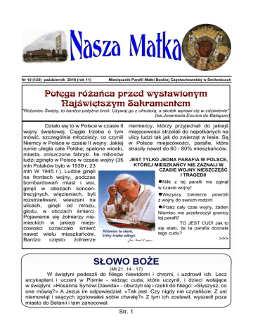 Nr 10 (120) październik 2016 (rok 11) Miesięcznik Parafii Matki Boskiej Częstochowskiej w Śmiłowicach Potęga różańca przed wystawionym Najświętszym Sakramentem "Różaniec Święty, to bardzo potężna broń. Używaj go z ufnością, a skutek wprawi cię w zdziwienie" (św.Josemaria Escriva do Balaguer) Działo się to w Polsce w czasie II wojny światowej. Ciągle trzeba o tym mówić, szczególnie młodzieży, co czynili Niemcy w Polsce w czasie II wojny. Jakiej ruinie uległa cała Polska; spalone wioski, miasta, zniszczone fabryki. Ile milionów ludzi zginęło w Polsce w czasie wojny (35 mln Polaków było w 1939 r. 23 mln W 1945 r.). Ludzie ginęli na frontach wojny, podczas bombardowań miast i wsi, ginęli w obozach koncentracyjnych, więzieniach, byli rozstrzeliwani, wieszani na ulicach, ginęli od mrozu, głodu, w obozach śmierci. Pojawienie się żołnierzy niemieckich w jakiejś miejscowości oznaczało śmierć nawet wielu mieszkańców. Bardzo często żołnierze niemieccy, którzy przyjechali do jakiejś miejscowości strzelali do napotkanych na ulicy ludzi tak jak do zwierząt w lesie. Są w Polsce miejscowości, parafie, które straciły nawet do 60 - 80% mieszkańców. JEST TYLKO JEDNA PARAFIA W POLSCE, KTÓREJ MIESZKAŃCY NIE ZAZNALI W CZASIE WOJNY NIESZCZĘŚĆ I TRAGEDII ●Nikt z tej parafii nie zginął w czasie wojny! ●Wszyscy żołnierze powróili z wojny do swoich rodzin! ●Przez cały czas wojny, żaden Niemiec nie przekroczył granicy tej parafii! TO JEST CUD! Jak to się stało, że ta parafia doznała tego cudu? >>> SŁOWO BOŻE (Mt 21, 14 - 17) W świątyni podeszli do Niego niewidomi i chromi, i uzdrowił ich. Lecz arcykapłani i uczeni w Piśmie - widząc cuda, które uczynił, i dzieci wołające w świątyni: «Hosanna Synowi Dawida» - oburzyli się i rzekli do Niego: «Słyszysz, co one mówią?» A Jezus im odpowiedział: «Tak jest. Czy nigdy nie czytaliście: Z ust niemowląt i ssących zgotowałeś sobie chwałę?» Z tym ich zostawił, wyszedł poza miasto do Betanii i tam zanocował. Str. 1 Parafia ta nazywa się Garnek. Leży w centrum Polski, około 70 km od Warszawy. W 1939 r. liczyła 7 tys. mieszkańcó. Dnia 1.IX. 1939 r. gdy Niemcy zaatakowały Polskę w parafii proboszczem był bardzo mądry i pobożny kapłan. W tym tragicznym dniu w tamtejszym kościele zgromadziło się trochę ludzi na Mszy świętej. Był to pierwszy piątek miesiąca. Proboszcz do zgromadzonych w kościele ludzi powiedział wtedy takie słowa: Dziś Niemcy pod wodzą Hitlera zaatakowały Polskę. Hitler to człowiek opętany przez szatana. Hitler wyrządzi straszliwe zło Polsce i całej Europie. Zginą miliony ludzi, Europa ulegnie wielkiemu zniszczeniu. Czy jest jakiś ratunek? Czy możemy uniknąć śmierci, uratować nasze domy, gospodarstwa, zakłady pracy? Tak, jest ratunek! Tym ratunkiem jest różaniec przed wystawionym w monstrancji Najświętszym Sakramentem! Od dzisiaj, aż do końca wojny, (nie wiemy ile będzie trwać ta wojna), każdego dnia w naszym kościele będzie odmawiany Róaniec przed wystawionym Najświętszym Sakramentem. Zapraszam wszystkich każdego dnia na to nabożeństwo. Wojna trwała 6 lat, Róaniec w kościele trwał 6 lat. Proboszcz podał ludziom godz. nabożeństwa. Na to nabożeństwo ludzie zaczęli przychodzić. Odmawiali cząstkę Różańca (5 tajemnic) po Różańcu proboszcz udzielał błogosławieństwa Najświętszym Sakramentem. Początkowo ludzi było niewiele, ale w miarę upływu wojny przychodziło coraz więcej. Kościół codziennie był zapełniony ludźmi. Gdy spostrzeżono, jaka jest potęga tego nabożeństwa, tzn. że nikt z tej parafii nie zginął (w innych zginęło już wielu), na Różaniec codziennie gromadziło się tyle ludzi, że kościół nie mógł wszystkich pomieścić! Nie było w Polsce miejscowości, do której by nie dotarli żołnierze niemieccy w czasie wojny. Nawet do najdalej położonych wiosek, 300, 400 km od Warszawy. Docierali nawet do tych wiosek, które nie miały szosy (dojeżdżali końmi), a ta parafia jest w centrum Polski, tak blisko Warszawy. A więc: JAK WIELKA JEST POTĘGA MODLITWY RÓŻAŃCOWEJ W KOŚCIELE PRZED WYSTAWIONYM NAJŚWIĘTSZYM SAKRAMENTEM! Z tej parafii przed IX 1939 r. wielu młodych mężczyzn zostało zmobilizowanych do wojska. Jedni walczyli (we wrześniu 1939 r.) z Niemcami, inni z Rosjanami. Nikt z nich nie zginął na froncie! Część z nich wróciła do domów po ustaniu walk, część dostała się do niewoli. Jedni byli w obozach niemieckich, inni w rosyjskich, również na dalekiej Syberii. Wszyscy powróili do swoich rodzin! A więc cudowną opieką modlitwy zostali otoczeni żołnierze z tej parafii, któży byli nawet kilkanaście tys. km od niej (Syberia). Jak to wszystko zrozumieć? Jak to wszystko wytłumaczyć? Można stwierdzić z całą pewnością, że Różaniec w kościele przed wystawionym w monstrancji Najświętszym Sakramentem jest wielką potęgą. Okazał się silniejszy, niż wszystkie bomby, czołgi, armaty, karabiny maszynowe itp. Silniejszy niż cała potęga hitlerowskich Niemiec. Czy tylko w czasie wojny? A czy dziś nie ma już tej samej mocy, potęgi, skuteczności w innych dziedzinach ludzkiej egzystencji? Wstępną informację podał +ks. Bp Zbigniew Kraszewski na spotkaniu Kapłańskiego Ruchu Maryjnego. "Różaniec to Credo, które stało się modlitwą" (bł.John Henry Newman). Str. 2 Źródło: http://adonai.pl Święci znani i nieznani Święta Jadwiga Śląska (16 października) Jadwiga urodziła się między 1174 a 1180 rokiem na zamku nad jeziorem Amer w Bawarii jako córka hrabiego Bertolda VI i Agnieszki Wettyńskiej, hrabiów Andechs, którzy tytułowali się również książętami Meranu (w północnej Dalmacji) i margrabiami Istrii. Miała czterech braci i trzy siostry. Jedną wydano za Filipa, króla Francji, drugą za Andrzeja, króla Węgier (była matką św. Elżbiety), trzecia wstąpiła 