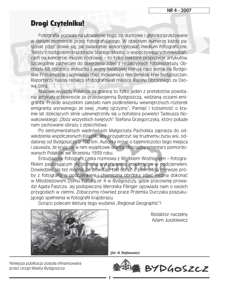 NR 4 - 2007 Drogi Czytelniku! Fotografia pozwala na utrwalenie tego, co duchowe i głęboko przeżywane w danym momencie przez fotografującego. W obecnym numerze każdy pasjonat zdjęć dowie się, jak świadomie wykorzystywać medium fotograficzne. Teksty o bydgoskim krajobrazie Starego Miasta, o wypoczywających mieszkańcach na koncercie muzyki rockowej – to tylko niektóre propozycje artykułów. Szczególnie zachęcam do obejrzenia zdjęć z redakcyjnych fotoreportaży. Obchody 68. rocznicy wybuchu II wojny światowej kierują nasz wzrok na Bydgoskie Przedmoście i wzmagają chęć mówienia o męczeńskiej krwi bydgoszczan. Reporterzy naszej redakcji sfotografowali miejsce Rejonu Obronnego za Osową Górą. Masowe wyjazdy Polaków za granicę to tylko jeden z pretekstów powstania artykułu o tęsknocie za przedwojenną Bydgoszczą, widzianą oczami emigranta. Przede wszystkim zależało nam podkreśleniu wewnętrznych rozterek emigranta wyrwanego ze swej „małej ojczyzny”. Pamięć i tożsamość o krainie lat dziecięcych silnie uzewnętrzniły się u bohatera powieści Tadeusza Nowakowskiego „Obóz wszystkich świętych” Stefana Grzegorczyka, który pokaże nam zachowane obrazy z dzieciństwa. Po sentymentalnych wędrówkach Małgorzata Pacholska zaprasza do odwiedzenia współczesnych Książek, aby przypatrzyć się trudnemu życiu wsi, oddalonej od Bydgoszczy o 100 km. Autorka mówi o tajemniczości tego miejsca i zauważa, że kryją się w nim wyjątkowe skarby, chociażby cmentarz pomordowanych Polaków we wrześniu 1939 roku. Entuzjastów fotografii czeka rozmowa z Wojtkiem Woźniakiem – fotografikiem pasjonującym się techniką wykonywania krajobrazów w podczerwieni. Dowiedzieć się też można, jak powstaje taki obraz. Z pewnością pierwsze próby z fotografią w podczerwieni i chemiczną obróbką zdjęć można dokonać w Młodzieżowym Domu Kultury nr 4 w Bydgoszczy, gdzie pracownię prowadzi Agata Faszcza. Jej podopieczna Weronika Filinger opowiada nam o swoich przygodach w ciemni. Zobaczymy również prace Przemka Durczaka poszukującego spełnienia w fotografii krajobrazu. Gorąco polecam lekturę tego wydania „Regional Geographic”! Redaktor naczelny Adam Juszkiewicz (fot. N. Stefanowicz) Niniejsza publikacja została sfinansowana przez Urząd Miasta Bydgoszczy. 1 NR 4 - 2007 Grzegorz Popek W numerze: Doceń swój region Przedmoście ........................................................................ 4 Oczami bydgoskiego emigranta ...................................... 9 W objęciach natury ......................................................... 14 Nowy Jasiniec ................................................................. 20 Wywiad z Wojciechem Woźniakiem .............................. 24 Cyfrowa ciemnia - za darmo .......................................... 28 Książki .............................................................................. 32 Zdjęcia na okładce: Przemysław Durczak (I), Kamil Wakuła (IV). Streszczenia w języku angielskim: Paulina Tomaszewska. Stopka redakcyjna: Adres redakcji: Bydgoszcz; ul. Powstańców Wielkopolskich 34, tel. 052 3460 421 Redaktor naczelny: Adam Juszkiewicz (0 504 560 499); e-mail: [email protected] Zastępca redaktora naczelnego: Marcin Wasilewski, e-mail: [email protected] Sekretarz redakcji: Korekta: Edytor zdjęć: Plastyka: Wydawca: Skład i druk: Natalia Stefanowicz (0 504 455 260), e-mail: [email protected] Emilia Glugla Kamil Wakuła Mikołaj Górski Stowarzyszenie „Juvenkracja”, www.juvenkracja.pl; www.RegionalGeographic.pl PPU MULTIGRAF s.c. R. Ellert, J. Tomczuk, 85-135 Bydgoszcz, ul. Bielicka 76 C tel./fax 052 340 41 37, 0 661 152 708; www.multigrafdruk.pl Redakcja zastrzega sobie dokonywanie skrótów, redagowania tekstów, adiustacji, zmiany tytułów i publikowania ich na stronach internetowych. Redakcja nie publikuje materiałów nie zamówionych oraz ich nie zwraca. © Copyright by Stowarzyszenie „Juvenkracja”. 2 Chodzimy pieszo, nawet jeśli droga jest kręta i piaszczysta. Jedziemy rowerem, mimo że żar leje się z nieba i ciągle jest pod górkę. Łapiemy stopa, chociaż nie zawsze wiemy, gdzie nas wyrzuci. Wsiadamy w pociąg, nie mając pewności, czy zdążymy na powrotny. W końcu ładujemy się do naszego redakcyjnego samochodu ufając, że starczy benzyny w dwie strony. Taka jest nasza rola. Docieramy tam, gdzie na dystansie nierównego asfaltu może się schować perła architektury. Idziemy przez rozległe pola, aby ostatecznie stanąć oko w oko z siłami przyrody. Przedzieramy się przez tłoczne ulice, wymijamy ruchliwe auta, wspinamy się na pagórki i schodzimy w doliny. I zawsze mamy ze sobą aparat lub kartkę papieru. Wszystko po to, aby uwiecznić piękno rodzimego krajobrazu. Uchwycić chwilę w kadrze lub po prostu dać rzeczy słowo. Staramy się pokazać, że nasze najbliższe okolice też są godne uwagi. Słuchamy, co mówią mieszkańcy odwiedzanych miast i wsi, obserwujemy, jak toczy się ich życie. A ty? Jak spędzasz wolny czas? Czy też lubisz wycieczki i poszukiwania? A może siedząc w fotelu, wolisz poczytać o odkryciach innych i popatrzeć ich oczami na otaczający świat? To też jest sposób. Nie mów jednak, że u nas nie ma się czym zachwycać. Nie przekonuj, że nie warto poświęcić czasu na refleksję. Nie udawaj, że nie widzisz innych ludzi, ich radości i zmartwień. Doceń swój region, jego przyrodę, architekturę i mieszkańców. Możesz zrobić to osobiście lub wspierając nasze działania. Może nawet gdzieś w szufladzie lub komputerze gromadzisz ciekawe zdjęcia lokalnego krajobrazu, zabytków. Przyślij je nam, a być może opublikujemy je w następnym nume- rze. Zapraszamy też do zamówienia prenumeraty naszego dwumiesięcznika, o której więcej piszemy na naszej stronie internetowej. Jeśli chcesz osobiście się z nami spotkać, wstąp do redakcji, a na pewno poświęcimy ci czas i uwagę. I prz