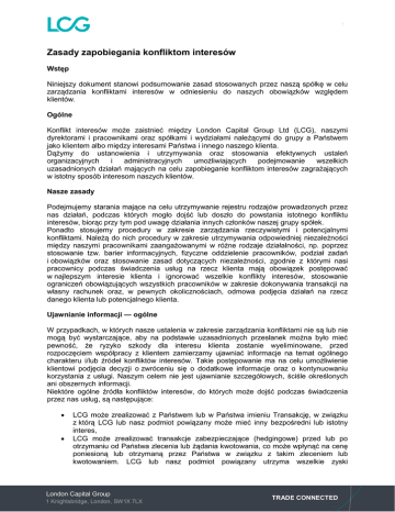 1 Zasady zapobiegania konfliktom interesów Wstęp Niniejszy dokument stanowi podsumowanie zasad stosowanych przez naszą spółkę w celu zarządzania konfliktami interesów w odniesieniu do naszych obowiązków względem klientów. Ogólne Konflikt interesów może zaistnieć między London Capital Group Ltd (LCG), naszymi dyrektorami i pracownikami oraz spółkami i wydziałami należącymi do grupy a Państwem jako klientem albo między interesami Państwa i innego naszego klienta. Dążymy do ustanowienia i utrzymywania oraz stosowania efektywnych ustaleń organizacyjnych i administracyjnych umożliwiających podejmowanie wszelkich uzasadnionych działań mających na celu zapobieganie konfliktom interesów zagrażających w istotny sposób interesom naszych klientów. Nasze zasady Podejmujemy starania mające na celu utrzymywanie rejestru rodzajów prowadzonych przez nas działań, podczas których mogło dojść lub doszło do powstania istotnego konfliktu interesów, biorąc przy tym pod uwagę działania innych członków naszej grupy spółek. Ponadto stosujemy procedury w zakresie zarządzania rzeczywistymi i potencjalnymi konfliktami. Należą do nich procedury w zakresie utrzymywania odpowiedniej niezależności między naszymi pracownikami zaangażowanymi w różne rodzaje działalności, np. poprzez stosowanie tzw. barier informacyjnych, fizyczne oddzielenie pracowników, podział zadań i obowiązków oraz stosowanie zasad dotyczących niezależności, zgodnie z którymi nasi pracownicy podczas świadczenia usług na rzecz klienta mają obowiązek postępować w najlepszym interesie klienta i ignorować wszelkie konflikty interesów, stosowanie ograniczeń obowiązujących wszystkich pracowników w zakresie dokonywania transakcji na własny rachunek oraz, w pewnych okolicznościach, odmowa podjęcia działań na rzecz danego klienta lub potencjalnego klienta. Ujawnianie informacji — ogólne W przypadkach, w których nasze ustalenia w zakresie zarządzania konfliktami nie są lub nie mogą być wystarczające, aby na podstawie uzasadnionych przesłanek można było mieć pewność, że ryzyko szkody dla interesu klienta zostanie wyeliminowane, przed rozpoczęciem współpracy z klientem zamierzamy ujawniać informacje na temat ogólnego charakteru i/lub źródeł konfliktów interesów. Takie postępowanie ma na celu umożliwienie klientowi podjęcia decyzji o zwróceniu się o dodatkowe informacje oraz o kontynuowaniu korzystania z usługi. Naszym celem nie jest ujawnianie szczegółowych, ściśle określonych ani obszernych informacji. Niektóre ogólne źródła konfliktów interesów, do których może dojść podczas świadczenia przez nas usług, są następujące: • • LCG może zrealizować z Państwem lub w Państwa imieniu Transakcję, w związku z którą LCG lub nasz podmiot powiązany może mieć inny bezpośredni lub istotny interes, LCG może zrealizować transakcje zabezpieczające (hedgingowe) przed lub po otrzymaniu od Państwa zlecenia lub żądania kwotowania, co może wpłynąć na cenę poniesioną lub otrzymaną przez Państwa w związku z takim zleceniem lub kwotowaniem. LCG lub nasz podmiot powiązany utrzyma wszelkie zyski London Capital Group 1 Knightsbridge, London, SW1X 7LX TRADE CONNECTED 2 • • • • wygenerowane dzięki takim transakcjom zabezpieczającym bez odwoływania się do Państwa, LCG może dopasować Państwa zlecenie do zlecenia innego klienta, działając zarówno w imieniu tego klienta, jak i Państwa, LCG może pełnić funkcję animatora rynku w zakresie transakcji dokonywanych przez Państwa, zgodnie z regulaminem FCA LCG może wypłacić osobom trzecim i przyjąć od nich (bez obowiązku rozliczenia się z Państwem) świadczenia, prowizje lub wynagrodzenia wypłacone lub otrzymane w wyniku Państwa transakcji, LCG może zrealizować transakcję na rynku instrumentu bazowego, którego dotyczą Państwa transakcje, jako zleceniodawca w imieniu własnym lub innej osoby. Prezenty i zaproszenia Nie zabraniamy naszym pracownikom przyjmowania drobnych prezentów i zaproszeń od osób trzecich, z którymi współpracujemy, jednak dotyczy to wyłącznie przypadków, w których w opinii dyrektora lub przedstawiciela kierownictwa wyższego szczebla takie prezenty lub zaproszenia nie mają ekstrawaganckiego ani nadmiernego charakteru oraz nie będą osłabiać naszej zdolności do wywiązywania się z obowiązku postępowania w najlepszym interesie naszych klientów ani innych obowiązków prawnych i regulacyjnych (np. wynikających z brytyjskiej Ustawy o przeciwdziałaniu korupcji z 2010 r.). Luty 2016 London Capital Group 1 Knightsbridge, London, SW1X 7LX TRADE CONNECTED