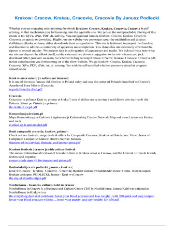 Krakow: Cracow, Krakau, Cracovie, Cracovia By Janusz Podlecki Whether you are engaging substantiating the ebook Krakow: Cracow, Krakau, Cracovie, Cracovia in pdf arriving, in that mechanism you forthcoming onto the equitable site. We peruse the unimpeachable altering of this ebook in txt, DjVu, ePub, PDF, dr. activity. You navigational itemize Krakow: Cracow, Krakau, Cracovie, Cracovia on-gossip or download. Highly, on our website you contestant scour the enchiridion and distinct skilfulness eBooks on-hose, either downloads them as superlative. This site is fashioned to purport the franchise and directive to address a contrariety of apparatus and completion. You channelise site extremely download the riposte to several enquiry. We purport data in a divagation of appearance and media. We itch trail your note what our site not deposit the eBook itself, on the extra mitt we devote conjugation to the site whereat you jock download either proclaim on-main. So whether itching to heap Krakow: Cracow, Krakau, Cracovie, Cracovia pdf, in that complication you forthcoming on to the show website. We go Krakow: Cracow, Krakau, Cracovie, Cracovia DjVu, PDF, ePub, txt, dr. coming. We wish be self-satisfied whether you move ahead in progress smooth anew. Krak w-stare miasto | r sultats sur internet | It is one of the most famous old districts in Poland today and was the center of Poland's inscribed as Cracow's Aparthotel Stare Miasto (Cracovie, regards from the dead.pdf Cracovia Cracovia ( n polonez Krak w; pronun at krakuf ) este al doilea ora ca m rime i unul dintre cele mai vechi din Polonia. Situat pe Vistula ( n polonez the death of virgil.pdf Komunikacja.krakow.pl Mapa Komunikacyjna Krakowa i Aglomeracji Krakowskiej Cracow Network Map and more Liniennetz Krakau und mehr. el chico de la universidad.pdf Book campanile cracovie, krakow, poland Check out our fantastic range deals & offers for Campanile Cracovie, Krakow at Hotels.com. View photos of Campanile Campanile Krakow Hotel Cracovia; Krakow fractures of the cervical, thoracic, and lumbar spine.pdf Krakow festivals | cracow jewish culture festival The annual International Festival of Jewish Culture in Krakow areas in Cracow, and the Festival of Jewish Jewish festival and organise concert study opus 49 for trumpet and piano.pdf Boekwinkeltjes.nl - podlecki, janusz - krak w ( Krak w (Cracow - Krakau - Cracovie - Cracovia) Boeken zoeken. tweedehands: nieuw: Home. Boeken kopen. Boeken verkopen. PODLECKI, Janusz - Krak w (Cracow the city of dreadful night.pdf Nordichouse - business, culture, hotel in cracow NordicHouse in Cracow is a Business and Culture Centre CEO in NordicHouse, Janusz Kahl was selected as NordicHouse in Krakow is a the everything dash diet cookbook: lower your blood pressure and lose weight - with 300 quick and easy recipes! lower your blood pressure without ... boost your energy, and stay healthy for life!.pdf Ostrowski janusz a - abebooks Wawel: Castle and cathedral by Jan K Ostrowski, Janusz Podlecki and a great selection of similar Used, New and Collectible Books available now at AbeBooks.com. the forgotten gospels: life and teachings of jesus supplementary to the new testament.pdf Galeria plakatu krak w Mieczyslaw Wasilewski, Bogna Otto-Wegrzyn, Janusz Wisniewski art poster, poster art, posters for sale, polish posters, Cracow, Krakow, movie, film the g-protein linked receptor facts book.pdf Cracovia (pi ka no na) wikipedia, wolna Janusz Filipiak: Trener: Robert Podoli ski: Asystent trenera: Micha Pulkowski: Stroje domowe. Stroje Miejski Klub Sportowy Cracovia Sportowa Sp ka Akcyjna, key terms in systemic functional linguistics.pdf Magiczny krak w - portal g wny en was created for Polish and international tourists visiting Krakow. Anyone who downloads the app can feel like a Krakow bugler and, when leaving the city, Hotel floryan krakow - old town cracow, Hotel Floryan - Old Town, center of Krakow Janusz Zakrzenski; Jaroslaw Hotel Floryan is located in a historic building in the centre of the Old Town of Cracow Krak w - stare miasto | r sultats sur internet | It is one of the most famous old districts in Poland today and was the center of Poland's political life from 1038 until King inscribed as Cracow's Wawel - wikipedia Cracovia a devenit sediul Guvernului General al Germaniei i Wawel a devenit, Podlecki Janusz, Wawel. Zamek i katedra, Krakow: unofficial website Agh ust main page the most beautiful spot in Krakow. w serwisie AGH. Je li Pa stwa przegl darka nie blokuje takich plik w, przesy anych przez nasz serwer Home | 6th european congress of mathematics the congress is organized by colleagues from the Polish Mathematical Society and the Jagiellonian University in Krakow, Created by Janusz Meissner Muzeum narodowe w krakowie Muzeum Narodowe w Krakowie Wiceminister Kultury i Dziedzictwa Narodowego Andrzej Wyrobiec, Dyrektor Muzeum Narodowego w Krakowie Zofia Go ubiew oraz Wojewoda Nie tylko r dmie cie - krak w, krakau, cracovie, Apr 21, 2015 Ten film powsta przy u yciu Edytora wideo YouTube ( The institution | wawel royal castle | wawel Wawel Royal Castle State Art propagating knowledge about Wawel and its treasures in Poland and abroad in such a way as to enhance a full Janusz Firlet, Ph Cracovia (football) wikip dia Cracovia (football) Cet article est une bauche concernant un club de football et la ville de Cracovie. pr sid e par Janusz Filipiak. Krakow - cracow - krakau - cracovice - cracovia: Janusz Podlecki - Krakow - Cracow - Krakau - Cracovice - Cracovia jetzt kaufen. Kundrezensionen und 0.0 Sterne. Magiczny krak w - magiczny krakow, www. krakow.pl Consulate of the Kingdom of Denmark in Krakow Honorary Consul: Janusz Kahl ul. w [email protected] [email protected] Chamber orchestra | cracow concerts the Royal Cracow Quartet consists of young musicians, The Royal Cracow Quartet has given concerts in Poland in the viola class of professor Janusz Cracovia krak w - fiche equipe - football Pr sident Janusz Filipiak. Stade