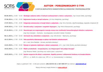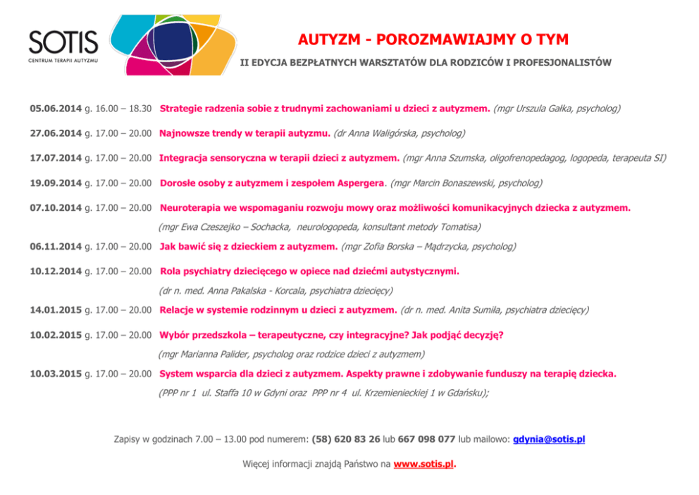 AUTYZM - POROZMAWIAJMY O TYM II EDYCJA BEZPŁATNYCH WARSZTATÓW DLA RODZICÓW I PROFESJONALISTÓW 05.06.2014 g. 16.00 – 18.30 Strategie radzenia sobie z trudnymi zachowaniami u dzieci z autyzmem. (mgr Urszula Gałka, psycholog) 27.06.2014 g. 17.00 – 20.00 Najnowsze trendy w terapii autyzmu. (dr Anna Waligórska, psycholog) 17.07.2014 g. 17.00 – 20.00 Integracja sensoryczna w terapii dzieci z autyzmem. (mgr Anna Szumska, oligofrenopedagog, logopeda, terapeuta SI) 19.09.2014 g. 17.00 – 20.00 Dorosłe osoby z autyzmem i zespołem Aspergera. (mgr Marcin Bonaszewski, psycholog) 07.10.2014 g. 17.00 – 20.00 Neuroterapia we wspomaganiu rozwoju mowy oraz możliwości komunikacyjnych dziecka z autyzmem. (mgr Ewa Czeszejko – Sochacka, neurologopeda, konsultant metody Tomatisa) 06.11.2014 g. 17.00 – 20.00 Jak bawić się z dzieckiem z autyzmem. (mgr Zofia Borska – Mądrzycka, psycholog) 10.12.2014 g. 17.00 – 20.00 Rola psychiatry dziecięcego w opiece nad dziećmi autystycznymi. (dr n. med. Anna Pakalska - Korcala, psychiatra dziecięcy) 14.01.2015 g. 17.00 – 20.00 Relacje w systemie rodzinnym u dzieci z autyzmem. (dr n. med. Anita Sumiła, psychiatra dziecięcy) 10.02.2015 g. 17.00 – 20.00 Wybór przedszkola – terapeutyczne, czy integracyjne? Jak podjąć decyzję? (mgr Marianna Palider, psycholog oraz rodzice dzieci z autyzmem) 10.03.2015 g. 17.00 – 20.00 System wsparcia dla dzieci z autyzmem. Aspekty prawne i zdobywanie funduszy na terapię dziecka. (PPP nr 1 ul. Staffa 10 w Gdyni oraz PPP nr 4 ul. Krzemienieckiej 1 w Gdańsku); Zapisy w godzinach 7.00 – 13.00 pod numerem: (58) 620 83 26 lub 667 098 077 lub mailowo: [email protected] Więcej informacji znajdą Państwo na www.sotis.pl.