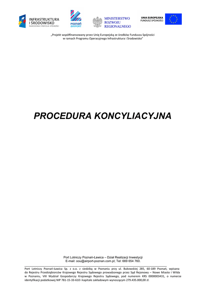 „Projekt współfinansowany przez Unię Europejską ze środków Funduszu Spójności w ramach Programu Operacyjnego Infrastruktura i Środowisko” PROCEDURA KONCYLIACYJNA Port Lotniczy Poznań-Ławica – Dział Realizacji Inwestycji E-mail: [email protected]; Tel: 669 654 760. __________________________________________________________________________ Port Lotniczy Poznań-Ławica Sp. z o.o. z siedzibą w Poznaniu przy ul. Bukowskiej 285, 60-189 Poznań, wpisana do Rejestru Przedsiębiorców Krajowego Rejestru Sądowego prowadzonego przez Sąd Rejonowy – Nowe Miasto i Wilda w Poznaniu, VIII Wydział Gospodarczy Krajowego Rejestru Sądowego, pod numerem KRS 0000003431, o numerze identyfikacji podatkowej NIP 781-15-33-610 i kapitale zakładowym wynoszącym 279.435.000,00 zł. „Projekt współfinansowany przez Unię Europejską ze środków Funduszu Spójności w ramach Programu Operacyjnego Infrastruktura i Środowisko” Poznań, dnia 22 marca 2012r. Słowniczek: OOU – obszar ograniczonego użytkowania przewidziany przepisami ustawy z dnia 27 kwietnia 2001r. Prawo ochrony środowiska (Dz.U.2008.25.150 z późniejszymi zmianami), oraz wprowadzony uchwałą Sejmiku Województwa Wielkopolskiego z dnia 30.01.2012r. wokół Portu Lotniczego Ławica w Poznaniu, Uchwała o utworzeniu OOU – uchwała Sejmiku Województwa Wielkopolskiego z dnia 30.01.2012 r. ogłoszona w dzienniku urzędowym Województwa Wielkopolskiego w dniu 14 lutego 2012 poz. 961 w przedmiocie utworzenia wokół Portu Lotniczego Ławica w Poznaniu obszaru ograniczonego użytkowania na podstawie przepisów ustawy z dnia 27 kwietnia 2001r. Prawo ochrony środowiska (Dz.U.2008.25.150 z późniejszymi zmianami), Właściciel – właściciel, użytkownik wieczysty oraz podmiot, któremu przysługuje prawo rzeczowe do nieruchomości położonej w OOU utworzonym wokół Portu Lotniczego Ławica, Ustawa – ustawa z dnia 27 kwietnia 2001r. Prawo ochrony środowiska (Dz.U.2008.25.150 z późniejszymi zmianami), PL Poznań-Ławica – Port Lotniczy Poznań- Ławica Sp. z o.o. z siedzibą w Poznaniu, Procedura – niniejsza procedura koncyliacyjna, Modernizacja Akustyczna Nieruchomości – forma wypłaty przez PL Poznań- Ławica obowiązkowego odszkodowania z tytułu ustanowienia OOU i ustanowienia na nim wymagań technicznych dotyczących budynków, poprzez dokonanie nakładów na budynki mieszkalne oraz szpitale, domy opieki społecznej jak i budynki związane ze stałym lub czasowym pobytem dzieci i młodzieży. Wypłata odszkodowania dotyczyć będzie budynków posadowionych na nieruchomościach objętych uchwałą o utworzeniu OOU, w przypadku zawarcia z Właścicielem ugody na warunkach określonych w niniejszej procedurze w celu ograniczenia przenikającego do wnętrza budynków hałasu lotniczego do poziomu przewidzianego w Polskiej Normie PN 87B-02151/02 . Port Lotniczy Poznań-Ławica – Dział Realizacji Inwestycji E-mail: [email protected]; Tel: 669 654 760. __________________________________________________________________________ Port Lotniczy Poznań-Ławica Sp. z o.o. z siedzibą w Poznaniu przy ul. Bukowskiej 285, 60-189 Poznań, wpisana do Rejestru Przedsiębiorców Krajowego Rejestru Sądowego prowadzonego przez Sąd Rejonowy – Nowe Miasto i Wilda w Poznaniu, VIII Wydział Gospodarczy Krajowego Rejestru Sądowego, pod numerem KRS 0000003431, o numerze identyfikacji podatkowej NIP 781-15-33-610 i kapitale zakładowym wynoszącym 279.435.000,00 zł. „Projekt współfinansowany przez Unię Europejską ze środków Funduszu Spójności w ramach Programu Operacyjnego Infrastruktura i Środowisko” Preambuła Celem opracowania i wdrożenia procedury jest ugodowe oraz możliwie szybkie wypłacenie, w formie Modernizacji Akustycznej Nieruchomości, odszkodowań na rzecz właścicieli nieruchomości objętych uchwałą o utworzeniu wokół Portu Lotniczego Poznań-Ławica Sp. z o.o. obszaru ograniczonego użytkowania. Procedura koncyliacyjna 1. Poinformowanie właścicieli nieruchomości położonych w OOU o utworzeniu obszaru i ewentualnych ograniczeniach w zakresie przeznaczenia nieruchomości, sposobach korzystania z nieruchomości oraz wymaganiach technicznych budynków. 1.1. Treścią informacji ogólnej będzie przede wszystkim: • fakt utworzenia wokół PL Poznań-Ławica OOU, • rodzaj i zakres prowadzonych aktualnie w PL Poznań-Ławica inwestycji oraz ich skutków dla PL Poznań-Ławica oraz regionu, • wyjaśnienie pojęcia obszaru ograniczonego użytkowania oraz potrzeby jego utworzenia wokół PL Poznań-Ławica w kontekście rekompensowania Właścicielom niedogodności wynikających z ponadnormatywnej emisji hałasu lotniczego, • fakt prowadzenia ciągłego monitoringu poziomu hałasu lotniczego wokół PL Poznań-Ławica, • poinformowanie, iż PL Poznań-Ławica zamierza rekompensować w uzasadnionych przypadkach właścicielom nieruchomości położonych w OOU niedogodności związane z hałasem lotniczym poprzez przeprowadzanie Modernizacji Akustycznej Nieruchomości, • fakt wdrożenia przez PL Poznań-Ławica procedury zaspokajania roszczeń właścicieli nieruchomości położonych w OOU, a związanych z hałasem lotniczym, Port Lotniczy Poznań-Ławica – Dział Realizacji Inwestycji E-mail: [email protected]; Tel: 669 654 760. __________________________________________________________________________ Port Lotniczy Poznań-Ławica Sp. z o.o. z siedzibą w Poznaniu przy ul. Bukowskiej 285, 60-189 Poznań, wpisana do Rejestru Przedsiębiorców Krajowego Rejestru Sądowego prowadzonego przez Sąd Rejonowy – Nowe Miasto i Wilda w Poznaniu, VIII Wydział Gospodarczy Krajowego Rejestru Sądowego, pod numerem KRS 0000003431, o numerze identyfikacji podatkowej NIP 781-15-33-610 i kapitale zakładowym wynoszącym 279.435.000,00 zł. „Projekt współfinansowany przez Unię Europejską ze środków Funduszu Spójności w ramach Programu Operacyjnego Infrastruktura i Środowisko” 