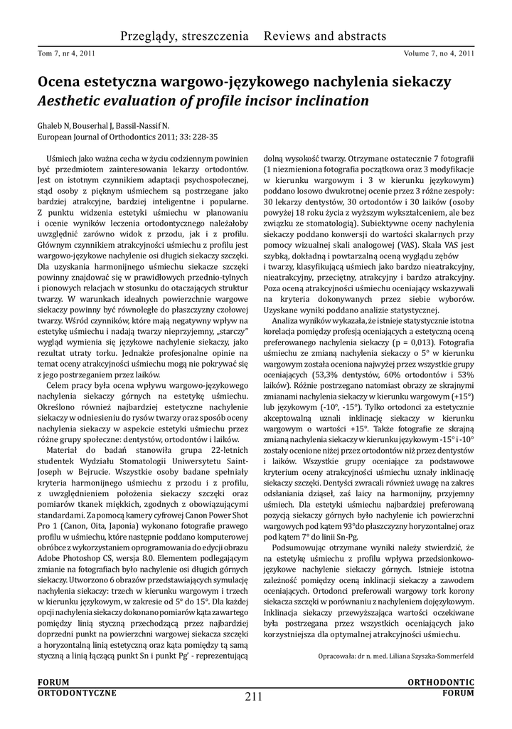Przeglądy, streszczenia Tom 7, nr 4, 2011 Reviews and abstracts Volume 7, no 4, 2011 Ocena estetyczna wargowo-językowego nachylenia siekaczy Aesthetic evaluation of profile incisor inclination Ghaleb N, Bouserhal J, Bassil-Nassif N. European Journal of Orthodontics 2011; 33: 228-35 Uśmiech jako ważna cecha w życiu codziennym powinien być przedmiotem zainteresowania lekarzy ortodontów. Jest on istotnym czynnikiem adaptacji psychospołecznej, stąd osoby z pięknym uśmiechem są postrzegane jako bardziej atrakcyjne, bardziej inteligentne i popularne. Z punktu widzenia estetyki uśmiechu w planowaniu i ocenie wyników leczenia ortodontycznego należałoby uwzględnić zarówno widok z przodu, jak i z profilu. Głównym czynnikiem atrakcyjności uśmiechu z profilu jest wargowo-językowe nachylenie osi długich siekaczy szczęki. Dla uzyskania harmonijnego uśmiechu siekacze szczęki powinny znajdować się w prawidłowych przednio-tylnych i pionowych relacjach w stosunku do otaczających struktur twarzy. W warunkach idealnych powierzchnie wargowe siekaczy powinny być równoległe do płaszczyzny czołowej twarzy. Wśród czynników, które mają negatywny wpływ na estetykę uśmiechu i nadają twarzy nieprzyjemny, „starczy” wygląd wymienia się językowe nachylenie siekaczy, jako rezultat utraty torku. Jednakże profesjonalne opinie na temat oceny atrakcyjności uśmiechu mogą nie pokrywać się z jego postrzeganiem przez laików. Celem pracy była ocena wpływu wargowo-językowego nachylenia siekaczy górnych na estetykę uśmiechu. Określono również najbardziej estetyczne nachylenie siekaczy w odniesieniu do rysów twarzy oraz sposób oceny nachylenia siekaczy w aspekcie estetyki uśmiechu przez różne grupy społeczne: dentystów, ortodontów i laików. Materiał do badań stanowiła grupa 22-letnich studentek Wydziału Stomatologii Uniwersytetu SaintJoseph w Bejrucie. Wszystkie osoby badane spełniały kryteria harmonijnego uśmiechu z przodu i z profilu, z uwzględnieniem położenia siekaczy szczęki oraz pomiarów tkanek miękkich, zgodnych z obowiązującymi standardami. Za pomocą kamery cyfrowej Canon Power Shot Pro 1 (Canon, Oita, Japonia) wykonano fotografie prawego profilu w uśmiechu, które następnie poddano komputerowej obróbce z wykorzystaniem oprogramowania do edycji obrazu Adobe Photoshop CS, wersja 8.0. Elementem podlegającym zmianie na fotografiach było nachylenie osi długich górnych siekaczy. Utworzono 6 obrazów przedstawiających symulację nachylenia siekaczy: trzech w kierunku wargowym i trzech w kierunku językowym, w zakresie od 5° do 15°. Dla każdej opcji nachylenia siekaczy dokonano pomiarów kąta zawartego pomiędzy linią styczną przechodzącą przez najbardziej doprzedni punkt na powierzchni wargowej siekacza szczęki a horyzontalną linią estetyczną oraz kąta pomiędzy tą samą styczną a linią łączącą punkt Sn i punkt Pg’ - reprezentującą dolną wysokość twarzy. Otrzymane ostatecznie 7 fotografii (1 niezmieniona fotografia początkowa oraz 3 modyfikacje w kierunku wargowym i 3 w kierunku językowym) poddano losowo dwukrotnej ocenie przez 3 różne zespoły: 30 lekarzy dentystów, 30 ortodontów i 30 laików (osoby powyżej 18 roku życia z wyższym wykształceniem, ale bez związku ze stomatologią). Subiektywne oceny nachylenia siekaczy poddano konwersji do wartości skalarnych przy pomocy wizualnej skali analogowej (VAS). Skala VAS jest szybką, dokładną i powtarzalną oceną wyglądu zębów i twarzy, klasyfikującą uśmiech jako bardzo nieatrakcyjny, nieatrakcyjny, przeciętny, atrakcyjny i bardzo atrakcyjny. Poza oceną atrakcyjności uśmiechu oceniający wskazywali na kryteria dokonywanych przez siebie wyborów. Uzyskane wyniki poddano analizie statystycznej. Analiza wyników wykazała, że istnieje statystycznie istotna korelacja pomiędzy profesją oceniających a estetyczną oceną preferowanego nachylenia siekaczy (p = 0,013). Fotografia uśmiechu ze zmianą nachylenia siekaczy o 5° w kierunku wargowym została oceniona najwyżej przez wszystkie grupy oceniających (53,3% dentystów, 60% ortodontów i 53% laików). Różnie postrzegano natomiast obrazy ze skrajnymi zmianami nachylenia siekaczy w kierunku wargowym (+15°) lub językowym (-10°, -15°). Tylko ortodonci za estetycznie akceptowalną uznali inklinację siekaczy w kierunku wargowym o wartości +15°. Także fotografie ze skrajną zmianą nachylenia siekaczy w kierunku językowym -15° i -10° zostały ocenione niżej przez ortodontów niż przez dentystów i laików. Wszystkie grupy oceniające za podstawowe kryterium oceny atrakcyjności uśmiechu uznały inklinację siekaczy szczęki. Dentyści zwracali również uwagę na zakres odsłaniania dziąseł, zaś laicy na harmonijny, przyjemny uśmiech. Dla estetyki uśmiechu najbardziej preferowaną pozycją siekaczy górnych było nachylenie ich powierzchni wargowych pod kątem 93°do płaszczyzny horyzontalnej oraz pod kątem 7° do linii Sn-Pg. Podsumowując otrzymane wyniki należy stwierdzić, że na estetykę uśmiechu z profilu wpływa przedsionkowojęzykowe nachylenie siekaczy górnych. Istnieje istotna zależność pomiędzy oceną inklinacji siekaczy a zawodem oceniających. Ortodonci preferowali wargowy tork korony siekacza szczęki w porównaniu z nachyleniem dojęzykowym. Inklinacja siekaczy przewyższająca wartości oczekiwane była postrzegana przez wszystkich oceniających jako korzystniejsza dla optymalnej atrakcyjności uśmiechu. Opracowała: dr n. med. Liliana Szyszka-Sommerfeld ForumOrthodontic Ortodontyczneforum 211