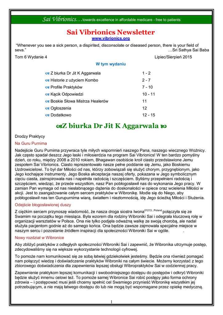 Sai Vibrionics…towards excellence in affordable medicare - free to patients Sai Vibrionics Newsletter www.vibrionics.org “Whenever you see a sick person, a dispirited, disconsolate or diseased person, there is your field of seva.” …Sri Sathya Sai Baba Lipiec/Sierpień 2015 Tom 6 Wydanie 4 W tym wydaniu Z biurka Dr Jit K Aggarwala 1-2 Historie z użyciem Kombo 2-7 Profile Praktyków 7 - 10 Kącik Odpowiedzi 10 - 11 Boskie Słowa Mistrza Healerów 11 Ogłoszenia 12 Dodatkowo 12 - 15 Z biurka Dr Jit K Aggarwala Drodzy Praktycy Na Guru Purnima Nadejście Guru Purnima przywraca tyle miłych wspomnień naszego Pana, naszego wiecznego Woźnicy. Jak często spadał deszcz Jego łaski i miłosierdzia na program Sai Vibrionics! W ten bardzo pomyślny dzień, co roku, między 2008 a 2010 rokiem, Bhagawan osobiście kroił ciasto przedstawione Jemu zespołem Sai Vibrionics. Ciasto reprezentowało nasze pełne poddanie się Jemu, jako Boskiemu Uzdrowicielowi. To był dar Miłości od nas, którzy zobowiązali się służyć chorym, przygnębionym, jako Jego kochające instrumenty. Jego Boska akceptacja naszej oferty, pokazana w Jego symbolicznym cięciu ciasta, zainspirowała nas i napełniła radością i szczęściem. Byliśmy przepełnieni radością i szczęściem, wiedząc, że przede wszystkim, nasz Pan pobłogosławił nas do wykonania Jego pracy. W zamian Pan wymaga od nas niesłabnącego dążenia do doskonałości w opiece oraz wcielenia Miłości w akcji. Jest to zaangażowanie całym sercem praktyków w Wibronikę. Modle się do Niego, aby pobłogosławił nas ten Gurupurnima wiarą, światłem i niezłomnością, idę Jego ścieżką Miłości i Służenia. Odejście błogosławionej duszy Z ciężkim sercem przynoszę wiadomość, że nasza droga siostra Iwona01213...Poland połączyła się ze Swamim na początku tego miesiąca. Była wzorem dla rodziny Wibroniki Sai i odegrała kluczową rolę w organizacji warsztatów w Polsce. Ona nie tylko podjęła odważną walkę ze swoją chorobą, ale nadal służyła pacjentom godnie aż do samego końca. Ona będzie zawsze zajmowała specjalne miejsce w naszym sercu i pozostanie źródłem inspiracji dla społeczności Wibroniki Sai w ogóle. . Nowy rozdział w Wibronice Aby zbliżyć praktyków z odległych społeczności Wibroniki Sai i zapewnić, że Wibronika utrzymuje postęp, zdecydowaliśmy się na większe wykorzystanie technologii cyfrowej. To pomoże nam komunikować się ze sobą łatwiej gdziekolwiek jesteśmy. Będzie ona również pomagać nam połączyć wiedzę i doświadczenie praktyków Wibroniki na całym świecie. Możemy korzystać z tego zbiorowego doświadczenia dla zapewnienia lepszej obsługi Wibropraktyków Sai w codziennej pracy. Zapewnienie praktykom lepszej komunikacji i swobodniejszego dostępu do postępów i odkryć Wibroniki będzie służyć innemu celowi też. To pomoże samej Wibronice Sai robić postępy jako forma ochrony zdrowia – i postępować musi jeśli chcemy spełnić cel Swamiego przynieść Wibronikę wszystkim jej potrzebującym, a nie mają łatwego dostępu do lub nie mogą być wspomagane przez opiekę medyczną. 1 Ja również widzę tę zmiany jako coś, co będzie oznaczać o wiele więcej dla nas na ludzkim poziomie, niż po prostu o bardziej wygodne narzędzie. Mam nadzieję, że większa wymiana doświadczeń pozwoli przekształcić nas. Oraz, że umożliwi praktykom otworzyć ich serca dla ich braci i sióstr praktyków i rozszerzyć ich miłość do siebie i do ludzi na całym świecie, cierpiących z powodu braku opieki. Ruch ten został wywołany przez znaczny wzrost opisu liczby przypadków chorób, profili praktyków, propozycji ulepszeń i błyskotliwych pomysłów, które praktycy wysyłały do nas w ciągu ostatnich kilku miesięcy. . Zaproszenie do praktyków Wśród pomysłów, które pojawiły się, nie jeden Praktyk zasugerował, aby publikowaliśmy znacznie więcej opisów przypadków w Internecie. W szczególności, sugeruje się, że zamiast ograniczania przypadków do tych „nadzwyczajnych‟, należy rozszerzyć zakres. Chodzi o to, że powinniśmy zbudować w Internecie bibliotekę przypadków, włączając te, co należy leczyć, nawet przy zwykłych dolegliwościach, które praktycy spotykają na co dzień. Innymi słowy, powinniśmy zacząć zbierać „zwykle‟ przypadki oprócz „nadzwyczajnych‟ i zrobić je dostępnymi dla wszystkich – praktyków, pacjentów i innych osób, zainteresowanych odkrywaniem Wibroniki. Myślę, każdy natychmiast zobaczy wartość tego. Jest to projekt, do którego wszyscy praktycy mogą się dołożyć. Więc, oficjalnie zapraszam Was, aby przeglądnąć notatki o swoich pacjentach i przysłać nam takie przypadki. Dodamy je do bazy Biuletynu, aby zrobić dostępnymi i potem pójdziemy dalej. Proszę również przeglądnąć wszystkie nadzwyczajną przypadki, zgłoszone przez Was poprzednio, ale nie rozpatrywać opublikowane w Biuletynie, dopełnić opuszczone detale i posłać na [email protected]. Wdzięczność za służenie Jestem bardzo zadowolony z poziomu odpowiedzi na nasz apel do praktyków za różnego rodzaju sewę – administracja, wsparcie, publikacje, wydanie, pisanie itd. Zachęcam więcej praktyków iść do przodu i wszystkie rodzaje pomocy będą mile widziane. Osobliwie dziękujemy japońskiemu zespołowi inspirującym do wydania profili w tej pomyślnej kwestii. Korzystam z okazji życzyć wam, waszym rodzinom i wszystkim kochającym błogosławioną Guru Purnima. W kochającym służeniu Sai Jit K Aggarwal *************************************************************************************************** Przypadki z użyciem kombo 1. Zaparcie, Zaburzenie intelektualne 02779...Japonia 85-letnia kobieta cierpiała z powodu skutków udaru mózgu i zaparcia przez 2,5 lat. Konsultowana lekarzem medycyny, który przepisał leki, ale skutki uboczne były ciężkie dla zniesienia (pieczenie w sercu, bo