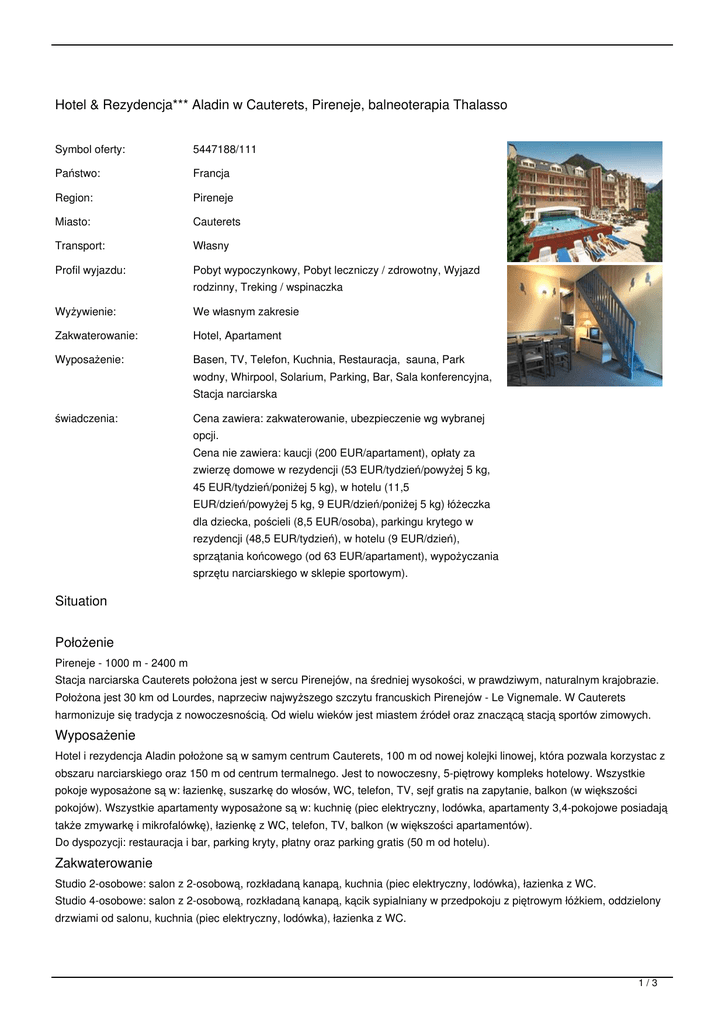 Hotel & Rezydencja*** Aladin w Cauterets, Pireneje, balneoterapia Thalasso Symbol oferty: 5447188/111 Państwo: Francja Region: Pireneje Miasto: Cauterets Transport: Własny Profil wyjazdu: Pobyt wypoczynkowy, Pobyt leczniczy / zdrowotny, Wyjazd Wyżywienie: We własnym zakresie Zakwaterowanie: Hotel, Apartament Wyposażenie: Basen, TV, Telefon, Kuchnia, Restauracja, sauna, Park rodzinny, Treking / wspinaczka wodny, Whirpool, Solarium, Parking, Bar, Sala konferencyjna, Stacja narciarska świadczenia: Cena zawiera: zakwaterowanie, ubezpieczenie wg wybranej opcji. Cena nie zawiera: kaucji (200 EUR/apartament), opłaty za zwierzę domowe w rezydencji (53 EUR/tydzień/powyżej 5 kg, 45 EUR/tydzień/poniżej 5 kg), w hotelu (11,5 EUR/dzień/powyżej 5 kg, 9 EUR/dzień/poniżej 5 kg) łóżeczka dla dziecka, pościeli (8,5 EUR/osoba), parkingu krytego w rezydencji (48,5 EUR/tydzień), w hotelu (9 EUR/dzień), sprzątania końcowego (od 63 EUR/apartament), wypożyczania sprzętu narciarskiego w sklepie sportowym). Situation Położenie Pireneje - 1000 m - 2400 m Stacja narciarska Cauterets położona jest w sercu Pirenejów, na średniej wysokości, w prawdziwym, naturalnym krajobrazie. Położona jest 30 km od Lourdes, naprzeciw najwyższego szczytu francuskich Pirenejów - Le Vignemale. W Cauterets harmonizuje się tradycja z nowoczesnością. Od wielu wieków jest miastem źródeł oraz znaczącą stacją sportów zimowych. Wyposażenie Hotel i rezydencja Aladin położone są w samym centrum Cauterets, 100 m od nowej kolejki linowej, która pozwala korzystac z obszaru narciarskiego oraz 150 m od centrum termalnego. Jest to nowoczesny, 5-piętrowy kompleks hotelowy. Wszystkie pokoje wyposażone są w: łazienkę, suszarkę do włosów, WC, telefon, TV, sejf gratis na zapytanie, balkon (w większości pokojów). Wszystkie apartamenty wyposażone są w: kuchnię (piec elektryczny, lodówka, apartamenty 3,4-pokojowe posiadają także zmywarkę i mikrofalówkę), łazienkę z WC, telefon, TV, balkon (w większości apartamentów). Do dyspozycji: restauracja i bar, parking kryty, płatny oraz parking gratis (50 m od hotelu). Zakwaterowanie Studio 2-osobowe: salon z 2-osobową, rozkładaną kanapą, kuchnia (piec elektryczny, lodówka), łazienka z WC. Studio 4-osobowe: salon z 2-osobową, rozkładaną kanapą, kącik sypialniany w przedpokoju z piętrowym łóżkiem, oddzielony drzwiami od salonu, kuchnia (piec elektryczny, lodówka), łazienka z WC. 1/3 Apartament 6-osobowy typu duplex: salon z 2-osobową, rozkładaną kanapą, kącik sypialniany z piętrowym łóżkiem, sypialnia z 2 łóżkami 1-osobowymi lub 2-osobowym łóżkiem na piętrze, kuchnia (piec elektryczny, lodówka), łazienka z WC. 2 studio 3-4-osobowe, łączone (7-osobowe): salon z 2-osobową, rozkładaną kanapą, kącik sypialniany z 1-osobowym łóżkiem, nie oddzielony drzwiami od salonu. Apartament 3 pokojowy 9-10-osobowy typu cabine: salon z 2-osobową, rozkładaną kanapą, 2 oddzielne kąciki sypialniane z piętrowym łóżkiem, 2 sypialnie z 2-osobowym łóżkiem każda, kuchnia (piec elektryczny, piec tradycyjny, lodówka, mikrofalówka, zmywarka), łazienka, WC. Apartament 4 pokojowy 12-osobowy: salon z 2-osobową, rozkładaną kanapą, 2 oddzielne kąciki sypialniane z piętrowym łóżkiem, sypialnia z 2-osobowym i 1-osobowym łóżkiem lub drugim 2-osobowym łóżkiem, sypialnia z 2 łóżkami 1-osobowymi, sypialnia z 2 łóżkami 1-osobowymi lub 2-osobowym łóżkiem, sypialnia z 3 łóżkami 1-osobowymi lub 2-osobowym łóżkiem i kącikiem sypialnianym z piętrowym łóżkiem, kuchnia (piec elektryczny, piec tradycyjny, lodówka, mikrofalówka, zmywarka), 2 łazienki z WC. W każdym apartamencie znajduje się telefon i telewizja (7 kanałów). W większości znajduje się balkon. Stacja narciarska Cauterets położony jest w uprzywilejowanym miejscu, na obrzeżach Pirenejskiego Parku Narodowego, oferując wysokiej jakości obszar narciarski. Le Cirque de Lys i Le Pont d'Espagne: Trasy narciarskie: 23 (35 km) Zielone: 5 Niebieskie: 9 Czerwone: 7 Czarne: 2 Wyciągi narciarskie: 14 Orczykowe: 9 Krzesełkowe: 4 Kolejka linowa: 1 Trasa z muldami i snowpark Trasy narciarstwa biegowego: 7 km Dojazd Samochód: w kierunku Tarbes, Lourdes, następnie Angeles - Gazost, Pierrefitte i Cauterets. Pociąg: dworzec w Lourdes (28 km), następnie autokar lub taxi. Atrakcje Ściana do wspinaczki Lodowisko Mini-golf Tenis (6 kortów) Kino Basen Thalasso Thalasso - Espace Balneo Aladin - wstęp gratis (23.12.2006-01.05.2007): Centrum Balneo: na powierzchni 800 m2 znajduje się 5 basenów ogrzewanych (temperatura 32 stopnie), liczne łaźnie tureckie, hammam, sauna, sala fitness i solarium. Ogród zabaw: na powierzchni 300 m2 znajduje się sala zabaw dla dzieci 3-13 lat. Thalasso proponuje różne, dodatkowe opcje: -balneo plus”, -bien etre”, -plein forme”, -super forme” (118-309 EUR/5 seansów), zabiegi a la carte: hodromasaże, terapie antydepresyjne, kąpiele w olejkach eterycznych, maseczki z błota, spa, kursy aquagym (18,5-42 EUR/seans). TERMINY: 2/3 od: 2017-03-04 do: 2017-03-11 (8 dni), miejsca: zamów cena od: 739 PLN = 170 EUR od: 2017-03-11 do: 2017-03-18 (8 dni), miejsca: zamów cena od: 586 PLN = 134 EUR od: 2017-03-18 do: 2017-03-25 (8 dni), miejsca: zamów cena od: 553 PLN = 127 EUR od: 2017-03-25 do: 2017-04-01 (8 dni), miejsca: zamów cena od: 739 PLN = 170 EUR od: 2017-04-01 do: 2017-04-08 (8 dni), miejsca: zamów cena od: 739 PLN = 170 EUR od: 2017-04-08 do: 2017-04-15 (8 dni), miejsca: zamów cena od: 586 PLN = 134 EUR od: 2017-04-15 do: 2017-04-22 (8 dni), miejsca: zamów cena od: 553 PLN = 127 EUR CENNIK: Długość pobytu: 8 dni 8 dni 8 dni Grupa cenowa: C I E 445 585 310 445 670 895 240 325 625 850 7 7 7 15 15 15 2.4 % 2.4 % 2.4 % 580 805 Pobyt w obiekcie (do wyboru) apartament 6-osobowy typu duplex standardowo dla osób: 6 500 studio 4-osobowe standardowo dla osób: 4 365 apartament 12-osobowy stand