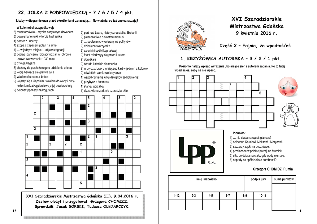 22. JOLKA Z PODPOWIEDZIĄ – 7 / 6 / 5 / 4 pkt. XVI Szaradziarskie Mistrzostwa Gdańska Liczby w diagramie oraz przed określeniami oznaczają… No właśnie, co też one oznaczają? W kolejności przypadkowej: 5) musztardówka… wybita okrętowym dzwonem 5) powyginane rurki w torbie hydraulika 4) portier z Lucerny 4) szopa z zapasem polan na zimę 4) … w jednym miejscu – objaw stagnacji 3) pociąg pancerny biorący udział w obronie Lwowa we wrześniu 1939 roku 3) dźwiga bagaże 3) złożony do przełożonego o udzielenie urlopu 3) kocię bawiące się grzywą ojca 2) wiadomość na mur-beton 2) kojarzy się z kiepskim skokiem do wody i przyłożeniem klatką piersiową o jej powierzchnię 2) polonez pędzący na kogutach 1 2 3 2) port nad Loarą, historyczna stolica Bretanii 2) pieszczotliwie o siostrze mamusi 2) … społeczny, wywierany na polityków 2) dziecięca twarzyczka 2) członkini spółki kapitałowej 2) facet mizdrzący się przed lustrem 2) dorożkarz 2) twarde i słodkie ciasteczka 2) w brydżu: brak u grającego kart w jednym z kolorów 2) oświetlało zamkowe korytarze 1) współbrzmienie kilku dźwięków (zdrobnienie) 1) przybysz z kosmosu 1) starka, gorzałka 1) skosawione zadanie szaradziarskie 4 5 4 3 9 kwietnia 2016 r. Część 2 – Fajnie, że wpadłaś/eś… 1. KRZYŻÓWKA AUTORSKA – 3 / 2 / 1 pkt. Poziomo należy wpisać wyrażenia „kojarzące się” z autorem zadania. Po to tutaj wpadłaś/eś, żeby na nie wpaść. 1 2 3 4 5 6 2 2 2 3 2 1 2 2 2 2 1 Pionowo: 1) … nie siada na cycuś glancuś? 2) obiecana Karolowi, Maksowi i Morycowi. 3) szczerzy ząbki na pocztówce. 4) przełożone w polskiej wersji na Muminki. 5) siła, co działa na ciało, gdy wody niemało. 6) napady na spółdzielcze parabanki? 3 2 1 2 2 2 Grzegorz CHOMICZ, Rumia 4 imię i nazwisko podpis jury suma punktów 5 XVI Szaradziarskie Mistrzostwa Gdańska (II), 9.04.2016 r. Zestaw ułożył i przygotował: Grzegorz CHOMICZ. Sprawdzili: Jacek GÓRSKI, Tadeusz OLEJARCZYK. 12 1-12 2-3 4-5 6-7 8-9 10-11 1 20. EMBARGO NA LOBO – 3 / 2 / 1 pkt. 2. PRZEMYŚLENIA BOMBARDIERA – 5 / 4 / 3 / 2 pkt. 1 2 3 4 5 6 7 8 9 10 11 12 13 14 3. WYKREŚL COŚ – 5 / 4 / 3 / 2 pkt. W odgadniętych wyrazach poziomych należy wykreślić jedną lub kilka liter i tak powstałe nowe słowa – powiązane tematycznie – wpisać do diagramu. 1 2 3 4 5 6 7 8 9 10 11 2 12 Poziomo: 4) hicior nucony podczas czyszczenia łożą z lufą („Niech dobry Bóg zawsze cię za rękę trzyma”). 7) zawadza, więc trzeba ją włożyć do lufy. 8) haubica nie dla chuchra. 13) z braku laku można by nabić lufę wieprzowiną? 14) nierealny mechanizm do zamknięcia lufy. Pionowo: 1) ledwo się oszczeniło, a już się nudzi? 2) niepoważne ciut to zadanie, Rozrywko! 3) popychadła chińczyka. 5) fotka diaskopowa. 6) wuefista dostał za niego magistra? 9) wyspa seatowa. 10) … Ojczyzn – tak chce UE? 11) spór z usterką. 12) tęsknoty jego za siłą ducha w sonetach wysłuchasz. Poziomo: 2) Nikita od odwilży. 3) jajko ozdobione różnokolorowymi kawałkami papieru. 7) zwierzę podobne do lamy (pisane przez „u”). 9) Ryszard, lider partii .Nowoczesna. 10) wokół lodowiska. 11) celne podsumowanie wypowiedzi (też pisane przez „u”). 12) sosna wysokogórska. Pionowo: 1) odzywają się w górach, w lasach, w mediach. 2) bałagan i zamieszanie w kosmosie? 4) Jimmy …, fenomenalny gitarzysta zespołu Led Zeppelin. 5) groteskowe zachowywanie się, nie tylko w cyrku. 6) Irena Jarocka śpiewała, że nim jest. 8) planeta z pierścieniami. 9) ulubieniec wychowawczyni. 1 2 3 5 4 6 7 8 9 Poziomo: 5) chęć wprowadzenia embargo. 8) restrykcyjne embargo. 9) przyczyna embargo. Pionowo: 1) sen, który wybudził ze snu. 2) jezioro nazywane „błękitnym okiem Syberii”. 3) „Były sobie … trzy - sport, muzyka oraz gry”, z programu TV „Jarmark” (chrumkają). 4) podanie ludowe (z imieniem Wałęsy w nazwie). 6) Hyzio, Dyzio i … - animowane kaczorki urodzone w Kaczogrodzie. 7) państwo …, jadą samochodem z tablicą rejestracyjną „Just Married”. 21. ZASTAW SIĘ – 4 / 3 / 2 pkt. Poziomo: - lokal z zastawami Pionowo: 1) miękkie kredki barokowych malarzy. 2) imiennik Jarosza z „Rudego”. 3) wkręcona w maszynę do pisania. 4) nie musi zapisywać się do rodzinnego. 5) ależ im natura sprawiła barwne dzioby! 6) czmycha w ostatniej chwili przed prima aprilisem. 7) fuks, fuks, fuks, …, czyli dobra … . 1 2 5 3 4 6 7 11 18. OLABOGA! ENTOMOLOGA! – 5 / 4 / 3 pkt. Poziomo: 5) drzemka entomologa. 8) zakochanie się entomologa. 10) picuś glancuś entomologa. 13) priorytet entomologa. Pionowo: 1) Mario, ojciec „Ojca chrzestnego”. 2) piosenki śpiewane po zakończonym koncercie, po aplauzie publiczności. 4. CUDNA KAWALERKA – 5 / 4 / 3 / 2 pkt. 3) mickiewiczowska Grażyna. 4) storczyk. 6) strzelane, bo w dwumeczu nie były strzelone. 7) nic ich nie śmieszy, nie umieją się cieszyć (jak koty wydają tylko po…) . 9) egzotyczne pnącze z owocami, które po wysuszeniu służą jako szorstkie gąbki. 11) Grzegorz, piosenkarz, finalista programu „X Factor” („Wstaję, mimo tylu ran i znów do góry głowę”). 12) siatkarska zagrywka. Poziomo: - raczej nie do znalezienia w ofercie biura nieruchomości Pionowo: 1) wzniosłe …, przyświecają rewolucjonistom. 2) „dumny z porcelany” w baśni Andersena. 3) pielęgnowana balsamami, maseczkami. 4) lecą spod końskich kopyt. 1 2 5) ciekawskie …, czyli wścibski szkrab. 6) zliczane przez dietetyka. 7) disnejowski pies podkochujący się w suczce Dinah. 8) strzelba myśliwska o trzech lufach (DRYL w nazwie). 9) za mały, by się nadał policjantowi z drogówki. 10) cierpliwie stoją w ogonku. 11) minerał o szklistych ściankach (fonetycznie: Ełk + las). 12) … pracy, wyszukana na tablicy w zatrudniaku. 3 4 5 6 1 2 3 4 5 8 6 7 7 8 9 10 9 11 11 10 12 12 13 19. PACKA NA MUCHY – 3 / 2 / 1 pkt. Poziomo: 4) na muszce. 7) pod muszką. 8) za muszką