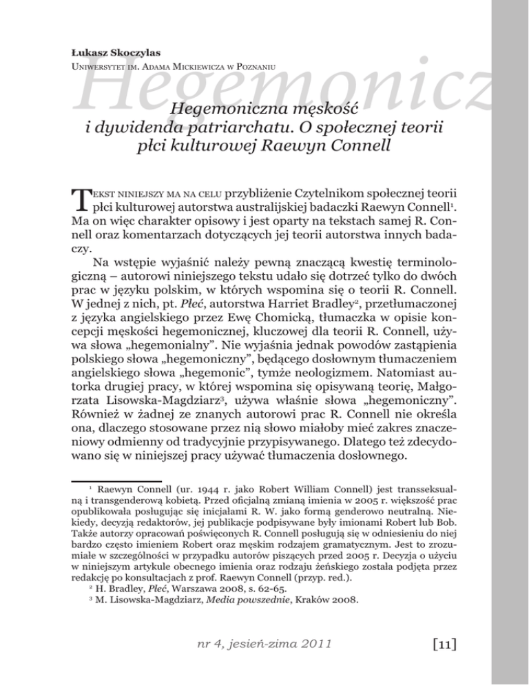 Hegemonicz Łukasz Skoczylas Uniwersytet im. Adama Mickiewicza w Poznaniu Hegemoniczna męskość i dywidenda patriarchatu. O społecznej teorii płci kulturowej Raewyn Connell T ekst niniejszy ma na celu przybliżenie Czytelnikom społecznej teorii płci kulturowej autorstwa australijskiej badaczki Raewyn Connell1. Ma on więc charakter opisowy i jest oparty na tekstach samej R. Connell oraz komentarzach dotyczących jej teorii autorstwa innych badaczy. Na wstępie wyjaśnić należy pewną znaczącą kwestię terminologiczną – autorowi niniejszego tekstu udało się dotrzeć tylko do dwóch prac w języku polskim, w których wspomina się o teorii R. Connell. W jednej z nich, pt. Płeć, autorstwa Harriet Bradley2, przetłumaczonej z języka angielskiego przez Ewę Chomicką, tłumaczka w opisie koncepcji męskości hegemonicznej, kluczowej dla teorii R. Connell, używa słowa „hegemonialny”. Nie wyjaśnia jednak powodów zastąpienia polskiego słowa „hegemoniczny”, będącego dosłownym tłumaczeniem angielskiego słowa „hegemonic”, tymże neologizmem. Natomiast autorka drugiej pracy, w której wspomina się opisywaną teorię, Małgorzata Lisowska-Magdziarz3, używa właśnie słowa „hegemoniczny”. Również w żadnej ze znanych autorowi prac R. Connell nie określa ona, dlaczego stosowane przez nią słowo miałoby mieć zakres znaczeniowy odmienny od tradycyjnie przypisywanego. Dlatego też zdecydowano się w niniejszej pracy używać tłumaczenia dosłownego. 1 Raewyn Connell (ur. 1944 r. jako Robert William Connell) jest transseksualną i transgenderową kobietą. Przed oficjalną zmianą imienia w 2005 r. większość prac opublikowała posługując się inicjałami R. W. jako formą genderowo neutralną. Niekiedy, decyzją redaktorów, jej publikacje podpisywane były imionami Robert lub Bob. Także autorzy opracowań poświęconych R. Connell posługują się w odniesieniu do niej bardzo często imieniem Robert oraz męskim rodzajem gramatycznym. Jest to zrozumiałe w szczególności w przypadku autorów piszących przed 2005 r. Decyzja o użyciu w niniejszym artykule obecnego imienia oraz rodzaju żeńskiego została podjęta przez redakcję po konsultacjach z prof. Raewyn Connell (przyp. red.). 2 H. Bradley, Płeć, Warszawa 2008, s. 62-65. 3 M. Lisowska-Magdziarz, Media powszednie, Kraków 2008. nr 4, jesień-zima 2011 [11] Łukasz Skoczylas Koncepcja męskości hegemonicznej przedstawiona została po raz pierwszy przez R. Connell w artykule The Concept of Role And What To Do With It (O koncepcji roli i o tym, co z tym zrobić), opublikowanym w 1979 roku. Jak pisze Demetrakis Demetriou4, głównym przesłaniem tego artykułu była krytyka teorii ról płciowych, uznanych za formę „teoretycznej ideologii”, stworzonej w latach 50. XX wieku w obliczu kryzysu legitymizacji zachodniego kapitalizmu. Według R. Connell teoria ta pełniła funkcję ideologiczną, gdyż nie konceptualizowała kwestii władzy i zmiany. Nie potrafiła więc zająć się władzą jako zasadniczą właściwością relacji pomiędzy płciami (i relacji wewnątrz jednej płci) oraz zmianą jako efektem sprzeczności w relacjach między płciami. R. Connell skrytykowała teorię ról płciowych także za włączanie biologicznej kategorii płci do struktury społecznej, przez co następuje redukcja pojęcia płci do dwóch komplementarnych i homogenicznych kategorii. Teoria ta nie docenia więc znaczenia władzy i społecznych nierówności. R. Connell porównuje sytuację płci do klas społecznych i ras. Nikt nie mówi przecież o „rolach klasowych” lub „rolach rasowych”, gdyż obecność specyficznych relacji władzy pomiędzy klasami i pomiędzy rasami jest zbyt oczywista dla socjologów. Mówienie o komplementarności płci i ról płciowych może być zatem jedynie ideologicznym zabiegiem zmierzającym do legitymizacji patriarchatu, leżącego u fundamentów współczesnego kapitalizmu. Również założenie o homogeniczności kategorii płci męskiej i żeńskiej budzi sprzeciw R. Connell. Zgodnie z tym założeniem „role płciowe” charakteryzują zachowanie większości społeczeństwa, a wszelkie odstępstwa od nich mieszczą się w niewielkim marginesie społecznym. Tymczasem zmiana jest jednym z głównym tematów wszelkich badań nad rolami płciowymi. Poprzez spychanie wszelkich odstępstw (a więc zmian) na margines, teoria ról płciowych załamuje się pod ogromem tego marginesu, wyjaśnia coraz mniejszą i mniejszą liczbę zachowań. Główną wadą teorii ról płciowych jest więc jej niezdolność do wyjaśniania zmiany. W opozycji do niej, R. Connell proponuje swoją autorską społeczną teorię płci kulturowej, w której centralną pozycję zajmuje koncepcja hegemonicznej męskości. Konstruowanie swojej teorii R. Connell zaczyna od obserwacji różnorodności form męskości i kobiecości. Na jej podstawie dochodzi do wniosku, że płeć kulturowa 4 Opis ogólnych założeń teorii R. Connell na podstawie: D. Demetriou, Connell’s Concept of Hegemonic Masculinity: A Critique, „Theory and Society” 2001, nr 3, s. 337361. [12] refleksje Hegemoniczna męskość i dywidenda patriarchatu. O społecznej... to konfiguracja praktyk5, a opisywać ją należy raczej w kategoriach standardu, a nie normy. Najważniejsze w konstrukcji płci kulturowej jest bowiem to, co ludzie rzeczywiście robią, a nie czego się od nich oczekuje lub jaki jest ich wyobrażony ideał danej płci. Ponadto należy pamiętać, że męskość i kobiecość są praktykowane przez ludzi żyjących w różnych epokach historycznych, kulturach, klasach społecznych itd. – stąd trzeba mówić raczej o wielu „męskościach” i „kobiecościach”, a nie o jednej „męskości” i jednej „kobiecości”. „Relacje władzy pomiędzy mężczyznami, tak samo jak różne wzory rozwoju osobowości, tworzą różne męskości”6. Wobec takiego przeprowadzenia rozumowania te