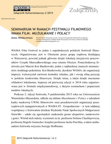 Uznanie autorstwa-Użycie niekomercyjne-Bez utworów zależnych 3.0 Polska(CC BY-NC-ND 3.0 PL) Załącznik Kulturoznawczy 2/2015 Załącznik SPRAWOZDANIA SEMINARIUM W RAMACH FESTIWALU FILMOWEGO WAMA FILM: MUZUŁMANIE I POLACY Anna Wróblewska Wydział Nauk Humanistycznych, Uniwersytet Kardynała Stefana Wyszyńskiego; Faculty of Humanities Cardinal Stefan Wyszyński University in Warsaw (Poland) [email protected] WAMA Film Festival to jeden z najmłodszych polskich festiwali filmowych. Organizowany jest w Olsztynie przez grupę rządową działającą w Warszawie, powstał jednak głównie dzięki lokalnej inicjatywie pracowników Urzędu Marszałkowskiego oraz miasta Olsztyn. Pomysłodawcą festiwalu jest Marcin Kot Bastkowski, jeden z najbardziej znanych montażystów średniego pokolenia. Kot Bastkowski, dyrektor WAMA, do organizacji imprezy wykorzystał zarówno kontakty lokalne, jak i swoją silną pozycję w polskim środowisku filmowym. Dzięki temu, a także dzięki mocnemu wkładowi lokalnemu, impreza od pierwszej edycji w 2014 roku organizowana jest w formule międzynarodowej, z dużym rozmachem i poparciem mediów lokalnych. Podczas 2. edycji festiwalu, 9 października 2015 roku na Uniwersytecie Warmińsko-Mazurskim, odbyła się debata Muzułmanie i Polacy z udziałem kadry naukowej UWM, filmowców oraz przedstawicieli organizacji pozarządowych zaangażowanych w WAMA FF. Gospodarzom – w tym oddanej współpracy z festiwalem dziekan Wydziału Nauk Społecznych Małgorzacie Suświłło – udało się zgromadzić znakomite grono ekspertów, naukowców i gości. Wśród nich należy wymienić m.in. profesora Selima Chazbijewicza, profesora Degefe Gemechu i księdza profesora Jacka Pawlika, a także ambasadora festiwalu reżysera Jerzego Hoffmana. 526 2015 Załącznik Kulturoznawczy ▪ nr 2 MUZUŁMANIE I POLACY Skąd tematyka seminarium i skąd w ogóle pomysł takiej imprezy? Organizatorzy współczesnych festiwali filmowych zwracają uwagę na coraz bardziej istotny czynnik – na zainteresowanie wydarzeniem większej liczby odbiorców, a także przyciągnięcie partnerów, zwłaszcza instytucjonalnych. Szczególnie ważna jest współpraca na gruncie lokalnym. Zapewnienie takich warunków zwiększa szansę na uzyskanie dotacji ze źródeł publicznych, samorządowych i centralnych. WAMA Film Festival spełnia te warunki, choć jest jednym z najmłodszych festiwali filmowych w Polsce. Kiedy powstawał pomysł stworzenia tej imprezy, w latach 2013–2014, eksperci i władze samorządowe w Olsztynie zwrócili organizatorom uwagę na konieczność dopasowania jej programu do specyfiki miejsca, w którym ma się ona odbywać, wskazując dwa podstawowe zagadnienia: wielokulturowość i ekologię. Przede wszystkim zwrócono uwagę na problem międzykulturowości. Konkurs Główny składał się więc z filmów multikulturowych – międzynarodowych koprodukcji filmowych, również odpowiednio sprofilowanych pod kątem treści i przesłania. Eksperckiemu jury głównemu towarzyszyło jury mniejszości narodowych, wywodzące się z licznych lokalnych i centralnych organizacji pozarządowych, jak Borussia, Amnesty International, Związek Ukraińców w Polsce czy mniejszość niemiecka. Większość wydarzeń towarzyszących rozgrywała się wokół tej tematyki, która stała się fundamentem misji festiwalu. „Warmia i Mazury są jednym z bardziej zróżnicowanych kulturowo i etnicznie regionów w Polsce. Na warmińsko-mazurski tygiel kulturowy składają się grupy mniejszości narodowych i etnicznych, m.in. takich jak: Ukraińcy, Niemcy, Mazurzy, Warmiacy, Białorusini, Romowie, Litwini, Tatarzy, Rosjanie. (…) Jednym z motywów przewodnich Wama Film Festival jest promowanie wartości tolerancji i akceptacji współżycia wielu grup etnicznych, społecznych czy religijnych” – czytamy na stronie Załącznik ▪ www.zalacznik.uksw.edu.pl 527 ANNA WRÓBLEWSKA WAMA1. Dyskusja o Muzułmanach i Polakach wpisuje się więc doskonale zarówno w specyfikę regionu, jak i w formułę nowego festiwalu. Dyskusja Muzułmanie i Polacy, zorganizowana podczas drugiej edycji festiwalu, była jednocześnie pierwszym wydarzeniem o charakterze naukowym, osadzonym w przestrzeni Uniwersytetu WarmińskoMazurskiego. Pomysłodawcą seminarium był Marcin Kot Bastkowski, dyrektor WAMA FF, a jednocześnie doktorant w Szkole Filmowej w Łodzi. Temat debaty, ściśle powiązany z formułą imprezy, został ustalony, zanim media zaczęły masowo informować nas o kryzysie emigracyjnym w Europie, dlatego organizatorom zależało na pominięciu bieżącej publicystyki, co udało się jednak tylko w pewnym stopniu. Z drugiej strony ignorowanie tematu w szczytowym momencie powszechnej debaty raziłoby sztucznością. Spotkanie kadry naukowej, artystów i zaangażowanych przedstawicieli organizacji pozarządowych musiało doprowadzić do ożywionej dyskusji. Ale – co należy podkreślić – dyskusji wyłącznie merytorycznej. Profesor Selim Chazbijewicz, współzałożyciel Związku Tatarów RP, w referacie wprowadzającym nakreślił podstawowe fakty wspólnej historii Muzułmanów i Polaków, wyznaczanej nie tylko przez wojny (m.in. z Turcją), lecz także przez stosunki gospodarcze i kulturalne oraz migracje. Prof. Chazbijewicz zwrócił szczególną uwagę na rolę Jana Pawła II w dialogu ekumenicznym i w szerzeniu idei otwartości na inne religie i kultury. Wielokulturowość była w XIX wieku niejako naturalna, zarówno wśród emigracji politycznej, jak i w ówczesnej Turcji Osmańskiej, która była państwem wielokulturowym – mówił profesor, zwracając jednocześnie uwagę na to, że Polacy, walcząc o wolność Turcji, przechodzili na islam. 1 528 http://www.wamafestival.pl/ 2015 Załącznik Kulturoznawczy ▪ nr 2 MUZUŁMANIE I POLACY Mgr Elżbieta Deja, również z Uniwersytetu Warmińsko-Mazurskiego, przedstawiła wyniki badań dotyczące diaspory palestyńskiej w Europie, a w szczególn