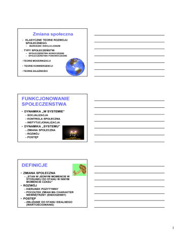 Zmiana społeczna • KLASYCZNE TEORIE ROZWOJU SPOŁECZNEGO: – MARKSIZM I EWOLUCJONIZM • TYPY SPOŁECZEŃSTW: – SPOŁECZEŃSTWA NOWOCZESNE – SPOŁECZEŃSTWA PONOWOCZESNE • TEORIE MODERNIZACJI • TEORIE KONWERGENCJI • TEORIE ZALEŻNOŚCI FUNKCJONOWANIE SPOŁECZEŃSTWA • DYNAMIKA „W SYSTEMIE” – SOCJALIZACJA – KONTROLA SPOŁECZNA – INSTYTUCJONALIZACJA • DYNAMIKA „SYSTEMU” – ZMIANA SPOŁECZNA – ROZWÓJ – POSTĘP DEFINICJE • ZMIANA SPOŁECZNA – „STAN W JEDNYM MOMENCIE W STOSUNKU DO STANU W INNYM MOMENCIE CZASU” • ROZWÓJ – KIERUNEK POZYTYWNY – POCZĄTEK ZMIAN MA CHARAKTER WEWNĘTRZNY (ENDOGENNY) • POSTĘP – ZBLIŻANIE DO STANU IDEALNEGO (WARTOŚCIOWANIE) 1 SOCJOLOGIA WSPÓŁCZESNA • ODEJŚCIE OD POJMOWANIA ZMIANY JAKO PROCESU SAMOISTEGO ROZWOJU , NIEODWRACALNEGO I KONIECZNEGO • PODKREŚLANIE ZNACZENIA DZIAŁALNOŚCI CZŁOWIEKA I NIEPRZEWIDYWALNOŚCI BIEGU WYDARZEŃ • NIEOKREŚONOŚĆ PRZYSZŁOŚCI, OTWARTEJ NA RÓŻNE MOŻLIWOŚCI (B.SZACKA) MARKSIZM • RODZAJ SIŁ WYTWÓRCZYCH • SPOSÓB PRODUKCJI (POZIOM MATERIALNYCH SIŁ WYTWÓRCZYCH) – STOSUNKI PRODUKCJI (np. formy własności) – BAZA ( żródło dynamiki społecznej) – NADBUDOWA (ustrój prawno-polityczny, charakter kultury symbolicznej) EWOLUCJONIZM (H.Spencer) • Prawa rządzące ewolucją społeczeństw, są tymi samymi, które rządzą ewolucją w świecie przyrody • Orientacja przyszłościowa (droga, jaką ludzkość przechodzi w kierunku nowoczesnego społeczeństwa przemysłowego) 2 Społeczeństwa tradycyjne i nowoczesne (Max Weber) Charakter własności Organizacja pracy i produkcji Charakter siły roboczej Charakter rynku ekonomicznego Charakter obowiązujących praw Dominujące motywacje Koncepcja K.Kumara, (łączy wątki podkreślane przez Webera i Parsonsa z koncepcjami innych badaczy) Nowoczesności jest tworzona przez pięć zasad. Zasadę indywidualizmu Zasadę dyferencjacji Racjonalność Ekonomizm Ekspansywność Osobowość nowoczesna Potrzeba nowych doświadczeń, otwartość na innowację i zmianę Świadomość wielości opinii i poglądów, gotowość wypowiadania i uzasadniania własnych opinii i tolerancja dla opinii odmiennych Perspektywna orientacja wobec czasu, zogniskowana na przyszłości, a nie na przeszłości Poczucie mocy podmiotowej, tj. przekonanie, że problemy można rozwiązywać pod warunkiem, że podejmie się odpowiednie działania 3 Osobowość nowoczesna Planowanie przyszłych działań - angażowanie wyobraźni w celu planowania przyszłości Zaufanie do istniejącego porządku społecznego, wiara w prawidłowość, przewidywalność i kalkulowalność życia społecznego Zasada merytokratyczna, która polega na domaganiu się nierównego wynagradzania dla nierównych zasług Przywiązywanie wagi do edukacji i ciągłego doskonalenia się Szanowanie godności innych Przykład: medykalizacja życia • „Stawanie się „faktem” medycznym, czegoś wcześniej „niemedycznego” (nieśmiałość, otyłość, ciąża i poród, starość, zmarszczki..) • ..”kultura terapeutyczna to kultura indywidualizmu, która przekonuje człowieka, że to jego cechy i zachowania stanowią główną przyczynę dotykających go problemów. Przeniesienie odpowiedzialności na jednostki, wprowadza je w stan niepewności i zagubienia, rzucając w ramiona terapeutów, psychiatrów, psychologów, dietetyków, trenerów oraz lekarzy” (Bauman, Giddens, Beck, Jacyno) • Przekształcanie obywateli w konsumentów0. • „Multiplikacja chorób” Przykład: medykalizacja życia • T.Parsons, medycyna, jako instytucja społeczna o funkcjach kontrolnych, choroba – to poddawana kontroli dewiacja społeczna (dewiacyjna rola społeczna) • R.Merton, badając system kształcenia studentów medycyny, stworzył model socjalizacji do roli profesjonalnej • E.Friedson, choroba jako forma społecznie konstruowanej dewiacji ( umożliwiło to ekspansję medycyny na niezmedykalizowane sfery życia) • Współcześnie: od „terapeutycznej tyranii” do całościowego dobrostanu fizycznego, psychicznego i społecznego (WHO) 4 Mechanizmy • Ekspertyza i terapia - droga do szczęścia i realizacji przy wsparciu ekspertów i terapeutów, ponieważ pracujemy nad swoimi emocjami i psychiką; - rola poradników w różnych dziedzinach życia; - rozwiązywanie problemów, typu: rozpad związku czy trudności w znalezieniu pracy, nie zależą od systemu, ale od jednostki; • Świat zewnętrzny i wewnętrzny • „Osiągnięcie szczęścia nie jest już wiązane z przekształcaniem świata społecznego, ale realizuje się przez samokontrolę świata wewnętrznego.” „>>ja<< staje się przedmiotem niezmordowanej pracy” Jacyno idea „pracy nad sobą” wykazuje związki z fascynacją Zachodu religiami Wschodu (buddyzm) Społeczeństwa ponowoczesne Schematy interpretacyjne : ewolucyjny Przyjmuje się w nim, że „przyszłość już była”; Założenie o linearnej ciągłości dziejów. Przykłady: koncepcja społeczeństwa postindustrialnego, D.Bella czy A.Touraine’a. P.Drucker - społeczeństwo oparte o wiedzę, inni społeczeństwo informacyjne… Społeczeństwa ponowoczesne Schematy interpretacyjne cykliczny Nostalgiczna idea powrotu do utraconej przeszłości. Narastająca świadomość istnienia różnych negatywnych aspektów i konsekwencji nowoczesności New Age, wiara w odbudowanie utraconych więzi rodzinnych, wspólnot lokalnych, czy religijnych. 5 RUCH PRECESYJNY NEW AGE DEF. „ NIEFORMALNY, WIELOPOSTACIOWY I WIELPWYMIAROWY, ALTERNATYWNY RUCH KULTUROWY, KTÓRY NARODZIŁ SIĘ W USA W LATACH 60tych” Wiąże się z wiarą w nadejście epoki Wodnika pod koniec 2012 roku i końcem Chrześcijaństwa (Ery Ryb) Jednym ze znaków rozpoznawczych New Age jest panteizm tj wiara, że Bóg jest we wszystkim i wszystko jest Bogiem. Ruch ten zaleca min. medytacje, afirmacje, jogę, reikiD 6 Społeczeństwa ponowoczesne Schematy interpretacyjne : di