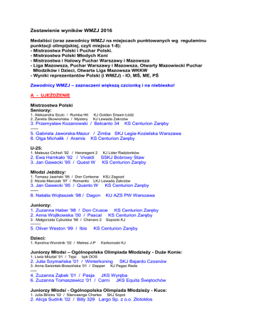 Zestawienie wyników WMZJ 2016 Medaliści (oraz zawodnicy WMZJ na miejscach punktowanych wg regulaminu punktacji olimpijskiej, czyli miejsca 1-8): - Mistrzostwa Polski i Puchar Polski. - Mistrzostwa Polski Młodych Koni - Mistrzostwa i Halowy Puchar Warszawy i Mazowsza - Liga Mazowsza, Puchar Warszawy i Mazowsza, Otwarty Mazowiecki Puchar Młodzików i Dzieci, Otwarta Liga Mazowsza WKKW - Wyniki reprezentantów Polski (i WMZJ) - IO, MŚ, ME, PŚ Zawodnicy WMZJ – zaznaczeni większą czcionką i na niebiesko! A - UJEŻDŻENIE Mistrzostwa Polski Seniorzy: 1. Aleksandra Szulc / Rumba Hit 2. Żaneta Skowrońska / Mystery KJ Golden Dream Łódź KJ Lewada Zakrzów 3. Przemysław Kozanowski / Belcanto 34 KS Centurion Zaręby ----5. Gabriela Jaworska-Mazur / Zimba SKJ Legia-Kozielska Warszawa 8. Olga Michalik / Aramis KS Centurion Zaręby U-25: 1. Mateusz Cichoń ’92 / Herzregent 2 2. Ewa Hamkało ’92 / Vivaldi 3. Jan Gawecki ’95 / Quest W KJ Lider Radzionków SSKJ Bobrowy Staw KS Centurion Zaręby Młodzi Jeźdźcy: 1. Tomasz Jasiński ‘95 / Don Corleone KSJ Zagozd 2. Nicola Marczak ’97 / Romantic LKJ Lewada Zakrzów 3. Jan Gawecki ’95 / Quanto W KS Centurion Zaręby ----8. Natalia Wojtaszek ‘98 / Dagon KU AZS PW Warszawa Juniorzy: 1. Zuzanna Haber ’98 / Don Crusoe KS Centurion Zaręby 2. Anna Wojtkowska ’00 / Pascal KS Centurion Zaręby 3 . Małgorzata Cybulska ’98 / Chenaro 2 -------- 5. Oliver Weston ‘99 / Ibis Sopocki KJ KS Centurion Zaręby Dzieci: 1. Karolina Worotnik ’02 / Metres J-P Karkonoski KJ Juniorzy Młodsi – Ogólnopolska Olimpiada Młodzieży - Duże Konie: 1. Liwia Misztal ’01 / Tejsi bpk DOS 2. Julia Szymańska ’01 / Winterkoning 3. Anna Swiontek-Brzezińska ’01 / Dapper SKJ Bajardo Czosnów KJ Pegaz Reda ---4. Zuzanna Ząbek ’01 / Pasja JKS Wyręba 6. Zuzanna Tomaszewicz ’01 / Carni JKS Equita Świętochów Juniorzy Młodsi - Ogólnopolska Olimpiada Młodzieży - Kuce: 1. Julia Bilicka ’02 / Stenvaenge Charles SKJ Sopot 2. Alicja Sudnik ’02 / Billy 329 Largo Sp. z o.o. Złotokłos 3. Klaudia Hałeła ’03 / Buttini Pomorska Liga Jeździecka Dziemiany ---4. Ewa Golubińska ’04 / Delicious PP KJ Aldragho Piaseczno 5. Karolina Czyż ’02 / Cassandra Largo Sp. z o.o. Złotokłos 6. Dominika Tekień ’01 / Tymianek KS Centurion Zaręby 7. Adrianna Drozd ’01 / Shrek KJ Truskaw 8. Vartui Kehiaian ’04 / Mickey Mouse bpk MAZ Kuce Juniorzy: 1. Zofia Baran ’02 / Summersby bpk MAZ 2. Zofia Stachnik ’00 / Cassandra Largo sp. z o.o. Złotokłos 3. Małgorzata Kowalska ’01 / Glamour PP -------- 6. Alicja Sudnik ’02 / Billy 329 KJ Lider Radzionków Largo Sp. z o.o. Warszawa Kuce Młodzicy: 1. Maja Baranowska ’05 / Golden Gentelmann KJ BM Horse Tagowie 2. Marta Gąsienica Roj ’05 / Nutka Ponysport bpk MAL 3. Natalia Plata ’05 / Kleo bpk POM Akademickie Mistrzostwa Polski Kategoria Amatorów 1. Monika Małecka / Wakatanka Politechnika Gdańska 2. Karolina Badowska / New Gold 3. Katarzyna Cieślak / Diverso Uniwersytet Warszawski / Polski Polo Klub Brochów Politechnika Łódzka / KJ Golden Dream Łódź Kategoria Profi 1. Rishad Sabitov / Dior Uniwersytet Łódzki / KJ Janowice 2. Maria Pietrusińska / Wezyr Uniwersystet Warszawski / KJ Aldragho Piaseczno 3. Hanna Suchan / Sternik Politechnika Częstochowska / JKS Cwał MP zawodnicy z WMZJ – 12 medali: Złote – 2, Srebrne – 7, Brązowe – 3, Miejsca 1 - 8 = 24 Bez medali 2 kategorie na 11: Dzieci, Kuce – Mł. ------------------------------Halowy Puchar Polski Seniorzy: 1. Ewa Hamkało / Vivaldi 1. Żaneta Skowrońska / Love Me SSKJ Bobrowy Staw LKJ Lewada Zakrzów 3. Gabriela Jaworska-Mazur / Germany SKJ Legia-Kozielska Warszawa ------7. Emilia Jach / Aqsel SKJ Legia-Kozielska Warszawa Młodzi Jeźdźcy: 1. Jan Gawecki ’95 / Kuanto W KS Centurion Zaręby 2. Aleksandra Lesner ’97 / Wohlklang U KJ Pegaz Reda 3. Michalina Terlecka ’98 / Falsterbeau OSK Michalscy ---------- 6. Klaudia Parys ’96 / Afrodite KS Centurion Zaręby 7. Natalia Wojtaszek ’98 / Dagon KU AZS PW Warszawa Juniorzy: 1. Alicja Trawińska ’99 / Diego Ramirez bpk POM 2. Zuzanna Haber ’98 / Don Crusoe KS Centurion Zaręby 3. Anna Wojtkowska ’00 / Pascal KS Centurion Zaręby ---------- 5. Klara Jędrzejczyk ’99 / Loomer Waid JKS Equita Świętochów Juniorzy Młodsi: 1. Małgorzata Kowalska ’01 / Bentamo 2 KJ Lider Radzionków 2. Karolina Worotnik ’02 / Imbir Karkonoski KJ Kuce (zawodnicy 12-16 lat): 1. Dominika Tekień ’01 / Delicious PP KS Centurion Zaręby 2. Zofia Baran ’02 / Denaro PP bpk MAZ 3. Adrianna Włodkowska ’01 / Deinhard SKJ Goldendream Łódż -------4. Zofia Stachnik ’00 / Cassandra Largo Sp. z o.o. Złotokłos 5. Alicja Sudnik ’02 / Billy 329 Largo Sp. z o.o. Złotokłos Kuce - Młodzicy: 1. Maria Walczyńska-Graczyk ’06 / Mamba KJ Aldragho Piaseczno 2. Martyna Ossowska ’05 / Chester KJ Pegaz Reda 3. Marta Gąsienica-Roj ’05 / Nutka Ponysport bpk MAL Puchar Polski Juniorzy Młodsi Kuce: 1. Zofia Baran ’02 / Denaro PP bpk MAZ 2. Adrianna Drozd ’01 / Shrek KJ Golden Horse Koryta 3. Julia Bilicka ’02 / Donevan SKJ Sopot -------4. Ewa Golubińska ’04 / Delicious PP KJ Aldragho Piaseczno 11. Zuzanna Tomaszewska ’01 / Tymianek JKS Equita Świętochów HPP+PP zawodnicy z WMZJ – 10 medali: Złote – 5; Srebrne – 3; Brązowe – 2 ; miejsca 1 – 8 = 18 Bez medali 1 kategoria z 7: JM ------------------------------Mistrzostwa Polski Młodych Koni 4 - letnie: 1. SUNNY BOY CM / Aleksandra Szulc KJ Golden Dream Łódź 2. PERYKLES / Danuta Kosecka LKJ Nadwiślanin Kwidzyń 3. ESPLANADA / Karolina Mazurek SLKS Książ 5 - letnie: 1. PROWOKATOR / Karolina Mazurek SLKS Książ 2. GIVENCHY / Anna Kierznowska SKJ Kietlów 3. FURST OSKAR G / Kamil Puliński WKJ Lublin 6 – letnie: 1. LORD DJANGO / Ilona Janas SSKJ Bobrowy Staw 2. ROMANTICA / Katarzyna Łukasik WKJ Lublin 3. GALAPAGOS / Mateusz Pola LKJ Lewada Zakrzów Puchar Polski Młodych Koni 7-9 – le