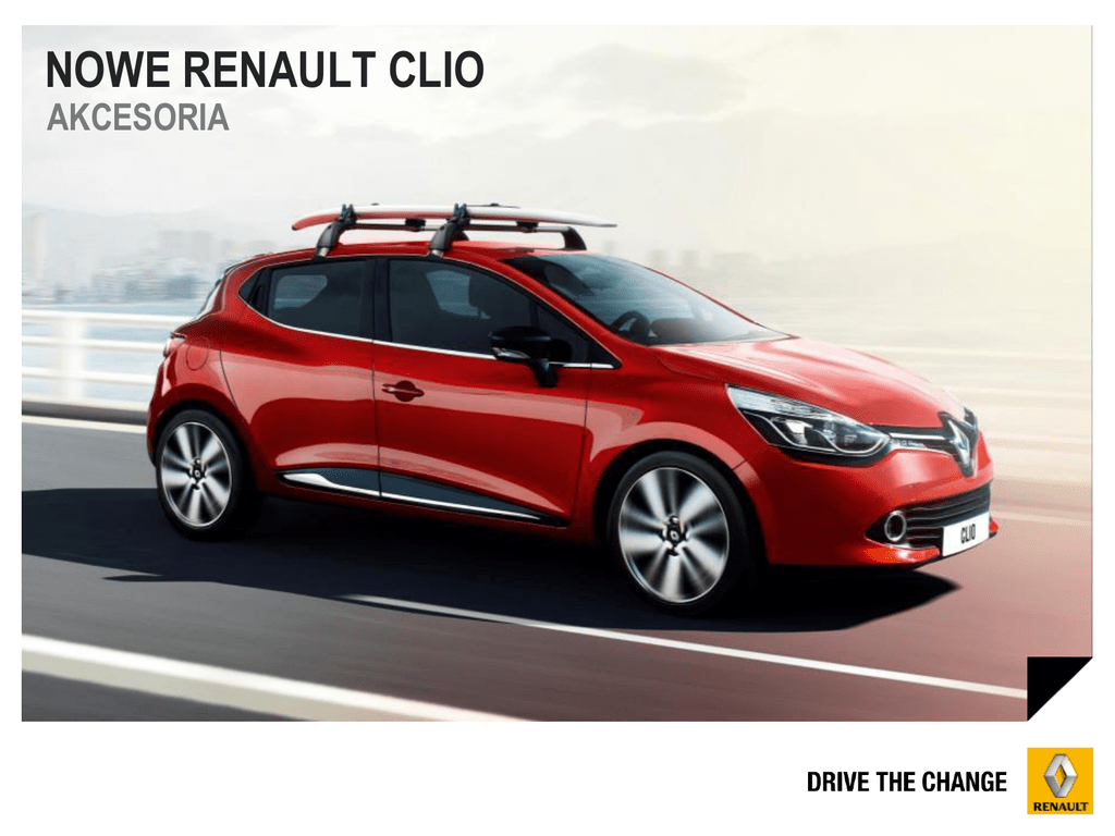 NOWE RENAULT CLIO AKCESORIA AKCESORIA I NOWE RENAULT CLIO 2 DESIGN CONFORT KOMFORT BEZPIECZEŃSTWO SECURITÉ AKCESORIA RENAULT Dostosowane do każdego stylu i każdej osobowości. Pozwalają na bardziej praktyczne i długotrwałe użytkowanie pojazdów. Odpowiadają wymogom wyższym niż normy i standardy. Drive the Change SPIS TREŚCI I NOWE RENAULT CLIO TRANSPORT PERSONALIZACJA Wygląd zewnętrzny Koła i felgi Wygląd wnętrza str. 4 str. 5 str. 6 Dywaniki Wyposażenie wnętrza Wyposażenie do bagażnika Komfort jazdy Ochrona karoserii Akcesoria do szyb Produkty do czyszczenia str. 7 str. 8 str. 9 str. 10 str. 10 str. 10 str. 10 BEZPIECZEŃSTWO 3 Wyposażenie antywłamaniowe Pomoc i oznakowanie Łańcuchy śniegowe Foteliki dzieciece str. 12 MULTIMEDIA KOMFORT I OCHRONA Haki i bagażniki str. 11 str. 11 str. 11 str. 11 Audio Tablety Vidéo Telefonia str. 13 str. 13 str. 13 str. 13 PERSONALIZACJA ZEWNĘTRZNA I WEWNĘTRZNA Szeroka gama akcesoriów dla podkreślenia sportowego charakteru Nowego Renault Clio. 00040301 Listwa pod przednim zderzakiem 82 01 345 035 Wykończenie: czarny błyszczący. Gotowa do montażu. Chromowane osłony lusterek 00047872 Zestaw Sport + 00047372 00040303 Zestaw Sport 82 01 498 966 (Hatchback) / 82 01 498 972 (Grandtour) 82 01 498 977 (Hatchback) / 82 01 498 980 (Grandtour) 82 01 385 440 Wykończenie: Carbon Look Titanium (gotowe do montażu). Zestaw zawiera spojler przedni, spojlery boczne, dyfuzor tylny, osłony świateł przeciwmgłowych i ozdobne podstawy lusterek bocznych. Wykończenie: Carbon Look Titanium. Zestaw zawiera komplet osłon nadkoli. Sprzedawane w komplecie 2 szt. 4 PERSONALIZACJA I FELGI ALUMINIOWE Podkreśl dynamikę i sportowy charakter wybierając felgi zaprojektowane specjalnie do Nowego Renault Clio (poza modelami GT i RS). Felgi aluminiowe Passion 16" 00036473 Felgi aluminiowe Far away 15" 00010172 00052037 Felgi aluminiowe Kanjara 15" 82 01 468 869 77 11 423 485 40 30 031 37R Kolor: czarny błyszczący. Wymiary opon: 185/65 R15 88 T. Śruby antykradzieżowe: 77 11 239 099 / 77 11 239 101 / 77 11 239 104. Kolor: srebrnoszary. Wymiary opon: 185/65 R15 88 T. Śruby antykradzieżowe : 77 11 239 099 / 77 11 239 101 / 77 11 239 104. Kolor: czarny błyszczący i diamentowy. Wymiary opon : 195/55 R16 87 H. Kołpaczek: 40 30 542 14R. Śruby antykradzieżowe : 77 11 239 099 / 77 11 239 101 / 77 11 239 104. Felgi aluminiowe Drenalic 17" Felgi aluminiowe Sport 17" Kołpaki Gradiant 15” z zabezp. antykradz. 82 01 392 441 Wykończenie: Carbon Look. Kołpaki Fregate 15” z zabezp. antykradz. 00040105 82 01 359 230 Wykończenie: grafitowe. 40 30 064 50R 82 01 335 578 Kolor: czerwony i diamentowy. Wymiary opon : 205/45 R17 88 V. Kołpaczek : 40 31 515 46R. Śruby antykradzieżowe : 77 11 239 099 / 77 11 239 101 / 77 11 239 104. Kolor: czarny błyszczący i diamentowy. Wymiary opon : 205/45 R17 88 V. Śruby antykradzieżowe : 77 11 239 099 / 77 11 239 101 / 77 11 239 104. 5 PERSONALIZACJA ZEWNĘTRZNA I WEWNĘTRZNA Szeroka gama akcesoriów do personalizacji Nowego Renault Clio. Listwa ochronna na próg bagażnika (Grandtour) Gałka dźwigni zmiany biegów RS 82 01 450 086 00031588 Wykonana z gładkiej stali nierdzewnej z tłoczeniem. 00060082 82 01 300 589 Materiał wykonania: zamak z chromowo-satynowym wykończeniem. Nakładki progowe Ochronny pokrowiec na samochód Visuel bientôt disponible 82 01 391 423 Imitacja aluminium. Sprzedawane w komplecie 2 szt (przód). 6 77 11 428 236 KOMFORT I OCHRONA I DYWANIKI Dopasowane i spersonalizowane dywaniki do Nowego Renault Clio stanowią dodatkowy akcent wyrafinowania w samochodzie. Poddane wymagającym testom gwarantującym ich wysoką jakość , trwałość i bezpieczeństwo. Tekstylne Confort Tekstylne Premium 82 01 321 305 (czerwony) 82 01 321 303 (niebieski) 82 01 171 134 (szary) brązowy) Sprzedawane w komplecie 4 szt. 00039563 82 01 321 307 (jasno- 00036399 82 01 321 301 / 82 01 321 299 (Clio Société) Tekstylne GT 00049179 Tekstylne Renault Sport 00044957 00039593 Gumowe Novestra Sprzedawane w komplecie 4 szt. 82 01 321 296 / 82 01 321 298 (Clio Société) 82 01 370 537 82 01 339 989 Wysokie brzegi zatrzymują błoto i śnieg. Sprzedawane w komplecie 4 szt. Sprzedawane w komplecie 4 szt. Wyhaftowane logo. Sprzedawane w komplecie 4 szt. Wyhaftowane logo. 7 KOMFORT I OCHRONA I WYPOSAŻENIE WNĘTRZA Kompletna gama akcesoriów dla zapewnienia optymalnego komfortu w Nowym Renault Clio. Kit fumeur Podłokietnik czarny Pojemność: 1 L. Wyposażony w miejsce do monet, podwójny uchwyt na kubek i butelkę. Niekompatybilny z Nowym Renault Clio Grandtour wyposażonym w składane oparcie fotelu pasażera. 00043121 82 01 367 091 82 01 375 535 Zawiera popielniczkę i zapalniczkę. Wieszak na zagłówek 00017084 Lodówka 00030253 00039615 Pokrowce na siedzenia 82 01 372 473 (przód) / 82 01 321 312 (tył) 77 11 431 405 82 01 382 042 Kolor czarny. Możliwość prania w pralce. Sprzedawane w komplecie 2 szt. Niekompatybilne z Nowym Renault Clio GT i RS. Pojemność: 24 L. Zasilanie: gniazdo 12V / 230V. Wykończenie chromowane. 8 KOMFORT I OCHRONA I WYPOSAŻENIE DO BAGAŻNIKA Kompletna gama wyposażenia spełnia wszystkie wymagania i sprawia, że bagażnik Nowego Renault Clio jest funkcjonalny i uniwersalny. Ochrona bagażnika przed zabrudzeniami 00039620 Wkład do bagażnika 00039624 00038355 Wykładzina bagażnika Dwustronna: tekstylno-gumowa. Z półsztywnego materiału. Dwustronny: tekstylno-gumowy. Materiał umożliwiający złożenie i przechowanie. Przebudowa w samochód ciężarowy Kratka oddzielająca przestrzeń bagażową od pasażerskiej Siatka do bagażnika 82 01 321 345 (Hatchback) / 82 01 321 347 (Grandtour) Zestaw zawiera plastikowy wkład i pprzeczkę zapobiegającą przesuwaniu się bagażu (poddane crash-testom). Pozwala na przebudowę samochodu osobowego w samochód ciężarowy (konwersja możliwa). Również dostępne: kratka oddzielająca przestrzeń pasażerską (82 01 321 348), osłona czę