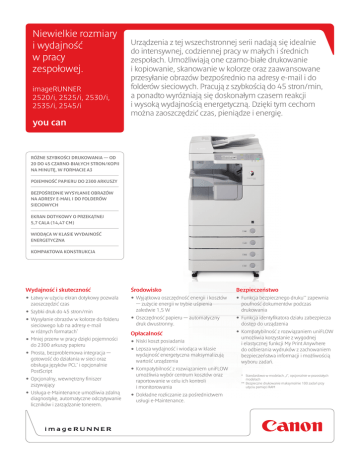 Niewielkie rozmiary i wydajność w pracy zespołowej. imageRUNNER 2520/i, 2525/i, 2530/i, 2535/i, 2545/i you can Urządzenia z tej wszechstronnej serii nadają się idealnie do intensywnej, codziennej pracy w małych i średnich zespołach. Umożliwiają one czarno-białe drukowanie i kopiowanie, skanowanie w kolorze oraz zaawansowane przesyłanie obrazów bezpośrednio na adresy e-mail i do folderów sieciowych. Pracują z szybkością do 45 stron/min, a ponadto wyróżniają się doskonałym czasem reakcji i wysoką wydajnością energetyczną. Dzięki tym cechom można zaoszczędzić czas, pieniądze i energię. Różne szybkości drukowania — od 20 do 45 czarno-białych stron/kopii na minutę, w formacie A3 Pojemność papieru do 2300 arkuszy Bezpośrednie wysyłanie obrazów na adresy e-mail i do folderów sieciowych Ekran dotykowy o przekątnej 5,7 cala (14,47 cm) Wiodąca w klasie wydajność energetyczna Kompaktowa konstrukcja Wydajność i skuteczność w użyciu ekran dotykowy pozwala •Łatwy zaoszczędzić czas •Szybki druk do 45 stron/min obrazów w kolorze do folderu •Wysyłanie sieciowego lub na adresy e-mail w różnych formatach* przerw w pracy dzięki pojemności •Mniej do 2300 arkuszy papieru bezproblemowa integracja — •Prosta, gotowość do działania w sieci oraz obsługa języków PCL* i opcjonalnie PostScript Środowisko oszczędność energii i kosztów bezpiecznego druku zapewnia •Wyjątkowa •Funkcja — zużycie energii w trybie uśpienia poufność dokumentów podczas ** zaledwie 1,5 W papieru — automatyczny •Oszczędność druk dwustronny. Opłacalność •Niski koszt posiadania wydajność i wiodąca w klasie •Lepsza wydajność energetyczna maksymalizują drukowania identyfikatora działu zabezpiecza •Funkcja dostęp do urządzenia z rozwiązaniem uniFLOW •Kompatybilność umożliwia korzystanie z wygodnej i elastycznej funkcji My Print Anywhere do odbierania wydruków z zachowaniem bezpieczeństwa informacji i możliwością wyboru zadań. wartość urządzenia z rozwiązaniem uniFLOW •Kompatybilność umożliwia wybór centrum kosztów oraz wewnętrzny finiszer •Opcjonalny, raportowanie w celu ich kontroli zszywający i monitorowania e-Maintenance umożliwia zdalną •Usługa rozliczanie za pośrednictwem •Dokładne diagnostykę, automatyczne odczytywanie usługi e-Maintenance. liczników i zarządzanie tonerem. Bezpieczeństwo *Standardowo w modelach „i”, opcjonalnie w pozostałych modelach **Bezpieczne drukowanie maksymalnie 100 zadań przy użyciu pamięci RAM Format papieru Gramatura papieru A3, A4, A4R, A5, A5R Oryginał jednostronny: Od 42 do 128 g/m2, Oryginał dwustronny: Od 50 do 128 g/m2 100 arkuszy (A4, A4R, A5, A5R: 80 g/m2), 50 arkuszy (A3: 80 g/m2) OR IA AKCES INNE 2 tace A4: 250 arkuszy, A3: 100 arkuszy A4: 100 arkuszy, A3: 50 arkuszy 426 x 413 x 109 mm Ok. 0,6 kg Taca A Taca B Wymiary (sz. x gł. x wys.) Ciężar Pokrywa typu P: do imageRUNNER 2525/2530 bez DADF Pokrywa typu Q: do imageRUNNER 2535/2545 bez DADF Pojemnik z tuszem do pieczęci C1 Moduł pieczęci B Uchwyt dostępowy podajnika ADF A1 Zestaw PCL do drukarki AF1: Umożliwia drukowanie PCL5e i PCL6 w przypadku modeli innych niż i Zestaw PS do drukarki AF1: Umożliwia drukowanie z emulacją języka PostScript Level 3 Zestaw do drukowania kodów kreskowych B1: Umożliwia drukowanie kodów kreskowych przy użyciu technologii Jet Caps Karta faksu Super G3 AG1: Dodaje funkcje faksu Kaseta FL AJ1: Zapasowa taca na 550 arkuszy do kasety 1 urządzenia imageRUNNER 2525 / 2525i / 2530 / 3530i / 2535 / 2535i / 2545 / 2545i Kaseta FL AK1: Zapasowa taca na 550 arkuszy do kasety 2 urządzenia imageRUNNER 2525 / 2525i / 2530 / 3530i / 2535 / 2535i / 2545 / 2545i lub do modułu podającego kasety AE1 lub modułu kaset W1 Kaseta FL AL1: Zapasowa taca na 250 arkuszy do kasety 1 urządzenia imageRUNNER 2520 / 2520i umożliwia zamianę formatów papieru bez zmiany ustawień drukarki. Element dystansowy do kaset A1: Reguluje wysokość kasety na 250 arkuszy w połączeniu z opcjonalnym modułem podawania kaset AE1 lub modułem kaset W1 tylko w urządzeniach imageRUNNER 2520 / 2520i. Moduł podajnika kopert D1: Mocowany do kasety 2 w celu łatwego podawania kopert Podstawa do imageRUNNER 2500 Moduł dwustronny B1: Zwiększa wydajność druku dwustronnego do 100% Opcjonalny moduł przebiegu odwrotnego (2-kierunkowy) do imageRUNNER 2520 / 2520i / 2525 / 2530. Zszywki J1: Zszywki do finiszera wewnętrznego B1 Taca na dokumenty-J1: Praktyczna taca mocowana z boku urządzenia. Zasilacz U1. Moduł czytnika kart D3: Zestaw mocujący do czytnika kart F1. Czytnik kart Canon F1: System kontroli dostępu fizycznego przy użyciu kart, który ogranicza grono użytkowników do osób upoważnionych. Zestaw 3-gniazdowy USB A1: 3-gniazdowy zestaw do podłączania pamięci USB. Kabel interfejsu CCVI A1: Zestaw interfejsu do rozwiązania na monety. Toner czarny C-EXV33: Toner do imageRUNNER 2520 / 2520i / 2525 / 2525i / 2530 / 2530i. Toner czarny C-EXV32: Toner do imageRUNNER 2535 / 2535i / 2545 / 2545i anon nc. I C Niektóre obrazy stanowią symulację, mającą na celu uzyskanie przejrzystości reprodukcji. Wszystkie dane są oparte na standardowych metodach testowania firmy Canon. Niniejsza ulotka i dane techniczne produktu zostały opracowane przed datą wprowadzenia produktu na rynek. Ostateczne dane techniczne mogą ulec zmianie bez powiadomienia. ™ i ®: Wszystkie nazwy firm i/lub produktów są znakami towarowymi i/lub zarejestrowanymi znakami towarowymi odpowiednich producentów na rynkach i/lub w krajach, w których są obecni. canon.com anon urope E C NNA ST Liczba tac Pojemność tacy 45/34 obrazy/min (model 45/35 stron/min), 25/13 obrazów/min (model 30/25/20 stron/min), 100 x 100 dpi, 150 x 150 dpi, 200 x 100 dpi, 200 x 200 dpi, 200 x 400 dpi, 300 x 300 dpi, 400 x 400 dpi, 600 x 600 dpi 100 x 100 dpi, 150 x 150 dpi, 200 x 200 dpi, 300 x 300 dpi E-mail/faks interne