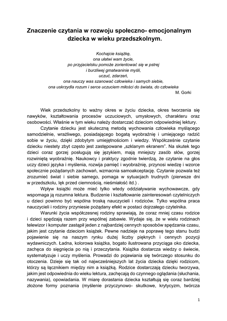 Znaczenie czytania w rozwoju społeczno- emocjonalnym dziecka w wieku przedszkolnym. Kochajcie książkę, ona ułatwi wam życie, po przyjacielsku pomoże zorientować się w pstrej i burzliwej gmatwaninie myśli, uczuć, zdarzeń, ona nauczy was szanować człowieka i samych siebie, ona uskrzydla rozum i serce uczuciem miłości do świata, do człowieka M. Gorki Wiek przedszkolny to ważny okres w życiu dziecka, okres tworzenia się nawyków, kształtowania procesów uczuciowych, umysłowych, charakteru oraz osobowości. Właśnie w tym wieku należy dostarczać dzieciom odpowiedniej lektury. Czytanie dziecku jest skuteczną metodą wychowania człowieka myślącego samodzielnie, wrażliwego, posiadającego bogatą wyobraźnię i umiejącego radzić sobie w życiu, dzięki zdobytym umiejętnościom i wiedzy. Współcześnie czytanie dziecku niestety zbyt często jest zastępowane „szklanym ekranem”. Na skutek tego dzieci coraz gorzej posługują się językiem, mają mniejszy zasób słów, gorzej rozwiniętą wyobraźnię. Naukowcy i praktycy zgodnie twierdzą, że czytanie na głos uczy dzieci języka i myślenia, rozwija pamięć i wyobraźnię, przynosi wiedzę i wzorce społecznie pożądanych zachowań, wzmacnia samoakceptację. Czytanie pozwala też zrozumieć świat i siebie samego, pomaga w sytuacjach trudnych (pierwsze dni w przedszkolu, lęk przed ciemnością, nieśmiałość itd.) . Wpływ książki może mieć tylko wtedy oddziaływanie wychowawcze, gdy wspomaga ją rozumna lektura. Budzenie i kształtowanie zainteresowań czytelniczych u dzieci powinno być wspólna troską nauczycieli i rodziców. Tylko wspólna praca nauczycieli i rodziny przyniesie pożądany efekt w postaci dojrzałego czytelnika. Warunki życia współczesnej rodziny sprawiają, że coraz mniej czasu rodzice i dzieci spędzają razem przy wspólnej zabawie. Wydaje się, że w wielu rodzinach telewizor i komputer zastąpił jeden z najbardziej cennych sposobów spędzania czasu, jakim jest czytanie dzieciom książek. Pewne nadzieje na poprawę tego stanu budzi pojawienie się na naszym rynku dużej liczby pięknych i cennych pozycji wydawniczych. Ładna, kolorowa książka, bogato ilustrowana przyciąga oko dziecka, zachęca do sięgnięcia po nią i przeczytania. Książka dostarcza wiedzy o świecie, systematyzuje i uczy myślenia. Prowadzi do pojawiania się twórczego stosunku do otoczenia. Dzieje się tak od najwcześniejszych lat życia dziecka dzięki rodzicom, którzy są łącznikiem między nim a książką. Rodzice dostarczają dziecku tworzywa, jakim jest odpowiednia do wieku lektura, zachęcają do czynnego oglądania (słuchania, nazywania), opowiadania. W miarę dorastania dziecka kształtują się coraz bardziej złożone formy poznania (myślenie przyczynowo- skutkowe, krytycyzm, twórcza 1 wyobraźnia). Książka towarzyszy dziecku już od najmłodszych lat życia i trudno nie docenić jej bogatego i wszechstronnego oddziaływania na jego rozwój w niemalże wszystkich jego aspektach. Współcześnie, mając do dyspozycji media takie jak telewizja czy internet, dzieci wciąż sięgają po książkę, szukając w niej furtki do pięknego świata ludzkiej wyobraźni, tak dobrze znanego każdemu maluchowi. Czytanie jest dla dziecka przede wszystkim źródłem przyjemności i formą rozrywki. Aktywność ta powoduje obniżenie napięcia mięśniowego i po prostu relaksuje. W szczególności wpływ taki ma bajka relaksacyjna, której fabuła jest pozbawiona wywołujących silne emocje nagłych zwrotów akcji. Kontakt dziecka z książką wpływa stymulująco na jego sferę zmysłową. Książka uruchamia zmysły. Może cieszyć oko pięknymi ilustracjami i zdobieniami. W chwili czytania świat wywołany tekstem wysuwa się przed realność. Książka umożliwia dziecku poznawanie świata. Pomaga w kształtowaniu nowych wyobrażeń i pojęć, przekazuje wiedzę o świecie i ludziach. Dzięki niej dzieci uczą się rozumieć znaczenie nazw, a przez to tworzyć bardziej bogaty obraz przedmiotów. Czytanie na głos sprawia również, iż osłuchując się z tekstem przyswajają sobie zwroty i określenia, ciesząc się jednocześnie z ich właściwego stosowania w mowie. Książka porządkuje wiedzę o dotychczasowych odkryciach dziecka i ukazuje je w najbliższym otoczeniu. Dzięki temu jest ona często drogą do poznania otaczającego dziecko środowiska przyrodniczego i społecznego. Czytając książkę dziecko nie tylko jednak przyswaja wiele istotnych treści, ale również poznaje formę, w której te treści są mu podane. Umożliwia to zaznajomienie się z wieloma gatunkami literackimi, takimi jak bajka, baśń, legenda, opowiadanie, czy wiersz. Poprzez czytanie dokonuje się też rozwój intelektualny. Śledzenie fabuły i wiązanie ze sobą wydarzeń kształci myślenie przyczynowo-skutkowe. Rozwija w ten sposób w dużym stopniu swoją sprawność umysłową i umiejętność kojarzenia. Każde nowe wydarzenie, o którym czyta dziecko, każe zastanowić się nad związkami z wydarzeniami poprzednimi, a niekiedy z całością utworu. Dziecko uczy się więc, rozważając poszczególne fakty, podporządkowywać je głównej myśli przewodniej. Wychowanie dobrego i szczęśliwego dziecka wymaga osobistego zaangażowania rodziców, poświęcenia mu czasu. Czas ten można wykorzystać na wspólne zabawy i czytanie książek dzieciom. Dzięki czytaniu dziecko uczy się słuchać i naśladować dźwięki, a więc czytać należy dziecku już od urodzenia. Czytanie na głos niemowlęciu stymuluje rozwój jego mózgu i buduje trwałe skojarzenie czytania z przyjemnością, poczuciem bezpieczeństwa i więzi. Gdy dziecko jest nieco starsze, książka utrwala i porządkuje pojęcia o świecie, dostarcza nowych wiadomości, wzbogaca zasób pojęciowy, budzi zainteresowania poznawcze, rozbudza ciekawość świata i pomaga zrozumieć siebie i innych. Książki dla dzieci najmłodszych po