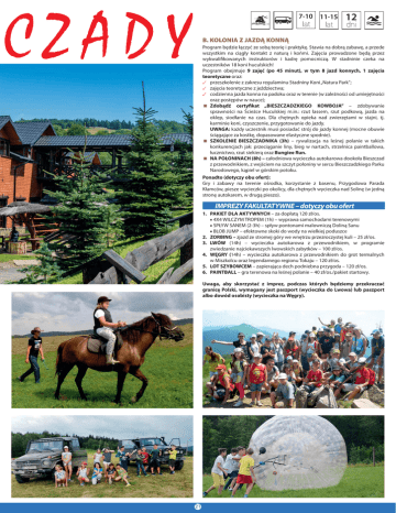7-10 11-15 12 B. KOLONIA Z JAZDĄ KONNĄ Program będzie łączyć ze sobą teorię i praktykę. Stawia na dobrą zabawę, a przede wszystkim na ciągły kontakt z naturą i końmi. Zajęcia prowadzone będą przez wykwalifikowanych instruktorów i kadrę pomocniczą. W stadninie czeka na uczestników 18 koni huculskich! Program obejmuje 9 zajęć (po 45 minut), w tym 8 jazd konnych, 1 zajęcia teoretyczne oraz: ✓ przeszkolenie z zakresu regulaminu Stadniny Koni „Natura Park”; ✓ zajęcia teoretyczne z jeździectwa; ✓ codzienna jazda konna na padoku oraz w terenie (w zależności od umiejętności oraz postępów w nauce); Zdobądź certyfikat „BIESZCZADZKIEGO KOWBOJA” – zdobywanie sprawności na Ścieżce Huculskiej m.in.: rzut lassem, rzut podkową, jazda na oklep, siodłanie na czas. Dla chętnych opieka nad zwierzętami w stajni, tj. karminie koni, czyszczenie, przygotowanie do jazdy. UWAGA: każdy uczestnik musi posiadać strój do jazdy konnej (mocne obuwie ściągające za kostkę, dopasowane elastyczne spodnie). SZKOLENIE BIESZCZADNIKA (3h) – rywalizacja na leśnej polanie w takich konkurencjach jak: przeciąganie liny, bieg w nartach, strzelnica paintballowa, łucznictwo, rzut siekierą oraz Bungiee Run. NA POŁONINACH (8h) – całodniowa wycieczka autokarowa dookoła Bieszczad z przewodnikiem, z wejściem na szczyt połoniny w sercu Bieszczadzkiego Parku Narodowego, kąpiel w górskim potoku. Ponadto (dotyczy obu ofert): Gry i zabawy na terenie ośrodka, korzystanie z basenu, Przygodowa Parada Kłamców, piesze wycieczki po okolicy, dla chętnych wycieczka nad Solinę (w jedną stronę autokarem, w drugą pieszo). IMPREZY FAKULTATYWNE – dotyczy obu ofert 1. PAKIET DLA AKTYWNYCH – za dopłatą 120 zł/os. ■ 4X4 WILCZYM TROPEM (1h) – wyprawa samochodami terenowymi ■ SPŁYW SANEM (2-3h) – spływ pontonami malowniczą Doliną Sanu ■ BLOB JUMP – efektowne skoki do wody na wielkiej poduszce 2. ZORBING – zjazd ze stromej góry we wnętrzu przezroczystej kuli – 25 zł/os. 3. LWÓW (14h) – wycieczka autokarowa z przewodnikiem, w programie zwiedzanie najciekawszych lwowskich zabytków – 100 zł/os. 4. WĘGRY (14h) – wycieczka autokarowa z przewodnikiem do grot termalnych w Miszkolcu oraz legendarnego regionu Tokaju – 120 zł/os. 5. LOT SZYBOWCEM – zapierająca dech podniebna przygoda – 120 zł/os. 6. PAINTBALL – gra terenowa na leśnej polanie – 40 zł/os./pakiet startowy. Uwaga, aby skorzystać z imprez, podczas których będziemy przekraczać granicę Polski, wymagany jest paszport (wycieczka do Lwowa) lub paszport albo dowód osobisty (wycieczka na Węgry). 21