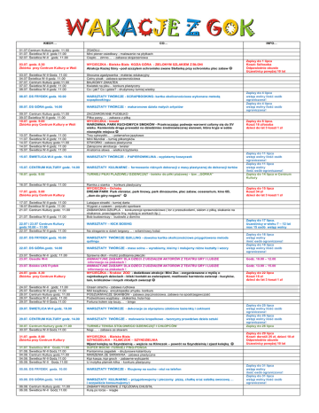 KIEDY… CO… 01.07.Centrum Kultury godz. 11.00 01.07. Świetlica W-II godz.11.00 02.07. Świetlica W-II godz. 11.00 ZGADUJ… Mini plener osiedlowy - malowanie na płytkach Ciepło… zimno… - zabawa skojarzeniowa 03.07. godz. 8.30 Zbiórka przy Centrum Kultury w Woli WYCIECZKA - Bielsko Biała KOZIA GÓRA - ZIELONYM SZLAKIEM Z BŁONI Atrakcja Koziej Góry –pod szczytem schronisko zwane Stefanką przy schronisku plac zabaw 03.07. Świetlica W-II Godz. 11.00 04.07 Świetlica W-II godz. 11.00 07.07. Centrum Kultury godz.11.00 07.07. Świetlica W-II godz. 11.00 08.07. Świetlica W-II godz. 11.00 Skoczna zgadywanka - materac edukacyjny Celny pisak - zabawa sprawnościowa BAJKOWY ZAKĄTEK Kwiatek na piku - konkurs plastyczny Co i jak? Co i gdzie? - drużynowy turniej wiedzy 08.07. DS FRYDEK godz. 10.00 WARSZTATY TWÓRCZE - SCRAPBOOKING- kartka okolicznościowa wykonana metodą scpapbookingu 08.07. DS GÓRA godz. 14.00 WARSZTATY TWÓRCZE - makaronowe dzieła małych artystów 09.07. Centrum Kultury godz.11.00 09.07.Świetlica W-II godz. 11.00 10.07. godz. 9.00 Zbiórka przy Centrum Kultury w Woli 10.07. Świetlica W-II godz. 11.00 11.07. Świetlica W-II godz. 11.00 14.07. Centrum Kultury godz.11.00 14.07. Świetlica W-II godz. 11.00 15.07. Świetlica W-II godz. 11.00 ZACZAROWANE PUDEŁKO Piłka parzy… - zabawa z piłką WYCIECZKA - Inwałd WAROWNIA, PARK RUCHOMYCH SMOKÓW - Przekraczając podwoje warowni cofamy się do XV wieku. Kamienista droga prowadzi na dziedziniec średniowiecznej warowni, która kryje w sobie niezwykłe miejsca Trzy cytrzystki… - połamańce językowe Mini Mundial - turniej piłkarzyków STWORKI - zabawa plastyczna Zakręcone akrobacje - twister Anatomia słowa - wielka krzyżówka 15.07. ŚWIETLICA W-II godz. 10.00 WARSZTATY TWÓRCZE - PAPIEROWIKLINA - wyplatamy koszyczek 15.07. CENTRUM KULTURY godz. 14.00 WARSZTATY KULINARNE - formowanie różnych dekoracji z masy plastycznej do dekoracji tortów 16.07. godz. 9.00 TURNIEJ PIŁKI PLAŻOWEJ DZIEWCZĄT - boisko do piłki plażowej – tzw. „GÓRKA” 16.07. Świetlica W-II godz. 11.00 Ramka z sianka - konkurs plastyczny WYCIECZKA – Ochaby DREAM PARK Park miniatur, park linowy, park dinozaurów, plac zabaw, oceanarium, kino 6D, „dom do góry nogami” 17.07. godz. 9.00 Zbiórka przy Centrum Kultury 17.07. Świetlica W-II godz. 11.00 18.07.Świetlica W-II godz. 11.00 21.07. Centrum Kultury godz. 11.00 21.07. Świetlica W-II godz. 11.00 WARSZTATY – KICK BOXING 22.07. DS FRYDEK godz. 10.00 WARSZTATY TWÓRCZE QUILLING - dowolna kartka okolicznościowa przygotowana metoda qullingu 22.07. DS GÓRA godz. 14.00 WARSZTATY TWÓRCZE - masa solna – wyrabiamy, kleimy i malujemy różne kształty i wzory 23.07. Świetlica W-II godz. 11.00 23.07. Osiedle W-II Sprawna dłoń - mistrz podbijania piłeczki ANIMACYJNE ZABAWY DLA DZIECI Z UDZIAŁEM AKTORÓW Z TEATRU GRY I LUDZIE informacje na plakatach ! ANIMACYJNE ZABAWY DLA DZIECI Z UDZIAŁEM AKTORÓW Z TEATRU GRY I LUDZIE informacje na plakatach ! WYCIECZKA – Kraków ZOO - dodatkowe atrakcje: Mini Zoo - zorganizowane z myślą o najmłodszych dzieciach - bliski kontakt ze zwierzętami, możliwość karmienia zwierząt - kucyków, lam, króliczków i innych młodych zwierząt 24.07. godz. 8.30 Zbiórka przy Centrum Kultury Zapisy do 4 lipca wstęp wolny ilość osób ograniczona! Zapisy do 4 lipca wstęp wolny ilość osób ograniczona! Zapisy do 8 lipca. Koszt 16 zł/osoba dzieci do lat 3 koszt 1 zł Zapisy do 11 lipca wstęp wolny ilość osób ograniczona! Zapisy do 11 lipca wstęp wolny ilość osób ograniczona! Zapisy do 14 lipca w Centrum Kultury Zapisy do 15 lipca Koszt 34 zł dzieci do lat 3 koszt 1 zł Zapisy do 17 lipca. Uczestnicy w wieku 7 – 12 lat max 15 osób wstęp wolny Na straganie w dzień targowy… - witaminowy kolaż 24.07. Świetlica W-II godz. 11.00 25.07. Świetlica W-II godz. 11.00 28.07. Centrum Kultury godz. 11.00 28.07. Świetlica W-II godz. 11.00 29.07. Świetlica W-II Godz.11.00 Ocean strachu - zabawa ruchowa Mól książkowy- encyklopedia umysłu- konkurs POSZUKIWACZE SKARBÓW - zabawa zręcznościowa, zabawa na spostrzegawczość Podwórkowe wygibasy - skakanka, hula-hop Fortuna kołem się toczy… - bingo 29.07. ŚWIETLICA W-II godz. 10.00 WARSZTATY TWÓRCZE - dekoracje ze styropianu zdobione tasiemką i cekinami 29.07. CENTRUM KULTURY godz. 14.00 WARSZTATY TWÓRCZE - malowanie kropelkowe - tworzymy prawdziwe dzieła sztuki 30.07. Centrum Kultury godz.11.00 30.07. Świetlica W-II Godz.11.00 TURNIEJ TENISA STOŁOWEGO DZIEWCZĄT I CHŁOPCÓW Nogi… - zabawa ze słowem 31.07. godz. 8.00 Zbiórka przy Centrum Kultury 31.07. Świetlica W-II Godz.11.00 01.08. Świetlica W-II Godz.11.00 04.08. Centrum Kultury godz.11.00 04.08. Świetlica W-II Godz.11.00 05.08. Świetlica W-II Godz.11.00 WYCIECZKA - Bielsko Biała SZYNDZIELNIA – KLIMCZOK – SZYNDZIELNIA Wjazd kolejką na Szyndzielnię – wejście na Klimczok – powrót na Szyndzielnię i zjazd kolejką SUPER MOCNI -TURNIEJ PING-PONGA Pantomima zagadek - drużynowe kalambury MARZENIA ZE SKRAWKA - zabawa plastyczna Kipi kasza, kipi groch - zabawne wyliczanki U motylka plamek kilka - konkurs plastyczny 05.08. DS FRYDEK godz. 10.00 WARSZTATY TWÓRCZE - filcujemy na sucho - etui na telefon 05.08. DS GÓRA godz. 14.00 WARSZTATY KULINARNE – przygotowujemy i pieczemy pizzę, chałkę oraz sałatkę owocową … i oczywiście konsumujemy:) ZABAWY RUCHOWE Z TĘCZOWĄ CHUSTĄ Kulą po torze - kręgle 06.08. Centrum Kultury godz. 11.00 06.08. Świetlica W-II Godz.11.00 Zapisy do 1 lipca Koszt: 5zł/osoba Odpowiednie obuwie Uczestnicy powyżej 10 lat Latające strzałki - turniej darta Wygrać z czasem - potyczki sportowe ZABAWOWA DZIUPLA - konkurencje sprawnościowe ( tor z przeszkodami, slalom z piłką, skakanie na skakance, przeciąganie liny, wyścig w workach itp.) Bob budowniczy - budowle z domino 22.07 i 23.07 Centrum Kultury godz.10.00 – 11.00 22.07. Świetlica W-II godz. 11.00 23.07.