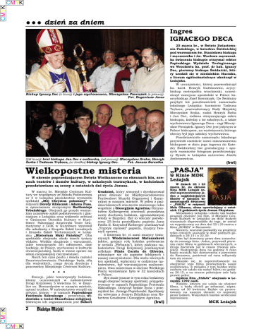 CMYK CMYK ••• dzień za dniem Ingres IGNACEGO DECA Biskup Ignacy Dec (z lewej) i jego wychowawca, Mieczysław Pieniążek (z prawej). Fot. Eugeniusz Josse (Od lewej): brat biskupa Jan Dec z małżonką, (od prawej): Mieczysław Sroka, Henryk Świta i Tadeusz Trębacz, (w środku) biskup Ignacy Dec. Fot. Janusz Berestka Wielkopostne misteria ● ● ● CMYK Emocje, jakie towarzyszyły ludziom, którzy uczestniczyli w nabożeństwie Drogi Krzyżowej 5 kwietnia br. w Bazylice oo. Bernardynów w naszym mieście, opisać trudno. W nabożeństwo wtopili się artyści, którzy – w ramach Papieskiego Festiwalu Sakralnego – prezentują widowiska o treści filozoficzno-religijnej. Głównym ich organizatorem jest Robert CMYK 2 (bwl) „PASJA” W okresie poprzedzającym Święta Wielkanocne na ekranach kin, scenach teatrów i domów kultury, w szkolnych teatrzykach, w kościołach przedstawiane są sceny z ostatnich dni życia Jezusa. W marcu br. Miejskie Centrum Kultury we współpracy ze Szkołą Podstawową nr 2 w Leżajsku pięciokrotnie wystawiło spektakl „Mój Chrystus połamany” w reżyserii Doroty Klimczak i Adama Fusa, w opracowaniu muzycznym Bartłomieja Urbańskiego. Obejrzeli go przede wszystkim uczniowie szkół podstawowych i gimnazjum z Leżajska oraz widzowie zebrani w Gminnym Ośrodku Kultury w Kuryłówce. Natomiast Amatorski Teatr Dramatyczny z GOK w Kuryłówce wystawił dla młodzieży z Zespołu Szkół Licealnych i Zespołu Szkół Technicznych w Leżajsku „Misterium Męki Pańskiej”. Oba spektakle obejrzało około trzech tysięcy widzów. Wielkie skupienie i wzruszenie, jakie towarzyszyło ich odbiorowi, daje nadzieję, że Polacy, wychowani w kulturze chrześcijańskiej, będą w stanie oprzeć się siłom niespokojnej rzeczywistości. Niech ten czas postu i święta radości Zmartwychwstania Pańskiego będą siłą dla wszystkich, czego życzą dyrekcja i pracownicy Miejskiego Centrum Kultury. 25 marca br., w Święto Zwiastowania Pańskiego, w katedrze Świdnickiej pod wezwaniem św. Stanisława biskupa i męczennika i św. Wacława męczennika święcenia biskupie otrzymał rektor Papieskiego Wydziału Teologicznego we Wrocławiu ks. prof. dr hab. Ignacy Dec, pierwszy biskupa Świdnicki, który urodził się w niedalekim Hucisku, a liceum ogólnokształcące ukończył w Leżajsku. W uroczystości, której przewodniczył ks. kard. Henryk Gulbinowicz, arycybiskup metropolita wrocławski, uczestniczył nuncjusz apostolski w Polsce ks. arcybiskup Józef Kowalczyk. Do Świdnicy przybyli też przedstawiciele samorządu lokalnego Leżajska: burmistrz Tadeusz Trębacz, przewodniczący Rady Miejskiej Mieczysław Sroka, radni Henryk Świta i Jan Dec, rodzina otrzymującego sakrę biskupią, koledzy z lat szkolnych, a także wychowawca Ignacego Deca – mgr Mieczysław Pieniążek. Ignacy Dec jest jedynym w Polsce biskupem, na wyświęceniu którego obecny był jego szkolny wychowawca. Przedstawiciele samorządu lokalnego przywieźli osobiście nowo mianowanemu biskupowi w dniu jego ingresu do Katedry Świdnickiej list gratulacyjny i sporych rozmiarów fotogram przedstawiający Rynek w Leżajsku autorstwa Józefa Ambrozowicza. Grudzień, który stworzył i dyrektorował przez dziesięć lat Międzynarodowemu Festiwalowi Muzyki Organowej i Kameralnej w naszym mieście. W jeden z październikowych wieczorów minionego roku wspólnie z Gieorgijem Agratiną i Krzysztofem Kolbergerem stworzyli prawdziwą ucztę duchową ludziom, zgromadzonym wtedy w Bazylice. Był to wieczór poświęcony 25-leciu pontyfikatu papieża Jana Pawła II. Krzysztof Kolberger przekazywał „Tryptyk rzymski” papieża, muzycy tworzyli oprawę. 5 kwietnia br. ci sami muzycy towarzyszyli Włodzimierzowi Matuszakowi (aktor, grający rolę księdza proboszcza w serialu „Plebania”), który podczas nabożeństwa Drogi Krzyżowej przekazywał refleksje Plinio Corrêa de Oliveira, odnoszące się do zapisów biblijnych i naszej rzeczywistości. Dla wielu wiernych ten spektakl, wpleciony w codzienne nabożeństwo, był wzruszającym zaskoczeniem. Owo misterium w okresie Wielkiego Postu wystawiane było w 32 kościołach w Polsce. Być może jeszcze w tym roku będziemy mogli obejrzeć kolejny spektakl, przygotowywany w ramach Papieskiego Festiwalu Sakralnego. Dotyczył będzie życia i przemyśleń ks. Jerzego Popiełuszki. Spotkamy się wówczas z Jerzym Zelnikiem oraz Robertem Grudniem i Georgijem Agratiną. (bwl) w Kinie MDK Leżajsk W dniach 22 i 23 marca br. na ekranie Kina MDK Leżajsk został zaprezentowany jeden z najgłośniejszych filmów w dziejach kinematografii światowej – „PASJA” w reżyserii Mela Gibsona, obraz opowiadający o ostatnich 12 godzinach życia Jezusa Chrystusa. Mieszkańcy Leżajska i okolic tak bardzo pragnęli obejrzeć ten film, iż Miejskie Centrum Kultury w Leżajsku po dość dużych staraniach doprowadziło do tego, że został on wypożyczony na dwa dni 22 i 23 marca z Kina „ZORZA” w Rzeszowie. Niestety, warunki pozwoliły na projekcję tylko czterech seansów w dość późnych godzinach o 20.15 i o 22.30. Film był dowożony przez dwa samochody do naszego kina. Jeden, przywoził pierwszą część filmu w godzinach wieczornych, a druga docierała już w czasie trwania projekcji. Następnego dnia na godzinę 8 rano kopia musiała być dostarczona z powrotem do Rzeszowa, ponieważ od rana odbywały tam się seanse. Okazało się, że zapotrzebowanie na obejrzenie tego filmu przewyższyło nasze oczekiwania, w związku z tym bardzo wielu osobom nie udało się nabyć biletu na godzinę 20.15, a na seanse późniejsze sale były prawie pełne. Ogółem film „PASJA” obejrzało w Leżajsku 1292 osób. Widzów, którym nie udało się obejrzeć filmu, a będą chcieli go zobaczyć, zapraszamy od 30 kwietnia. Będzie on prezentowany na naszym ekranie co najmniej przez tydzień. Wszystkich bardzo serdecznie zapraszamy. MCK Leżajsk dzień za dnie