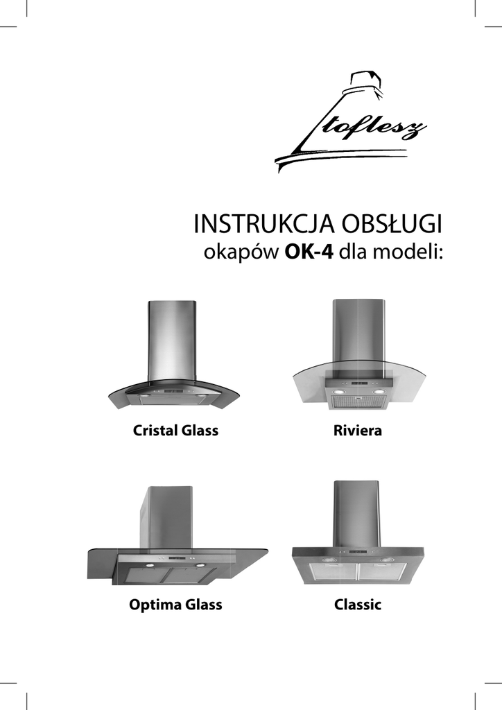 INSTRUKCJA OBSŁUGI okapów OK-4 dla modeli: Cristal Glass Riviera Optima Glass Classic Szanowny Kliencie Staliście się Państwo użytkownikami okapu kuchennego model OK - 4. Okap ten został zaprojektowany i wykonany specjalnie z myślą o spełnieniu Państwa oczekiwań i z pewnością będzie stanowić część nowocześnie wyposażonej kuchni. Zastosowane w nim nowoczesne rozwiązania konstrukcyjne i użycie najnowszej technologii produkcji, zapewniają mu wysoką funkcjonalność i estetykę. Przed przystąpieniem do montażu okapu prosimy o dokładne zapoznanie się z treścią niniejszej instrukcji. Dzięki temu unikną Państwo błędnej instalacji i obsługi okapu. Życzymy satysfakcji i zadowolenia z wyboru okapu firmy Toflesz. CHARAKTERYSTYKA Okap kuchenny służy do usuwania oparów kuchennych. Jest on przeznaczony do użytku domowego. Okap wymaga zainstalowania przewodu odprowadzającego powietrze na zewnątrz. Po zainstalowaniu filtra z węglem aktywnym okap może pracować jako pochłaniacz zapachów. W tym przypadku nie wymaga się instalacji przewodu odprowadzającego powietrze na zewnątrz. Okap ten jest urządzeniem elektrycznym wykonanym w I klasie ochrony przeciwporażeniowej. Posiada niezależne oświetlenie LEDowe oraz turbinę wyciągową z możliwością ustawienia jednej z trzech prędkości obrotowych. Okap przeznaczony jest do trwałego zamontowania na pionowej ścianie ponad kuchenką gazową lub elektryczną. Okap OK-4 CRISTAL GLASS DANE TECHNICZNE Napięcie zasilania: Ilość silników wentylatora: Ilość filtrów aluminiowych: Oświetlenie: Ilość stopni prędkości: Szerokość: Średnica wylotu: Maksymalna wydajność: Maksymalny pobór mocy: Poziom głośności: Rodzaj pracy: 2 200-230V ~50Hz 1 2 LED 2 x 2,5 W 6 600 / 900 mm ø 150 mm lub ø 120 mm 650 m3/h 145 W 30 – 56 dB(A) wyciąg lub pochłaniacz Okap OK-4 RIVIERA 3 WARUNKI EKSPLOATACJI – Okap kuchenny służy do usuwania oparów kuchennych na zewnątrz, należy go zatem podłączyć do odpowiedniego kanału wentylacyjnego (nie wolno podłączać okapu do kanałów kominowych, dymowych lub spalinowych będących w eksploatacji). – Urządzenie należy zamontować na wysokości nie niższej niż 650 mm od elektrycznej płyty kuchennej i 700 mm od kuchni gazowej. – Pod okapem nadkuchennym nie wolno pozostawiać odkrytego płomienia; podczas zdejmowania naczyń znad palnika, należy ustawić płomień minimalny. – Potrawy przygotowywane na tłuszczach powinny być stale nadzorowane, ponieważ nagrzany tłuszcz może się łatwo zapalić. – Filtr przeciwtłuszczowy do okapu kuchennego należy czyścić przynajmniej raz na dwa miesiące gdyż nasycony tłuszczem jest łatwopalny. – Przed każdą operacją czyszczenia, wymianą filtra lub przed podjęciem prac naprawczych należy wyjąć wtyczkę urządzenia z gniazdka elektrycznego. – Jeżeli w pomieszczeniu, oprócz okapu, eksploatuje się inne urządzenia o zasilaniu nieelektrycznym (np. grzejniki przepływowe, piece na paliwa ciekłe, termy) należy zadbać o wystarczającą Okap OK-4 OPTIMA GLASS wentylację (dopływ świeżego powietrza). MONTAŻ Przed przystąpieniem do montażu okapu na ścianie należy podłączyć go do sieci elektrycznej (200-230V ~50Hz) w celu sprawdzenia czy oświetlenie i silnik działają prawidłowo. W celu zamontowania okapu należy wykonać następujące czynności: 1. Zawiesić korpus okapu na wkręconych uprzednio w ścianę kołkach rozporowych (ø 8 mm). 2. Podłączyć okap do otworu odprowadzającego powietrze na zewnątrz za pomocą elastycznego przewodu o średnicy ø 150 mm. Można też zamontować rurę o węższej średnicy ø 120 mm, w tym celu na wylot turbiny trzeba założyć dołączoną redukcję. 3. Jeżeli okap ma pracować jako pochłaniacz zapachów należy zainstalować filtry węglowe pomijając punkt 2). 4 Okap OK-4 CLASSIC 5 4. W odległości kilku centymetrów poniżej sufitu należy przykręcić do ściany opaskę łączeniową komina Obsługa panelu sterowania używając do tego celu wkrętów i kołków rozporowych. 5. W zależności od potrzeb włożyć do komina zewnętrznego komin wewnętrzny i zainstalować je na Działanie okapu jest kontrolowane za pomocą elektronicznego przełącznika dotykowego: korpusie okapu, następnie wysunąć komin wewnętrzny na wybraną wysokość. Górę komina należy przykręcić blachowkrętami do opaski łączeniowej. 6. Podłączyć okap do sieci elektrycznej. Po zainstalowaniu okapu powinien być zapewniony w miarę łatwy dostęp do gniazda elektrycznego w celu awaryjnego wyjęcia wtyczki i przerwania zasilania urządzenia. Sensory przełącznika reagują na dotkniecie palcem oznaczonej za pomocą piktogramów powierzchni szkła na panelu przednim okapu. WYBÓR TRYBU PRACY OKAPU KUCHENNEGO i – Oznaczenia służą do uruchomienia / wyłączenia wentylatora okapu oraz do wyboru pręd- Ustawienie wyciągowego trybu pracy urządzenia kości jego pracy w przedziale od 0 do 6, piktogramy te wykorzystane będą również do ustawiania W trakcie wyciągowego trybu pracy okapu powietrze odprowadzane jest na zewnątrz specjalnym przewodem (ø 150 mm lub ø 120 mm). Przy tym ustawieniu należy usunąć ewentualne filtry węglowe. funkcji „Timer” oraz bieżącego czasu. – Symbol Ustawienie trybu pracy okapu jako pochłaniacz zapachów – Wyświetlacz informuje o wybranej prędkości pracy turbiny okapu oraz o trybie pracy urządzenia, W tej opcji przefiltrowane powietrze wraca z powrotem do pomieszczenia poprzez obustronne otwory wycięte w górnej części maskownicy teleskopowej okapu. Przy tym ustawieniu należy zamontować filtry węglowe. służy do obsługi funkcji „Timer” oraz zaprogramowania bieżącego czasu. w niektórych sytuacja wyświetlany jest również bieżący czas. – Dotkniecie piktogramu zwiększa prędkość pracy wentylatora. – Dotkniecie piktogramu zmniejsza prędkość pracy wentylatora. Prędkość wen