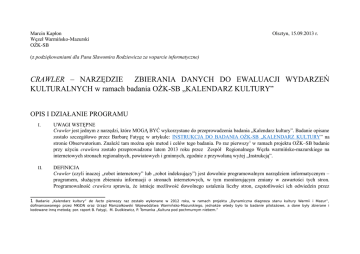 Marcin Kapłon Węzeł Warmińsko-Mazurski OŻK-SB Olsztyn, 15.09.2013 r. (z podziękowaniami dla Pana Sławomira Rodziewicza za wsparcie informatyczne) CRAWLER – NARZĘDZIE ZBIERANIA DANYCH DO EWALUACJI WYDARZEŃ KULTURALNYCH w ramach badania OŻK-SB „KALENDARZ KULTURY” OPIS I DZIAŁANIE PROGRAMU 1 I. UWAGI WSTĘPNE Crawler jest jednym z narzędzi, które MOGĄ BYĆ wykorzystane do przeprowadzenia badania „Kalendarz kultury”. Badanie opisane zostało szczegółowo przez Barbarę Fatygę w artykule: INSTRUKCJA DO BADANIA OŻK-SB „KALENDARZ KULTURY” na stronie Obserwatorium. Znaleźć tam można opis metod i celów tego badania. Po raz pierwszy 1 w ramach projektu OŻK–SB badanie przy użyciu crawlera zostało przeprowadzone latem 2013 roku przez Zespół Regionalnego Węzła warmińsko-mazurskiego na internetowych stronach regionalnych, powiatowych i gminnych, zgodnie z przywołaną wyżej „Instrukcją”. II. DEFINICJA Crawler (czyli inaczej „robot internetowy” lub „robot indeksujący”) jest dowolnie programowalnym narzędziem informatycznym – programem, służącym zbieraniu informacji o stronach internetowych, w tym monitorującym zmiany w zawartości tych stron. Programowalność crawlera sprawia, że istnieje możliwość dowolnego ustalenia liczby stron, częstotliwości ich odwiedzin przez Badanie „Kalendarz kultury” de facto pierwszy raz zostało wykonane w 2012 roku, w ramach projektu „Dynamiczna diagnoza stanu kultury Warmii i Mazur”, dofinansowanego przez MKiDN oraz Urząd Marszałkowski Województwa Warmińsko-Mazurskiego, jednakże wtedy było to badanie pilotażowe, a dane były zbierane i kodowane inną metodą; por. raport B. Fatygi, M. Dudkiewicz, P. Tomanka „Kultura pod pochmurnym niebem.” crawlera, słów kluczowych poszukiwanych przez program w treści stron oraz sposobu raportowania zdobytych w ten sposób informacji. III. RODZAJE STRON INTERNETOWYCH Podczas badania koncentrowano się na stronach, mogących zawierać zapowiedzi i relacje z wydarzeń kulturalnych. Do tabeli „sites” (patrz niżej) wprowadzono adresy 400 serwisów internetowych, zwyczajowo prezentujących bieżące informacje m.in. z życia kulturalnego. Przede wszystkim były to strony internetowych wydań regionalnych i lokalnych gazet, regionalne strony radia i telewizji, strony instytucji kultury o zasięgu regionalnym i lokalnym, takich jak gminne ośrodki kultury i biblioteki gminne, a także portale turystyczne. Do badania wykorzystane zostały również wszystkie oficjalne strony urzędów gmin i powiatów. IV. BUDOWA Do napisania programu użyto języka skryptowego PHP. Wszystkie dane zostały zagregowane w bazie danych MySQL. Baza ta składa się z czterech tabel: 1. „Sites” czyli strony, a właściwie serwisy lub portale internetowe Tabela zawiera adresy sprawdzanych przez crawlera serwisów internetowych w układzie powiatowym. Tabela tego rodzaju musi zostać przygotowana nad wyraz starannie przez badacza. Szczególnie ważne jest, by odpowiednio przypisać poszczególne adresy stron konkretnym powiatom, gdyż otrzymane dzięki takiemu układowi wyniki znacznie ułatwią późniejsze kodowanie, analizę i interpretację zebranego materiału. W badaniu, przeprowadzonym w województwie warmińsko-mazurskim na przełomie lipca i sierpnia 2013 roku tabela – zgodnie z tym, co wskazałem wyżej - zawierała 400 wpisów. Przykład wpisu w tabeli: (szczycieński)www.wbp.olsztyn.pl/~gbpdzwierzuty/ 2. „Keywords” – czyli słowa kluczowe Tabela zawiera listę słów kluczowych, których robot szuka na wybranych stronach. Na potrzeby badania zidentyfikowano i wprowadzono do tabeli 50 słów kluczowych, których można było potencjalnie użyć do opisu wydarzeń kulturalnych. Wykorzystano następujące słowa lub grupy słów: artystyczny, artysta, biesiada, dożynki, festiwal, festival, festyn, impreza, impreza artystyczna, impreza rozrywkowa, inscenizacja, jarmark, kiermasz, koncert, literacki, malarstwo, muzyka, muzyczna, piknik , plener, poezja, potańcówka, premiera, premierowy , projekcja filmu, publiczność, raut, recital, rzeźba, seans filmowy, pokaz filmowy, spektakl teatralny, spektakl, spotkanie autorskie, święto, sceniczny, pokaz tańca, turniej tańca, turniej, uczestnicy, warsztaty artystyczne, wernisaż, widowisko, widownia, wydarzenie artystyczne, wystawa, występ estradowy, zabawa, zespół artystyczny, zespół estradowy. Rzecz jasna, wyrażenia te nie wyczerpują treści wydarzeń kulturalnych, jednakże uznane one zostały za wystarczająco wskaźnikowe do odszukania właściwych stron. 3. „Pages” - czyli strony Tabela zawiera listę adresów wszystkich stron i podstron w serwisach odwiedzonych przez crawlera. W badaniu w województwie warmińsko-mazurskim zebranych zostało N= 72.712 wpisów. 4. „Pages_to_send” – czyli strony raportowane. W tabeli tej zawarto adresy stron i podstron, na których znaleziono co najmniej jedno słowo kluczowe. Z efektów tych poszukiwań były generowane i codziennie wysłane raporty. W ciągu 30 dni badania na Warmii i Mazurach zebrano w tej tabeli N= 18.015 wpisów. V. Działanie crawlera Proces przeszukiwania stron i wysyłania codziennych raportów składał się z trzech etapów. Za każdy etap odpowiadał oddzielny skrypt. 1. W pierwszym etapie crawler miał za zadanie odwiedzić i pobierać strony główne wszystkich serwisów zawartych w tabeli „sites”. Następnie identyfikował i zapisywał wszystkie odnośniki, a następnie porównywał je z odnośnikami zapisanymi w tabeli „pages”. Jeżeli danego odnośnika jeszcze nie było w tabeli „pages” (bo pojawiła się w serwisie nowa podstrona z nową informacją), to był on do niej dodawany z odpowiednim statusem, określającym, że jest to nowy adres, który będzie trzeba odwiedzić. Serwisy były odwiedzane kilka razy dziennie w odstępach 2-3 godzin. Dzięki temu zadaniu crawler potrafił przeszukać wszystkie 