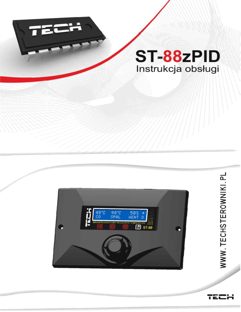 ST-88zPID – instrukcja obsługi TECH Deklaracja zgodności nr 35/2010 Firma TECH, z siedzibą w Wieprzu 1047A, 34-122 Wieprz, deklaruje z pełną odpowiedzialnością, że produkowany przez nas termoregulator ST-88 230V, 50Hz spełnia wymagania Rozporządzenia Ministra Gospodarki Pracy i Polityki Społecznej. (Dz.U. Nr 155, poz. 1089) z dnia 21 sierpnia 2007 r., wdrażającego postanowienia Dyrektywy Niskonapięciowej (LVD) 2006/95/WE z dnia 16.01.2007 r. Sterownik ST-88 kompatybilności EMC przeszedł pozytywnie badania przy podłączeniu optymalnych obciążeń. Do ocen zgodności zastosowano normy zharmonizowane PN-EN 60730-2-9:2006. -2- ST- 88zPID – instrukcja obsługi URZĄDZENIE UWAGA! ELEKTRYCZNE POD NAPIĘCIEM! Przed dokonaniem jakichkolwiek czynności związanych z zasilaniem (podłączanie przewodów, instalacja urządzenia, itp.) należy upewnić się, że regulator nie jest podłączony do sieci! Montażu powinna dokonać osoba posiadająca odpowiednie uprawnienia elektryczne Przed uruchomieniem sterownika należy dokonać pomiaru skuteczności zerowania silników elektrycznych, kotła, oraz pomiaru izolacji przewodów elektrycznych. -3- Nadmuch ST- 88zPID – instrukcja obsługi I. Opis Praca ręczna Nadmuch Pompa CO Pompa CWU Gałka impulsatora Regulator temperatury ST–88zPID przeznaczony jest do kotłów C.O. Steruje pompą obiegu wody C.O., pompą ciepłej wody użytkowej C.W.U. oraz nadmuchem (wentylatorem). Sterownik ST-88zPID jest regulatorem z sygnałem wyjściowym ciągłym wykorzystującym algorytm regulacji zPID. W tego typu sterowniku moc nadmuchu obliczana jest na podstawie pomiaru temperatury kotła i temperatury spalin mierzonej na wylocie kotła. Praca wentylatora odbywa się w sposób ciągły w czasie, a moc nadmuchu zależy bezpośrednio od mierzonej temperatury kotła, temperatury spalin i różnicy tych parametrów od ich wartości zadanych. Stabilne utrzymywanie temperatury zadanej bez zbędnych przeregulowań i oscylacji to zalety regulatora zPID. Stosując ten typ sterownika z czujnikiem wylotu spalin oszczędności w spalaniu paliwa mogą sięgać od kilku do kilkunastu procent; temperatura wody wyjściowej jest bardzo stabilna, co wpływa na dłuższą żywotność wymiennika (kotła). Kontrola temperatury spalin na wylocie kotła powoduje niską emisję pyłów i gazów szkodliwych dla środowiska. Energia cieplna ze -5- ST-88zPID – instrukcja obsługi spalin nie jest marnowana i wypuszczana do komina, lecz wykorzystywana do ogrzewania. Poniżej przedstawiamy wyniki badań przeprowadzonych z zastosowaniem sterownika Tech ze sterowaniem PID: oraz tego samego sterownika bez sterowania PID: Użytkownik dokonuje wszelkich zmian parametrów za pomocą gałki impulsatora. Pokręcanie gałki pozwala zaznaczyć żądaną funkcję lub zmienić jej wartość, natomiast naciśnięcie gałki powoduje wejście do danej funkcji lub potwierdzenie zmiany jej wartości. Aby wyjść z dowolnej funkcji należy pokręcając gałkę przejść do pozycji <<WYJŚCIE i potwierdzić wybór naciskając gałkę. -6- ST- 88zPID – instrukcja obsługi I.a) Pojęcia podstawowe Rozpalanie – cykl ten rozpoczyna się w momencie załączenia w menu sterownika funkcji rozpalanie i trwa do czasu, gdy temperatura kotła (C.O.) osiągnie wartość co najmniej 40oC (fabrycznie ustawiony próg rozpalania), pod warunkiem, że temperatura ta nie spadnie poniżej tej wartości przez 2 minuty (fabrycznie ustawiony czas rozpalania). Jeżeli warunki te zostaną spełnione, regulator przejdzie do trybu pracy a symbol pracy ręcznej na obudowie wyłączy się. W przypadku, gdy od załączenia funkcji rozpalanie sterownik nie osiągnie odpowiednich parametrów przejścia w tryb pracy w ciągu 30 minut, na wyświetlaczu pojawi się komunikat „Rozpalanie nieudane”. W takim przypadku należy rozpocząć cykl rozpalania od początku. Praca – po zakończeniu rozpalania regulator przechodzi w cykl pracy. Jest to podstawowy stan funkcjonowania regulatora, w którym nadmuch pracuje automatycznie według algorytmu zPID, oscylując wokół zadanej przez użytkownika temperatury. W menu użytkownika zamiast funkcji rozpalanie pojawi się pozycja wentylator. Wentylator można w razie potrzeby wyłączyć (na przykład podczas zasypywania opału). Jeżeli temperatura nieoczekiwanie wzrośnie o ponad 5oC powyżej zadanej, uruchamia się tzw. tryb nadzoru. Tryb nadzoru – tryb ten uruchomi się automatycznie, jeżeli w cyklu pracy temperatura wzrośnie o ponad 5oC powyżej zadanej. W takim przypadku, aby obniżyć temperaturę wody obiegowej, sterownik zmienia regulację PID na ustawienia manualne (wg. parametrów w menu instalatora). Wygaszanie – jeżeli temperatura na kotle spadnie o 2 oC poniżej progu rozpalania i nie wzrośnie powyżej tej wartości przez 30 minut (fabrycznie ustawiony czas wygaszania), to regulator przejdzie w stan wygaszania. W tym stanie nadmuch przestanie pracować a na wyświetlaczu pojawi się komunikat „Wygaszanie”. -7- ST-88zPID – instrukcja obsługi W przypadku zaniku napięcia termoregulator przestaje pracować. Po ponownym pojawieniu się zasilania sterownik powraca do pracy przy wcześniej ustawionych parametrach dzięki wbudowanej pamięci. Brak napięcia nie kasuje zapisanych parametrów termoregulatora. II. Funkcje regulatora Rozdział ten opisuje funkcje regulatora, sposób zmiany ustawień, oraz poruszania się po menu, które odbywa się za pomocą impulsatora (gałki). Na ekranie sterownika wyświetlane są parametry pracy kotła, w zależności od tego w jakim trybie będzie w danej chwili pracował kocioł. Dany tryb wybiera użytkownik kotła. II.a) Strona główna 42 Oc co | 55 Oc zadana Podczas normalnej pracy regulatora na wyświetlaczu LCD widoczna jest strona główna, na której wyświetlane są następujące informacje: ● Temperatura kotła (po lewej stronie wyświetlacza). ● Temperatura zadana (po prawej stronie wyświetlacza). ●