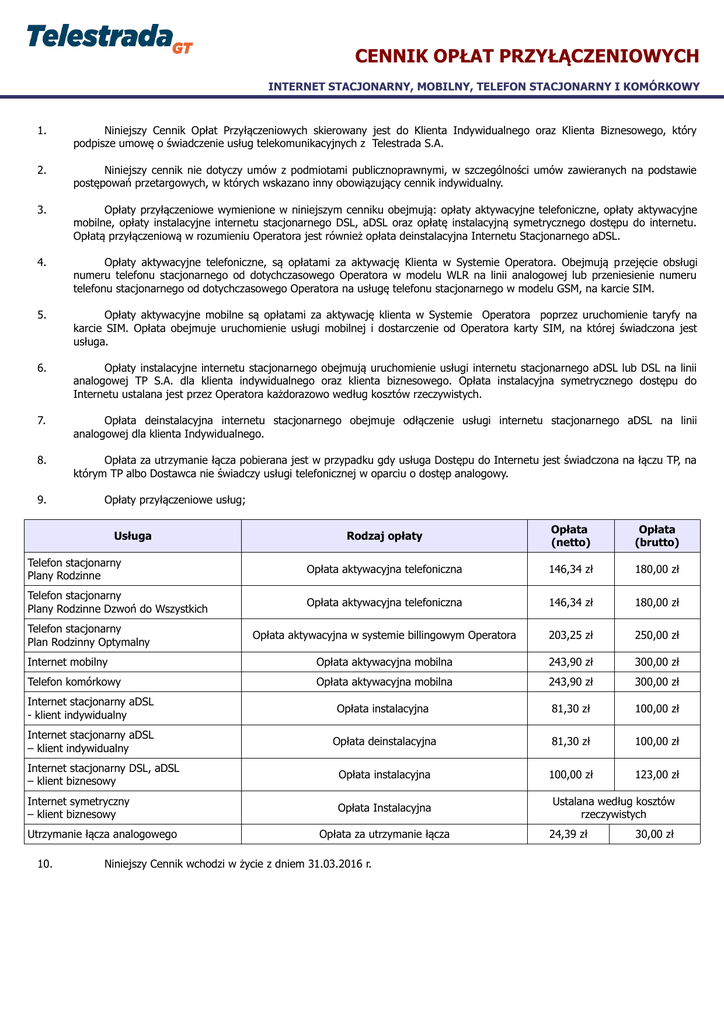 CENNIK OPŁAT PRZYŁĄCZENIOWYCH INTERNET STACJONARNY, MOBILNY, TELEFON STACJONARNY I KOMÓRKOWY 1. Niniejszy Cennik Opłat Przyłączeniowych skierowany jest do Klienta Indywidualnego oraz Klienta Biznesowego, który podpisze umowę o świadczenie usług telekomunikacyjnych z Telestrada S.A. 2. Niniejszy cennik nie dotyczy umów z podmiotami publicznoprawnymi, w szczególności umów zawieranych na podstawie postępowań przetargowych, w których wskazano inny obowiązujący cennik indywidualny. 3. Opłaty przyłączeniowe wymienione w niniejszym cenniku obejmują: opłaty aktywacyjne telefoniczne, opłaty aktywacyjne mobilne, opłaty instalacyjne internetu stacjonarnego DSL, aDSL oraz opłatę instalacyjną symetrycznego dostępu do internetu. Opłatą przyłączeniową w rozumieniu Operatora jest również opłata deinstalacyjna Internetu Stacjonarnego aDSL. 4. Opłaty aktywacyjne telefoniczne, są opłatami za aktywację Klienta w Systemie Operatora. Obejmują p rzejęcie obsługi numeru telefonu stacjonarnego od dotychczasowego Operatora w modelu WLR na linii analogowej lub przeniesienie numeru telefonu stacjonarnego od dotychczasowego Operatora na usługę telefonu stacjonarnego w modelu GSM, na karcie SIM. 5. Opłaty aktywacyjne mobilne są opłatami za aktywację klienta w Systemie Operatora poprzez uruchomienie taryfy na karcie SIM. Opłata obejmuje uruchomienie usługi mobilnej i dostarczenie od Operatora karty SIM, na której świadczona jest usługa. 6. Opłaty instalacyjne internetu stacjonarnego obejmują uruchomienie usługi internetu stacjonarnego aDSL lub DSL na linii analogowej TP S.A. dla klienta indywidualnego oraz klienta biznesowego. Opłata instalacyjna symetrycznego dostępu do Internetu ustalana jest przez Operatora każdorazowo według kosztów rzeczywistych. 7. Opłata deinstalacyjna internetu stacjonarnego obejmuje odłączenie usługi internetu stacjonarnego aDSL na linii analogowej dla klienta Indywidualnego. 8. Opłata za utrzymanie łącza pobierana jest w przypadku gdy usługa Dostępu do Internetu jest świadczona na łączu TP, na którym TP albo Dostawca nie świadczy usługi telefonicznej w oparciu o dostęp analogowy. 9. Opłaty przyłączeniowe usług; Rodzaj opłaty Opłata (netto) Opłata (brutto) Telefon stacjonarny Plany Rodzinne Opłata aktywacyjna telefoniczna 146,34 zł 180,00 zł Telefon stacjonarny Plany Rodzinne Dzwoń do Wszystkich Opłata aktywacyjna telefoniczna 146,34 zł 180,00 zł Opłata aktywacyjna w systemie billingowym Operatora 203,25 zł 250,00 zł Internet mobilny Opłata aktywacyjna mobilna 243,90 zł 300,00 zł Telefon komórkowy Opłata aktywacyjna mobilna 243,90 zł 300,00 zł Internet stacjonarny aDSL - klient indywidualny Opłata instalacyjna 81,30 zł 100,00 zł Internet stacjonarny aDSL – klient indywidualny Opłata deinstalacyjna 81,30 zł 100,00 zł Internet stacjonarny DSL, aDSL – klient biznesowy Opłata instalacyjna 100,00 zł 123,00 zł Internet symetryczny – klient biznesowy Opłata Instalacyjna Usługa Telefon stacjonarny Plan Rodzinny Optymalny Utrzymanie łącza analogowego 10. Opłata za utrzymanie łącza Niniejszy Cennik wchodzi w życie z dniem 31.03.2016 r. Ustalana według kosztów rzeczywistych 24,39 zł 30,00 zł