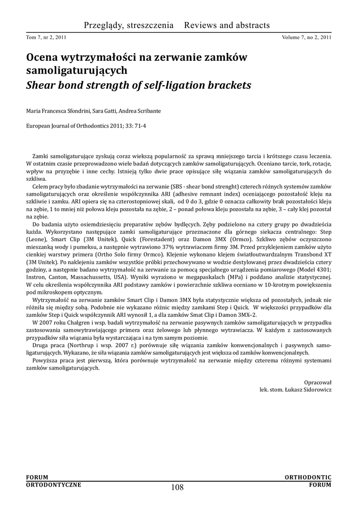 Przeglądy, streszczenia Reviews and abstracts Tom 7, nr 2, 2011 Volume 7, no 2, 2011 Ocena wytrzymałości na zerwanie zamków samoligaturujących Shear bond strength of self-ligation brackets Maria Francesca Sfondrini, Sara Gatti, Andrea Scribante European Journal of Orthodontics 2011; 33: 71-4 Zamki samoligaturujące zyskują coraz wiekszą popularność za sprawą mniejszego tarcia i krótszego czasu leczenia. W ostatnim czasie przeprowadzono wiele badań dotyczących zamków samoligaturujących. Oceniano tarcie, tork, rotacje, wpływ na przyzębie i inne cechy. Istnieją tylko dwie prace opisujące siłę wiązania zamków samoligaturujących do szkliwa. Celem pracy było zbadanie wytrzymałości na zerwanie (SBS - shear bond strenght) czterech różnych systemów zamków samoligaturujących oraz określenie współczynnika ARI (adhesive remnant index) oceniającego pozostałość kleju na szkliwie i zamku. ARI opiera się na czterostopniowej skali, od 0 do 3, gdzie 0 oznacza całkowity brak pozostałości kleju na zębie, 1 to mniej niż połowa kleju pozostała na zębie, 2 – ponad połowa kleju pozostała na zębie, 3 – cały klej pozostał na zębie. Do badania użyto osiemdziesięciu preparatów zębów bydlęcych. Zęby podzielono na cztery grupy po dwadzieścia każda. Wykorzystano następujące zamki samoligaturujące przeznaczone dla górnego siekacza centralnego: Step (Leone), Smart Clip (3M Unitek), Quick (Forestadent) oraz Damon 3MX (Ormco). Szkliwo zębów oczyszczono mieszanką wody i pumeksu, a następnie wytrawiono 37% wytrawiaczem firmy 3M. Przed przyklejeniem zamków użyto cienkiej warstwy primera (Ortho Solo firmy Ormco). Klejenie wykonano klejem światłoutwardzalnym Transbond XT (3M Unitek). Po naklejeniu zamków wszystkie próbki przechowywano w wodzie destylowanej przez dwadzieścia cztery godziny, a następnie badano wytrzymałość na zerwanie za pomocą specjalnego urządzenia pomiarowego (Model 4301; Instron, Canton, Massachussetts, USA). Wyniki wyrażono w megapaskalach (MPa) i poddano analizie statystycznej. W celu określenia współczynnika ARI podstawy zamków i powierzchnie szkliwa oceniano w 10-krotnym powiększeniu pod mikroskopem optycznym. Wytrzymałość na zerwanie zamków Smart Clip i Damon 3MX była statystycznie większa od pozostałych, jednak nie różniła się między sobą. Podobnie nie wykazano różnic między zamkami Step i Quick. W większości przypadków dla zamków Step i Quick współczynnik ARI wynosił 1, a dla zamków Smat Clip i Damon 3MX–2. W 2007 roku Chalgren i wsp. badali wytrzymałość na zerwanie pasywnych zamków samoligaturujących w przypadku zastosowania samowytrawiającego primera oraz żelowego lub płynnego wytrawiacza. W każdym z zastosowanych przypadków siła wiązania była wystarczająca i na tym samym poziomie. Druga praca (Northrup i wsp. 2007 r.) porównuje siłę wiązania zamków konwencjonalnych i pasywnych samoligaturujących. Wykazano, że siła wiązania zamków samoligaturujących jest większa od zamków konwencjonalnych. Powyższa praca jest pierwszą, która porównuje wytrzymałość na zerwanie między czterema różnymi systemami zamków samoligaturujących. Opracował lek. stom. Łukasz Sidorowicz ForumOrthodontic Ortodontyczneforum 108
