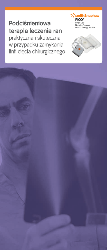 Podciśnieniowa terapia leczenia ran praktyczna i skuteczna w przypadku zamykania linii cięcia chirurgicznego Istnieje coraz więcej dowodów wspierających zastosowanie podciśnieniowej terapii ran (ang. Negative Pressure Wound Therapy, NPWT) w zamykaniu linii cięcia chirurgicznego. Stannard i wsp. (J Trauma 2006;60:1301-1306)1 wykazali zmniejszoną ilość wysięku i lepsze gojenie rany w obu krwiakach i liniach cięcia chirurgicznego po operacji stabilizacji złamań kości piętowej, złamań typu pilon i złamań plateau piszczeli w przypadku zastosowania tuż po operacji. Przyjmuje się, że usunięcie nadmiaru płynu śródmiąższowego z tkanki pourazowej może stanowić jeden z mechanizmów działania, dzięki któremu osiągnięto taki efekt. W innym badaniu Gomoll i wsp. (J Orthop Trauma 2006;20:705-707)2 rozpoczęli stosowanie systemu NPWT nad liniami cięcia, w przypadku których podejrzewali obecność przedłużonego wysięku oraz nad takimi, w przypadku których zabiegi wykonywano w obszarach narażonych na obrzęk po operacji. W tych przypadkach stwierdzono zmniejszoną konieczność zmian opatrunku, co obniżyło wykorzystanie limitowanych zasobów; i nie stwierdzono występowania infekcji w ranach z grupy wysokiego ryzyka. System PICO� poszerza możliwości System PICO jednorazowego użytku do terapii NPWT to nowoczesne wykorzystanie podciśnienia uzyskiwanego za pomocą wysoce elastycznego opatrunku3 podłączonego do przenośnej pompy kieszonkowej wielkości, który działa przez maksymalnie 7 dni.4 Dzięki prostocie systemu PICO pacjent może być wcześniej wypisany, a jego leczenie nadal trwa3, co pomaga pacjentowi wrócić do normalnego życia i zmniejsza całkowity koszt opieki. System PICO� zapewnia efektywne podciśnienie 80 mmHg (nominalnie)5 na linię cięcia. Opatrunek kontroluje ilość płynu przy połączeniu absorpcji i transpiracji5, dzięki czemu miejsce jest suche, a silikonowa przylepna warstwa mająca kontakt z raną minimalizuje urazy w czasie zakładania i usuwania opatrunku6. System PICO� NPWT testowano w badaniu klinicznym z udziałem ogółem 20 pacjentów w dwóch ośrodkach, w każdym po 10 pacjentów. – W ośrodku 1 zajmowano się chirurgią plastyczną i rekonstrukcyjną. – W ośrodku 2 znajdował się oddział ortopedii rekonstrukcyjnej2, który przede wszystkim przeprowadzał operacje endoprotezoplastyki stawów biodrowych i kolanowych.7 1. Zastosowanie systemu PICO NPWT w operacjach całkowitej endoprotezoplastyki stawu kolanowego Wiek: 47 Płeć: kobieta Procedura kliniczna: Pierwotna proteza stawu kolanowego. System PICO nałożony na ranę operacyjną zamkniętą nićmi lub zszywkami Współwystępujące schorzenia: Dwie wcześniejsze operacje tego samego stawu kolanowego Status infekcji: Brak klinicznych oznak infekcji Zmiana opatrunku: 6 dzień Status po zakończeniu badania: Rana całkowicie zamknięta, brak klinicznych oznak infekcji Uwagi: Brak powikłań przy zastosowaniu systemu PICO na cięcie chirurgiczne wykonane w trakcie pierwotnej endoprotezoplastyki stawu kolanowego. Brak klinicznych oznak infekcji. Zamknięcie rany 10 dnia. Badacz zaznaczył, że w przypadku systemu PICO stwierdzono niezwykle szybkie gojenie w porównaniu z oczekiwanym dla zaawansowanych opatrunków rany stosowanych w takim przypadku. 0 dzień. 3 dzień. 6 dzień. PICO� in-situ 10 dzień. Zamknięcie rany 2. Zastosowanie systemu PICO� NPWT po całkowitej endoprotezoplastyce stawu biodrowego Wiek: 66 Płeć: mężczyzna Procedura kliniczna: Pierwotna proteza stawu biodrowego. System PICO nałożony na ranę operacyjną zamkniętą nićmi lub zszywkami Współwystępujące schorzenia: Hiperlipidemia, wcześniejsza operacja stawu biodrowego, BMI 42,90 kg/m2 Status infekcji: Brak klinicznych oznak infekcji Zmiana opatrunku: 2 dzień Status po zakończeniu badania: Wcześniejsze zakończenie leczenia, brak oznak infekcji klinicznej Uwagi: Brak powikłań przy zastosowaniu systemu PICO na ranę po endoprotezoplastyce stawu biodrowego u pacjenta ze współistniejącymi schorzeniami (wysoki wskaźnik BMI) wpływającymi na gojenie rany. Pacjent musiał powrócić do Namibii z Afryki Południowej. Ponieważ nie stwierdzono wysięku i stan był uznany za „dobrze rokujący” 7 dnia, leczenie przerwano i pacjent został wypisany. 0 dzień. 1 dzień. Day 0. 6 dzień. 7 dzień. Wypis pacjenta 3. Zastosowanie systemu jednorazowego użytku do podciśnieniowej terapii ran PICO� w celu naprawy tkanek w ortopedii8 W tym przypadku zastosowano system PICO NPWT nad linią cięcia u 33-letniego pacjenta z wypadaniem zastawki mitralnej. Pacjent wymagał operacji z powodu martwicy głowy kości udowej po lewej stronie (zdj. 1-3). Celem zastosowania systemu PICO było zapewnienie lepszej kontroli obrzęku, kontrola ilości krwi/surowicy w wysięku oraz poprawa akceptacji leczenia przez pacjenta. Linię cięcia zamknięto zszywkami i nałożono na nią nowy system do terapii NPWT - PICO. W tym przypadku okazało się, że produkt jest skuteczny, łatwy w zastosowaniu i dobrze przyjmowany przez pacjenta. Zdjęcie 1: Wygląd rany 2 dnia Zdjęcie 2: PICO in-situ Day 0 Day 0 Zdjęcie 3: Wygląd rany 7 dnia, po usunięciu systemu PICO Kod produktu Rozmiar Rozmiar wkładu piankowego Zawartość zestawu 66801358 10,0 cm x 20,0 cm 5,0 cm x 10,0 cm 66801359 10,0 cm x 30,0 cm 5,0 cm x 20,0 cm 66801360 10,0 cm x 40,0 cm 5,0 cm x 30,0 cm 66801361 15,0 cm x 15,0 cm 10,0 cm x 10,0 cm Każdy zestaw zawiera: 66801362 15,0 cm x 20,0 cm 10,0 cm x 15,0 cm 1 pompę 66801363 15,0 cm x 30,0 cm 10,0 cm x 25,0 cm 2 opatrunki 66801364 20,0 cm x 20,0 cm 15,0 cm x 15,0 cm 66801365 25,0 cm x 25,0 cm 20,0 cm x 20,0 cm Kod produktu paski mocujące 2 baterie AA Opis 66801356 PICO Multisite 15,0 cm x 20,0 cm 66801357 PICO Multisite 20,0 cm x 25,0 cm Bibliografia: 1. Negative Pressure Wound Therapy to treat haematomas and surgical incisions following high energy trauma. Stannard JP i wsp., 