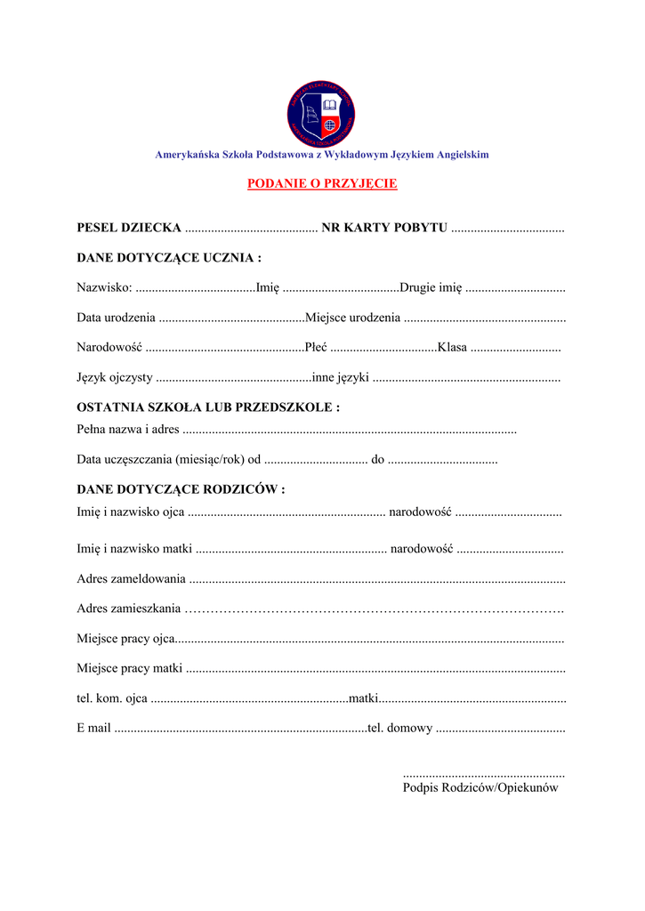 Amerykańska Szkoła Podstawowa z Wykładowym Językiem Angielskim PODANIE O PRZYJĘCIE PESEL DZIECKA ......................................... NR KARTY POBYTU ................................... DANE DOTYCZĄCE UCZNIA : Nazwisko: .....................................Imię ....................................Drugie imię ............................... Data urodzenia .............................................Miejsce urodzenia .................................................. Narodowość .................................................Płeć .................................Klasa ............................ Język ojczysty ................................................inne języki .......................................................... OSTATNIA SZKOŁA LUB PRZEDSZKOLE : Pełna nazwa i adres ....................................................................................................... Data uczęszczania (miesiąc/rok) od ................................ do .................................. DANE DOTYCZĄCE RODZICÓW : Imię i nazwisko ojca ............................................................. narodowość ................................. Imię i nazwisko matki ........................................................... narodowość ................................. Adres zameldowania .................................................................................................................... Adres zamieszkania ……………………………………………………………………………. Miejsce pracy ojca........................................................................................................................ Miejsce pracy matki ..................................................................................................................... tel. kom. ojca .............................................................matki.......................................................... E mail ..............................................................................tel. domowy ........................................ .................................................. Podpis Rodziców/Opiekunów