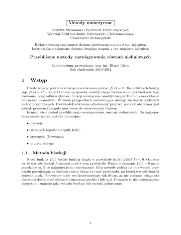 Metody numeryczne Instytut Sterowania i Systemów Informatycznych Wydział Elektrotechniki, Informatyki i Telekomunikacji Uniwersytet Zielonogórski Elektrotechnika stacjonarne-dzienne pierwszego stopnia z tyt. inżyniera Informatyka stacjonarne-dzienne drugiego stopnia z tyt. magistra inżyniera Przybliżone metody rozwiązywania równań nieliniowych Laboratorium, prowadzący: mgr inż. Błażej Cichy Rok akademicki 2010/2011 1 Wstęp Często istnieje potrzeba rozwiązania równania postaci f (x) = 0. Dla niektórych funkcji (np. f (x) = x2 − 4x + 1) znane są sposoby analitycznego wyznaczenia pierwiastków tego równania. przypadku większości funkcji rozwiązanie analityczne jest trudne, czasochłonne lub nawet niemożliwe. W wielu przypadkach zadowalające okazuje się użycie szybszych metod przybliżonych. Pierwiastek równania odnaleziony przy ich pomocy obarczony jest jednak pewnym (z reguły możliwym do oszacowania) błędem. Istnieje wiele metod przybliżonego rozwiązywania równań nieliniowych. Do najpopularniejszych należą metody iteracyjne: • bisekcji, • siecznych (oparte o regułę falsi), • stycznych (Newtona), • punktu stałego 1.1 Metoda bisekcji Niech funkcja f (x) będzie funkcją ciągłą w przedziale [a, b] i f (a)f (b) < 0. Oznacza to, że wartość funkcji f zmienia znak w tym przedziale. Ponadto równanie f (x) = 0 ma w przedziale [a, b] co najmniej jedno rozwiązanie. Idea metody polega na połowieniu przedziału poszukiwań, za każdym razem biorąc tę część przedziału, na której wartość funkcji zmienia znak. Połowienie takie jest kontynuowane tak długo, aż nie zostanie osiągnięta określona dokładność obliczeń (oznaczana zwykle lub eps). Prowadzi to do następującego algorytmu, znanego jako metoda bisekcji lub metoda połowienia: 1 Przybliżone metody rozwiązywania równań nieliniowych 2 1 ) c :=( a+b ) /2 2 ) j e ś l i b−c<=eps , t o p r z y j m i j , ż e p i e r w i a s t k i e m równania f ( x)=0 j e s t w a r t o ś ć c , a więc f ( c )=0 i zakończ program . 3 ) j e ś l i znak ( f ( b ) ) ∗ znak ( f ( c))<=0 t o a:= c w przeciwnym r a z i e b:= c 4 ) s k o c z do punktu 1 . Funkcja znak(x) zwraca wartość 1 jeśli x > 0, −1 jeśli x < 0 oraz 0 dla x = 0. Szczególną zaletą metody bisekcji jest fakt, iż jest ona zawsze zbieżna do rozwiązania. Główną wadą tej metody jest wolna zbieżność do rozwiązania. 1.1.1 Oszacowanie błędu Niech an , bn , cn oznaczają n-tą obliczoną wartość odpowiednio a, b i c. Ponadto niech α oznacza prawdziwą wartość pierwiastka równania f (x) = 0. Błąd popełniony w n-tym kroku w metodzie bisekcji |α − cn | jest określony wzorem: |α − cn | ≤ 1.2 1 (b − a) 2n (1) Metoda Newtona Metoda Newtona, zwana też metodą stycznych, należy do metod iteracyjnych. W metodzie tej korzysta się z założenia, że funkcja f posiada ciągłą co najmniej pierwszą pochodną (oznaczoną f 0 ). Ponadto zakłada się, że znane jest pierwsze przybliżenie x0 pierwiastka równania f (x) = 0. W metodzie tej iteracyjnie wyznacza się wartość wyrażenia: f (x0 ) (2) x 1 = x0 − 0 f (x0 ) w pierwszym kroku oraz xn+1 = xn − f (xn ) f 0 (xn ) (3) dla n > 1. Program kończy się, gdy błąd metody jest zadowalająco mały: xn − xn−1 ≤ lub wykonano zadaną ilość iteracji nmax . Uwaga: błędny dobór wartości początkowej x0 może spowodować brak zbieżności metody. 1.2.1 Oszacowanie błędu Niech pierwsza (f 0 ) i druga (f 00 ) pochodna funkcji f będzie ciągła oraz wartość pierwszej pochodnej f 0 (α) 6= 0, gdzie α jest pierwiastkiem równania f (x) = 0, tzn. f (α) = 0. Można wykazać, że błąd metody Newtona wynosi α − xn ≈ xn+1 − xn (4) Przybliżone metody rozwiązywania równań nieliniowych 1.3 3 Metoda siecznych Zakładając, że znane są dwa początkowe oszacowania (x0 oraz x1 ) wartości α pierwiastka równania f (x) = 0. Przy takich założeniach możliwe jest użycie metody siecznych: xn+1 = xn − f (xn ) xn − xn−1 f (xn ) − f (xn−1 ) (5) dla n = 1, 2, 3, nmax . Program kończy się, gdy błąd metody jest zadowalająco mały: xn − xn−1 ≤ lub wykonano zadaną ilość iteracji nmax . Metoda siecznych może być uważana za przybliżenie metody Newtona bazujące na fakcie, iż f 0 (xn ) ≈ 1.3.1 f (xn ) − f (xn−1 ) xn − xn−1 Oszacowanie błędu Oszacowanie błędu w metodzie siecznych odbywa się podobnie do metody Newtona. Błąd metody wynosi w przybliżeniu α − xn−1 ≈ xn − xn−1 1.4 (6) Porównanie metody siecznych i Newtona Należy podkreślić, iż metoda siecznych w ogólnym przypadku wymagać będzie większej liczby iteracji od metody Newtona. Współczynnik zbieżności (informujący, jak błąd w kroku n + 1 zależy od błędu w kroku n) dla metody siecznych wynosi ok. 1.62: |α − xn+1 | ≈ c |α − xn+1 |1.62 zaś w metodzie Newtona — dokładnie 2: 00 −f (cn ) (α − xn+1 )2 α − xn+1 = 2f 0 (xn ) Nie należy jednak zapominać, że metoda Newtona wymaga wyliczenia zarówno wartości funkcji, jak i wartości pochodnej tej funkcji. Z tego powodu, pomimo mniejszej liczby iteracji, w porównaniu z metodą siecznych, może ona w praktyce działać wolniej. Zależy to od trudności w wyznaczeniu pochodnej funkcji w punkcie xn . 1.5 Metody punktu stałego Teoria punktu stałego stanowi uogólnienie iteracyjnych metod wymagających podania jednego punktu startowego. Teoria ta może więc zostać użyta do analizy metody Newtona. Wszystkie metody iteracyjne wymagające podania jednego punktu startowego można zapisać jako: xn+1 = g(xn ) (7) Jeśli lim xn+1 = lim g(xn ) (8) α = g(α) (9) n←∞ n←∞ to Przybliżone metody rozwiązywania równań nieliniowych 4 Stąd α jest rozwiązaniem równania x = g(x). Wartość α nazywana jest punktem stałym funkcji g. Można dowieść, że metoda iteracyjna oparta na wzorze (7) jest zbieżna, gdy |g 0 (α)| < 1 Jeśli |g 0 (α)| = 1, wtedy