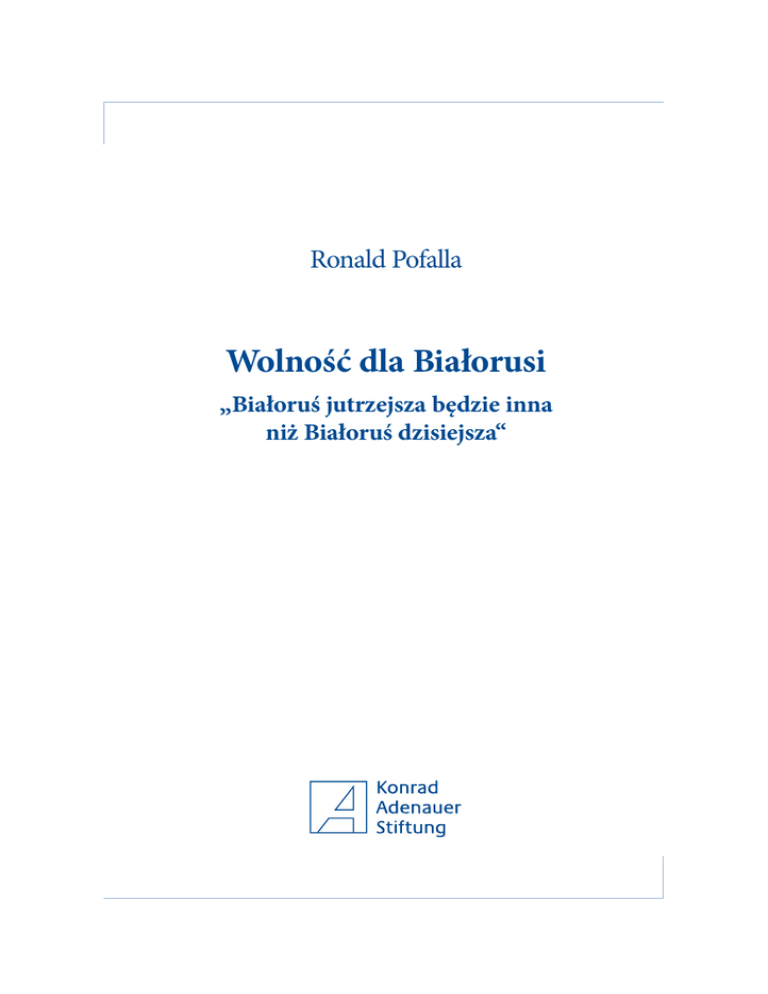Ronald Pofalla Wolność dla Białorusi „Białoruś jutrzejsza będzie inna niż Białoruś dzisiejsza“ Raporty Fundacji Konrada Adenauera Raporty Fundacji Konrada Adenauera Słowo wstępne Demokracja i społeczna gospodarka rynkowa warunkami sukcesu Spis treści Słowo wstępne Seite 3 Podstawowe zasady polityki chrześcijańsko-demokratycznej i ich znaczenie dla Białorusi Wykład inaugurujący IX Forum w Mińsku Mińsk, 9 listopada 2006 Seite 4 Perspektywy dla Białorusi Przemówienie otwierające konferencję Fundacji Konrada Adenauera poświęconą sytuacji na Białorusi Berlin, 26 czerwca 2007 Seite 12 O autorze Seite 19 Fundacja Konrada Adenauera działająca od jesieni 1989 w Polsce wspiera od końca lat 90-tych również projekty realizowane na Białorusi. Współpraca ta odbywała się od w ramach odrębnego projektu prowadzonego przez warszawskie biuro Fundacji. Od kwietnia 2007 r. projekt ten prowadzi specjalnie dla tego projektu biuro otwarte w Wilnie, które również w przyszłości będzie aktywnie wspierać przemiany polityczne i społeczne na Białorusi. Celem zagranicznej działalności Fundacji Konrada Adenauera jest wspieranie wolności politycznej i gospodarczej oraz sprawiedliwości społecznej. Działalność ta opiera się o zasady funkcjonujące w wolnych demokracjach w państwach prawa o rozwiniętej społecznej gospodarce rynkowej. Ich podstawą są natomiast wartości wynikające ze światopoglądu chrześcijańsko-demokratycznego. w przypadku Białorusi najważniejsze jest wzmocnienie sił demokratycznych, wdrażanie procesów transformacyjnych w gospodarce i polityce społecznej, jak i poprawa stosunków z Unią Europejską. Sekretarz Generalny Unii Chrześcijańsko-Demokratycznej Niemiec (CDU), Ronald Pofalla, w ostatnich latach wielokrotnie odwiedzał Białoruś, gdzie spotykał się głównie z przedstawicielami opozycji i organizacji społecznych. Niniejsza publikacja zawiera jego dwa wykłady, które wygłosił w Mińsku podczas niemiecko-białoruskiego Forum 9 listopada 2006, w 17-tą rocznicą upadku muru berlińskiego oraz na otwarciu konferencji Fundacji Konrada Adenauera poświęconej Białorusi 26 czerwca 2007 w Berlinie. Wystąpienia te poruszają bezpośrednio problem dyktatury na Białorusi, a jednocześnie wyrażają nadzieję na lepszą przyszłość budowaną zgodnie z zasadami polityki chrześcijańsko-demokratycznej. Naszym przyjaciołom i partnerom na Białorusi życzymy w walce o wolności demokratyczne i dobrobyt wytrwałości i powodzenia sukcesu. STRONA 2 Stephan Raabe Dyrektor Fundacji Konrada Adenauera w Polsce Warszawa, listopad 2007 STRONA 3 Raporty Fundacji Konrada Adenauera Wolności nie da się zawłaszczyć. Podstawowe zasady polityki chrześcijańskodemokratycznej i ich znaczenie dla Białorusi Wykład inaugurujący IX Forum w Mińsku Mińsk, 9 listopada 2006 Dzień 9 listopada nie jest dla Niemców zwyczajną datą. 9 listopada jest tym dniem, który jak żaden inny przypomina o wzlotach i upadkach niemieckiej historii. Ten dzień budzi różne uczucia: • 9-tego listopada 1918 Niemcy wywalczyli pierwszą republikę na niemieckiej ziemi i następnie uchwalili pierwszą wolną konstytucję. • 9 -tego listopada 1938 doszło do wybuchu przemocy przeciwko niemieckim Żydom w trakcie „Nocy kryształowej“. • 9-ty listopada 1989 był dniem wolności, upadku muru, początkiem pokojowego ponownego zjednoczenia Niemiec i Europy. STRONA 4 Mając na uwadze te rocznice, jak również mój wiek, łatwo będzie Państwu wyobrazić sobie, że upadek muru Raporty Fundacji Konrada Adenauera był dla mnie wydarzeniem, które wywarło najsilniejszy wpływ na moją karierę polityczną. Również z tego powodu w czasie mojego ostatniego przyjazdu do Mińska podarowałem moim rozmówcom po takim kawałku muru berlińskiego, jaki dziś trzymam w ręku. nież na ulicy, krytykować sytuację polityczną i społeczną. Nie wszędzie jest też zrozumiałe samo przez się, że również będąc politykiem opozycyjnym można współtworzyć kulturę danego kraju, korzystając przy tym ze swobód i bezpieczeństwa. I to niezależnie od tego, czy mówimy o wolności słowa, wolności politycznej czy też religijnej. Wszyscy rządzący na całym świecie muszą być tego świadomi, że wolność nie pochodzi z ich wspaniałomyślnego nadania; zadaniem rządów jest bronienie wolności! Stasi się go bała. Przez pewien czas był również więziony. Gdy znany poeta enerdowski, Stephan Hermlin, ostro skrytykował w roku 1987 stwierdzenie Helmuta Kohla, że w Niemczech Wschodnich jest 2000 więźniów politycznych, Vaatz napisał w liście otwartym, że jest więźniem politycznym jak daleko sięga pamięcią; „w zasiekach z drutu kolczastego o powierzchni 108 000 km²“. Na pewno jednak nie chcę zawłaszczyć wolności jako wartości podstawowej dla mojej partii. Wolności nie da się zawłaszczyć. Nie, bowiem żadna partia z osobna ani też żadna jednostka nie jest w stanie udźwignąć odpowiedzialności, którą niesie ze sobą ta uniwersalna wartość podstawowa. Wartość wolności jest uniwersalna, tak jak również wynikająca z niej odpowiedzialność! Państwo jest dla obywateli, a nie obywatele dla państwa! Wielu Niemców jeszcze dzisiaj dobrze pamięta, co to znaczy żyć pod rządami dyktatury. Wielu Niemców również z mojej partii może opowiedzieć o swoich doświadczeniach z czasów dyktatury i oni też podtrzymują pamięć o tamtych doświadczeniach w naszym kraju. Myślę o obrońcach praw człowieka takich Jens Reich, Freya Klier, Friedrich Schorlemmer czy Joachim Gauck, lub o przedstawicielach mojej partii takich jak Vera Lengsfeld, Rainer Eppelmann, Günter Nooke czy Arnold Vaatz. nich, którzy przed siedemnastoma laty skandowali: „My jesteśmy narodem“. Któż, jeżeli nie my, Niemcy, powinniśmy być ambasadorami rewolucji pokojowej. Posunę się nawet jeszcze dalej: mamy moralny obowiązek być ambasadorami