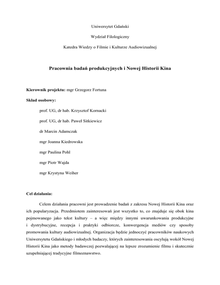 Uniwersytet Gdański Wydział Filologiczny Katedra Wiedzy o Filmie i Kulturze Audiowizualnej Pracownia badań produkcyjnych i Nowej Historii Kina Kierownik projektu: mgr Grzegorz Fortuna Skład osobowy: prof. UG, dr hab. Krzysztof Kornacki prof. UG, dr hab. Paweł Sitkiewicz dr Marcin Adamczak mgr Joanna Kiedrowska mgr Paulina Pohl mgr Piotr Wajda mgr Krystyna Weiher Cel działania: Celem działania pracowni jest prowadzenie badań z zakresu Nowej Historii Kina oraz ich popularyzacja. Przedmiotem zainteresowań jest wszystko to, co znajduje się obok kina pojmowanego jako tekst kultury – a więc między innymi uwarunkowania produkcyjne i dystrybucyjne, recepcja i praktyki odbiorcze, konwergencja mediów czy sposoby promowania kultury audiowizualnej. Organizacja będzie jednoczyć pracowników naukowych Uniwersytetu Gdańskiego i młodych badaczy, których zainteresowania oscylują wokół Nowej Historii Kina jako metody badawczej pozwalającej na lepsze zrozumienie filmu i skutecznie uzupełniającej tradycyjne filmoznawstwo. Obszary zainteresowań badawczych: 1. Zagadnienia z zakresu produkcji filmowej: modele finansowania produkcji filmowej i ich ekonomiczne uwarunkowania; historia produkcji filmowej: jej modeli, form organizacyjnych i instytucjonalnych, strategii i kalkulacji rynkowych; wpływ zmian technologicznych (między innymi postprodukcji i efektów specjalnych) na produkcję filmową; sposoby funkcjonowania ośrodków przemysłu filmowego; wpływ zmian społecznych i politycznych, w tym cenzury i systemu kategorii wiekowych na produkcję filmową; product placement; city placement. 2. Zagadnienia z zakresu dystrybucji filmowej: specyfika poszczególnych rynków dystrybucyjnych; wpływ nowych mediów i zjawiska konwergencji na dystrybucję filmową; marketing filmowy; festiwal filmowy jako fenomen społeczny i ekonomiczny; wpływ zmian społecznych i politycznych na dystrybucję filmową; piractwo filmowe. 3. Inne zagadnienia: merchandising; turystyka filmowa; badania nad recepcją filmową; krytyka filmowa; socjologiczne i antropologiczne metody badania kina; badanie historii kina poza kanonem arcydzieł; rewizja mitów klasycznej historiografii kina; metody badań produkcji i dystrybucji filmowej. Zadania do realizacji: organizacja cyklicznej konferencji naukowej – „Ekonomia kina”; wydawanie publikacji związanych z tematyką badań pracowni, w tym tomu pokonferencyjnego „Ekonomia kina”; współpraca z innymi ośrodkami naukowymi i organizacjami związanymi z badaniami wchodzącymi w zakres Nowej Historii Kina; współpraca z firmami i organizacjami zajmującymi się praktyką filmowa – produkcją, dystrybucją i promocją kina; organizacja gościnnych wykładów autorytetów w dziedzinie Nowej Historii Kina; aplikowanie o granty badawcze (między innymi NCN i Narodowy Program Rozwoju Humanistyki); popularyzacja Nowej Historii Kina jako metody badawczej.