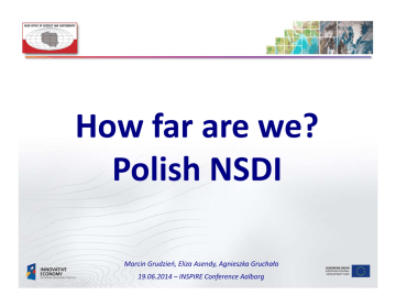 Kliknij, aby edytować styl • Kliknij, aby edytować style wzorca tekstu – Drugi poziom How far are we? Polish NSDI • Trzeci poziom – Czwarty poziom » Piąty poziom Marcin Grudzień, Eliza Asendy, Agnieszka Gruchała 2014-06-23 19.06.2014 – INSPIRE Conference Aalborg 1 Agenda Kliknij, aby edytować styl •Polish NSDI: Kliknij, aby edytować style wzorca tekstu – Drugi poziom Project Geoportal 2 • Trzeci poziom Geoportal – datasets and services – Czwarty poziom » Piąty poziom Geoportal statistics Geoportal – other developments Future developments 2014-06-23 2 Geoportal 2 project Kliknij, aby edytować styl GEOPORTAL 2 is one of the biggest projects in Poland focusing on development of Spatial Data Infrastructure (SDI) • Kliknij, aby edytować style wzorca tekstu The main goal of the GEOPORTAL 2 project, launched by the Head Office – of Geodesy and Cartography (GUGiK), is to provide to citizens, business Drugi poziom and public administration access to public registers containing high quality • Trzeci poziom and reliable data using web services – Czwarty poziom GEOPORTAL 2 concentrates » Piąty poziommore on development of services providing access to registers containing spatial data rather than on data The GEOPORTAL 2 Project – is funded under the Innovative Economy Operational Programme (OP IE) priority axis 7 „Information Society – establishment of electronic administration” Budget: above 120 mln PLN (~ 28,5 mln EURO) Time frame: July 2009 – March 2015 2014-06-23 3 Geoportal 2 project Kliknij, aby edytować styl • Kliknij, aby edytować style wzorca tekstu – Drugi poziom • Trzeci poziom http://www.geoportal.gov.pl – Czwarty poziom » Piąty poziom 2014-06-23 4 Agenda Kliknij, aby edytować styl •Polish NSDI: Kliknij, aby edytować style wzorca tekstu – Drugi poziom Project Geoportal 2 • Trzeci poziom Geoportal – – Czwartydatasets and services poziom » Piąty poziom Geoportal statistics Geoportal – other developments Future developments 2014-06-23 5 Network services Kliknij, aby edytować styl 75 view services: 59 WMS, 16 WMTS includingaby INSPIRE services: 6 WMS, 6 WMTS, • Kliknij, edytować style wzorca tekstu 29 download services: 18 WFS, 6 WCS, 5 ATOM – Drugi poziom including INSPIRE services: 6 WFS, 5 ATOM, • Trzeci poziom 2 discovery services: – Czwarty poziom Including one INSPIRE discovery service, » Piąty poziom Other services: metadata validation, OpenLS, etc. coordinate transformation service: 1 WCTS 94 external services connected to Geoportal: 81 WMS services and 13 CSW services. 2014-06-23 6 Map brokers Kliknij, aby edytować styl National broker http://mapy.geoportal.gov.pl • Kliknij, aby edytować style wzorca tekstu Domain broker – Drugi poziom • Trzeci poziom – Czwarty poziom » Piąty poziom http://mapy.geoportal.gov.pl/imap/?gpmap=gp1 INSPIRE broker http://mapy.geoportal.gov.pl/imap/?gpmap=gp3 More information about brokers Presentation „Cartography in 2014-06-23 the Internet and the National Spatial Data Portal” by Eliza Asendy Room 5 2014.06.19 14:457 Availiable data sources Kliknij, aby edytować styl General Geographic Database • Kliknij, aby edytować style wzorca tekstu Vector Map Level 2 (VMap2) Topographic Database – Drugi poziom Ortophotomaps • Trzeci poziom Rasters of topographic maps Czwarty poziom Rasters–of thematic maps » Piąty poziom Cadastral data (2 data sources) State Boundary Register State Register of Geographic Names Register of geodetic network INSPIRE datasets Metadata (184 679) And other 2014-06-23 29 TB of data! 8 Available INSPIRE datasets Kliknij, aby edytować styl Transportation Annex I datasets Cadastral parcels • Kliknij, aby edytować style wzorca tekstu Geographical names – Drugi poziom Administrative units • Trzeci poziom Addresses Soil– Czwarty poziom » Piąty poziom Land cover available on Geoportal Buildings Orthoimagery Elevation More information about data harmonisation in Poland „Central European Perspective of Bringing INSPIRE into Area management/restriction/regulation zones Practice” and reporting units by Marcin Grudzień Auditorium 3 2014.06.16 Utility and governmental services 2014-06-23 14:00 Production and Industrial Facilities 9 2014-06-23 Update of discovery and view services Metadata creation– Annex I, II Data harmonisation – Annex I 2010 2011 2012 Ggeoportal 2 on mobile devices Report to EC INSPIRE coordinates transformation servicwe Publication of Geoportal 2 API Data harmonization – Annexes II, III Annex II&III: discovery, view, and download services Network servcies – Annexes II, III Spatial data services 2012 2013 2013 2013 2013 2014 2015 2015 Kliknij, aby edytować styl SDI module NATIONAL IMPLEMENTATION CONTEXT 2012 2012 Download services available Annex I: discovery, view, and download services Maintenance contract Review of discovery, view services Geoportal 2 – Czwarty poziom » Piąty poziom 2012 2012 2012 2012 Report to EC • Trzeci poziom 2010 – Drugi poziom Transposition of the Directive • Kliknij, aby edytować style wzorca tekstu 2010 2008 INSPIRE Polish roadmap: 10 Agenda Kliknij, aby edytować styl •Polish NSDI: Kliknij, aby edytować style wzorca tekstu – Drugi poziom Project Geoportal 2 • Trzecidatasets and services poziom Geoportal – – Czwarty poziom » Piąty poziom Geoportal statistics Geoportal – other developments Future plans 2014-06-23 11 Geoportal Number of requests Kliknij, aby edytować styl 18000000 16000000 • Kliknij, aby edytować style wzorca tekstu Number of requests per day 14000000 12000000 – Drugi poziom 10000000 8000000 • Trzeci poziom – Czwarty poziom » Piąty poziom 6000000 4000000 2000000 0 Date 2014-06-23 12 Geoportal Number of unique IPs Kliknij, aby edytować styl 45000 40000 • Kliknij, aby edytować style wzorca tekstu Number of requests per day 35000 30000 – Drugi poziom 25000 20000 • Trzeci poziom – Czwarty poziom » Pi