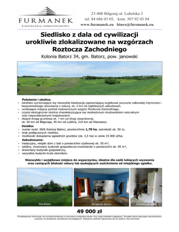 23-400 Biłgoraj ul. Lubelska 3 tel. 84 686 03 05, kom. 507 02 03 04 www.furmanek.eu [email protected] ________________________________________________________________________________________________________________________ Siedlisko z dala od cywilizacji urokliwie zlokalizowane na wzgórzach Roztocza Zachodniego Kolonia Batorz 34, gm. Batorz, pow. janowski • • • • • • • • • • • Położenie i okolica: siedlisko wyróżniające się niezwykłą lokalizacją zapewniającą wyjątkowe poczucie całkowitej intymności i bezpośredniego obcowania z naturą, ok. 2 km od najbliższych zabudowań, urzekające miejsce pośród malowniczych wzgórz Roztocza Zachodniego, czysta ekologicznie okolica charakteryzująca się nieskażonym środowiskiem naturalnym oraz niepowtarzalnymi krajobrazami, dojazd drogą gruntową ok. 1 km od drogi utwardzonej, ok. 50 km od Biłgoraja, 45 km od Lublina, 210 km od Warszawy. Działka: numer ewid. 58/6 Kolonia Batorz, powierzchnia 1,78 ha, szerokość ok. 50 m, brak podłączonych mediów, możliwość dokupienia sąsiednich gruntów (ok. 3,5 ha) w cenie 15 000 zł/ha. Zabudowania: tradycyjny, wiejski dom z bali o powierzchni użytkowej ok. 50 m², solidny, murowany budynek gospodarczo-inwentarski o powierzchni ok. 95 m², drewniany budynek gospodarczy, wszystkie budynki kryte eternitem. Niezwykłe i wyjątkowe miejsce do wypoczynku, idealne dla osób lubiących wyzwania oraz ceniących bliskość natury lub szukających wytchnienia od miejskiego zgiełku. • Siedlisko Wnętrze domu Zabytkowy piec 49 000 zł ____________________________________________________________________________________________________________________________________________________________________________________________ Przedstawione informacje nie są ofertą handlową w rozumieniu przepisów prawa, lecz mają charakter poglądowy. Wszelkie dane dotyczące nieruchomości uzyskano na podstawie oświadczeń sprzedających. Zalecamy osobiste zapoznanie się ze stanem nieruchomości.