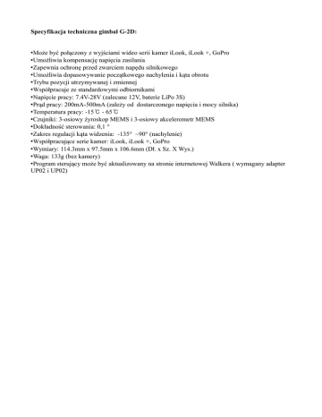 Specyfikacja techniczna gimbal G-2D: •Może być połączony z wyjściami wideo serii kamer iLook, iLook +, GoPro •Umożliwia kompensację napięcia zasilania •Zapewnia ochronę przed zwarciem napędu silnikowego •Umożliwia dopasowywanie początkowego nachylenia i kąta obrotu •Trybu pozycji utrzymywanej i zmiennej •Współpracuje ze standardowymi odbiornikami •Napięcie pracy: 7.4V-28V (zalecane 12V, baterie LiPo 3S) •Prąd pracy: 200mA-500mA (zależy od dostarczonego napięcia i mocy silnika) •Temperatura pracy: -15℃ - 65℃ •Czujniki: 3-osiowy żyroskop MEMS i 3-osiowy akcelerometr MEMS •Dokładność sterowania: 0,1 ° •Zakres regulacji kąta widzenia: -135° ~90° (nachylenie) •Współpracujące serie kamer: iLook, iLook +, GoPro •Wymiary: 114.3mm x 97.5mm x 106.6mm (Dł. x Sz. X Wys.) •Waga: 133g (bez kamery) •Program sterujący może być aktualizowany na stronie internetowej Walkera ( wymagany adapter UP02 i UP02)
