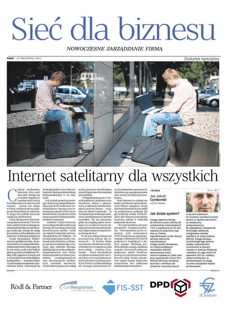 Sieć dla biznesu NOWOCZESNE ZARZĄDZANIE FIRMĄ Dodatek specjalny RADEK PASTERSKI Piątek | 23 września 2011 Internet satelitarny dla wszystkich REKLAMA do drugiej połowy 2012 roku rozbudować istniejącą infrastrukturę telekomunikacyjną w 115 miejscach. Jest jednak sposób pozwalający dostawcom usług telekomunikacyjnych i IP zaoferować szerokopasmowy Internet oraz retransmisję sygnału GSM wszystkim klientom, niezależnie od ich miejsca pobytu idostępnej infrastruktury naziemnej. – Eutelsat i ViaSat stworzyły nową usługę dwukierunkowego dostępu do szerokopasmowego Internetu przez satelitę – mówi Jan Jakub Cymborski, szef wrocławskiej firmy JJC Telekom. –To rezultat połączenia wiedzy i doświadczenia Eutelsatu, czołowego operatora satelitarnego wEuropie, jego oddziału Skylogic, działającego na rynku usług szerokopasmowych, oraz ViaSat, światowego lidera wbranży produktów szerokopasmowych oraz innowacyjnych satelitarnych systemów sieciowych. Cymborski wyjaśnia, że to usługi nowej generacji umożliwiające przesył (upstream idownstream) przez satelitę. –Usługa dostępnajest wczterech pakietach: podstawowym, brązowym, złotym i platynowym, wzależności odindywidualnych potrzeb klienta – wyjaśnia Jan Jakub Cymborski. – To rozwiązanie pozwala nam zaoferować szerokopasmowy Internet wszystkim. Nie ma znaczenia, gdzie się znajdują, gdzie mieszkają i czy na danym terenie dostępnajest naziemnainfrastruktura. Zapewniamy nieograniczony dostęp dosieci. To nie jest usługa luksusowa przeznaczona jedynie dla zamożnych. – To bardzo dobre rozwiązanie dla klientów indywidualnych ze względu na niski koszt usługi – wyjaśnia Cymborski. – Koszt niezbędnych urządzeń i instalacji jest znacznie niższy niż cena profesjonalnych systemów szerokopasmowych. Prosta i szybka instalacja nie wymaga zastosowania no- wych standardów sprzętowych, dodatkowego oprogramowania albo zmiany konfiguracji komputera. Brak Internetu to jednak nie koniec problemów spowodowanych słabym zasięgiem. Zasięg telefonów komórkowych zanika na podziemnym parkingu lub gdy jedziemy windą. Przed domem albo biurem prowadzimy rozmowę, jednak w budynku połączenie się urywa. –To częsty problem, ale inato jest sposób – wyjaśnia Cymborski. – Rozwiązaniem są tzw. repeatery, czyli wzmacniacze GSM. Wzmacniacze sygnału pomagają w eliminacji zerwanych połączeń w budynkach o słabym zasięgu. Eliminują problem słabego zasięgu, zanikania sygnału i zrywanych połączeń, podnosząc jakość świadczonych przez operatorów komórkowych usług. Dzięki repeaterom sygnał zostaje skutecznie wzmocniony bez zakłócania działania innych urządzeń. >OPINIA dla „rz” Jan Jakub Cymborski OPENPRESS C hociaż użytkownicy Internetu chcą mieć doń stały dostęp, nie wszędzie mogą liczyć napołączenie zsiecią. Powstała mapa tzw. dziewiczych terenów – ponad 200 miejsc wPolsce, wktórych nie ma zasięgu sieci komórkowych. Internauci mogą tam jednak korzystać zpołączeń satelitarnych. Czym dla łączności internetowej są dziewicze tereny? To te obszary, naktórych nie występuje naziemnainfrastruktura umożliwiająca tradycyjny dostęp do usługi korzystania z dobrodziejstw sieci Internetu i telefonii komórkowej. Urząd Komunikacji Elektronicznej opublikował listę obszarów, naktórych zasięg telefonii komórkowej jest niewystarczający albo nie ma go wcale. Lista białych plam to ponad200 lokalizacji. Według UKE najgorsza sytuacja jest wwojewództwach: dolnośląskim, małopolskim i świętokrzyskim. Urząd zawarł porozumienie zoperatorami, którzy zobowiązali się szef JJC Telekom Jak działa system? Usługa zapewnia dostęp do Internetu przez satelitę dla użytkowników indywidualnych i firm z prędkością do 30 razy większą niż połączenia typu dial-up. Pakiety zaprojektowane są dla różnych potrzeb odbiorców indywidualnych. Usługa została zbudowana na międzynarodowym standardzie DOCSIS opracowanym przez centrum badawcze Cable Labs przy współudziale innych firm. DOCSIS definiuje standardy łączności i interfejsu dla systemów transmisji danych w łączach kablowych. W rezultacie umożliwia przesył danych w obydwu kierunkach ze zwiększoną przepustowością. By zaadaptować standard dla technologii satelitarnej, zintegrowano interfejs satelitarny ze stacją czołową DOCSIS. Usługa bazująca na technologii tego systemu została z powodzeniem uruchomiona w domach i biurach w Ameryce Północnej i Kanadzie. W ciągu dwóch lat wykonano 325 tys. instalacji. Jestem przekonany, że zainteresowanie tą usługą na rynku europejskim będzie porównywalne. 0680321/A Piątek | 23 września 2011 ≥Rafał Nawłoka, prezes zarządu DPD Polska. F irm wykorzystujących elektronikę do zawierania transakcji pomiędzy sprzedawcami a klientami indywidualnymi jest coraz więcej. Rynek B2C – bo tak fachowo nazywa się ta grupa – błyskawicznie się więc rozwija. Wciąż powstają nowe e-sklepy, a klienci poszukują coraz korzystniejszych okazji cenowych w Internecie. Przedsiębiorcy, dotychczas korzystający z tradycyjnych metod dystrybucji, coraz częściej wykorzystują Internet, który daje im nowe możliwości sprzedaży. W najbliższych latach liczba przesyłek B2C będzie rosła dwa razy szybciej niż B2B, czyli dostarczanych między firmami i instytucjami. Skąd taka popularność B2C? Przede wszystkim to zasługa stale rosnącego zaufania do handlu internetowego oraz coraz powszechniejszego dostępu Polaków do sieci. rp .pl ◊ Sieć dla biznesu Kiedy adresata nie ma w domu Z raportu Gemius SA wynika, że ponad 50 proc. internautów robi zakupy w sklepach internetowych. Specjaliści przewidują, że w 2011 r. liczba osób robiących zakupy w sieci wzrośnie o jedną trzecią. A spośród krajów europejskich to właśnie w Polsce najbardziej rośnie sprzedaż online. – To między innymi wynik wzrostu zaufania konsument