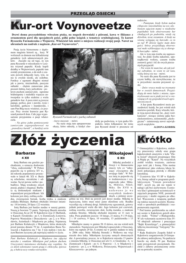7 PRZEGL!D OSIECKI Kur-ort Voynoveetze Drzwi domu przyozdobione witra!em ptaka, na nogach drewniaki z piórami, kawa w fili!ance z ornamentem pawi dla specjalnych go"ci, pó#ki pe#ne ksi$!ek o tematyce ornitologicznej. To kurort Ryszarda Furma%czaka z Wojnowic. W#a"ciciel tak mówi o miejscu realizacji swojej pasji. Nawet na ubraniach ma nadruk z napisem „Kur-ort Voynoveetze”. Pasj! "ycia biznesmena z dyplomem magistra historii s!... kury. W wolierach za domem ma kilkadziesi!t gatunków tych udomowionych ptaków. Zacz#$o si# od tego, "e syn pana Ryszarda w mieszkaniu w Lesznie trzyma$ papu"ki. Kiedy kupili dzia$k# w Wojnowicach, papu"ki tam zosta$y przeniesione, a do nich z czasem powoli do$!cza$y kury, tyle, "e nie te zwyk$e nioski, ale ozdobne. Feniksy z ogonami d$ugimi niemal jak u pawia, %nie"nobia$e, puszyste su$tanki – ch#tnie zamawiane jako prezent %lubny, kury jedwabiste - pokryte puchem zamiast piór, ogromne brahmaputry i male&kie w!sacze antwerpskie to tylko niektóre z wielu gatunków kur. A poza nimi s! jeszcze papugi, perlice, paw i pawiki, rysie i karolinki, gar$acze i mandarynki, i sam Pan Bóg raczy wiedzie', co jeszcze. Przy swoim kurorcie pan Ryszard postawi$ dom. Ca$e jego wyposa"enie przypomina o pasji w$a%ciciela. - Na górze jedno pomieszczenie zamierzam zagospodarowa! na „prawdziwy kurnik”, a bardziej serio Ryszard Furma"czak z park# su%tanek - kurze muzeum – mówi. Na razie stoj! tam spreparowane okazy, które odesz$y, a kiedy% cho- dzi$y po podwórzu, w tym parka liliputków, które kilkana%cie lat temu pan Ryszard dosta$ w prezencie od Z"ó# #yczenia Barbarze 4 XII Imi# Barbara ma greckie pochodzenie, a oznacza dos$ownie “obc!, cudzoziemk#”. W Polsce pojawi$o si# w po$owie XV w., ale rekordy popularno%ci prze"ywa$o w latach 40. XX w. Basie s! szlachetne, niezale"ne i odwa"ne. S! te" pewne siebie i pobudliwe. Maj! wrodzony zmys$ poezji, pi#kna i elegancji. Barbary s! doskona$ymi matkami i wspania$ymi przyjació$kami. Ich kolorem jest z$oty, ro%lin! orchidea, zwierz#ciem borsuk, liczb! trójka, a znakiem zodiaku Bli(ni#ta. Barbara obchodzi równie" imieniny: 18 kwietnia, 20 lipca i 22 wrze%nia. Imi# Barbara jest bardzo modne w naszej gminie. Nosz! je bowiem 73 panie. Najwi#cej Basiek mieszka w Osiecznej, bo a" 28. W K!kolewie "yje 21 Barbarek, w K!tach i Grodzisku - po 3, w Ziemnicach, )oniewie, Popowie Wonieskim i Drzeczkowie - po 2, a w Witos$awiu, Jeziorkach i Mi!skowie po jednej. Najstarsz! jest Barbara Kola&czyk z Mi!skowa, która sko&czy$a przed paroma dniami 79 lat. A najm$odsza Basia Nowaczyk z K!kolewa ma 7 lat. I tym ma$ym i tym du"ym Basiom "yczymy jak najwi#cej rado%ci w "yciu. Pani Barbara Kola"czyk z Mi#skowa (na zdj$ciu) mieszka z wnukiem Miko%ajem pod jednym dachem. Uroczysto&ci imieninowe obchodz# wi$c wspólnie. Na co dzie" solenizanci razem graj# w chi"czyka, &piewaj#, a babcia uczy wnuka wierszyków. Miko"ajowi 6 XII Miko$aj pochodzi z Grecji i w t$umaczeniu znaczy tyle co “odnosz!cy zwyci#stwo dla swojego ludu”. W Polsce imi# to pojawi$o si# w %redniowieczu i wyst#powa$o jako: Miku$a, Miklosz, Niko$, Miks. Do XVII w. nadawano je we wszystkich %rodowiskach, a pó(niej szczególnie na wsi. Dzi% na powrót jest dosy' modne. Miko$aj to m#"czyzna, który musi mie' jasno okre%lone cele. Rzadko wycofuje si# z obranej drogi. Subiektywny egocentryk, gotowy jednak po%wi#ci' wiele dla idei. Jego kolorem jest czerwie&, ro%lin! wierzba, zwierz#ciem s$o&, liczb! ósemka, a znakiem zodiaku Strzelec. Miko$aj obchodzi imieniny a" 11 razy w roku. Poza grudniem jeszcze: 14 lutego, 21 marca, 9 i 19 maja, 2 i 18 czerwca, 9 lipca, 10 wrze%nia, 13 pa(dziernika i 13 listopada. Miko$ajów mamy w gminie 50. O dziwo, nie ma w%ród nich staruszków. Najstarszym jest Miko$aj )opuszy&ski z Osiecznej, który ma raptem 29 lat. A ostatni raz w gminie nadano to imi# w 2006 roku. Ma$y Miko$aj Stomski z Wolkowa ma wi#c nieca$e dwa latka. Miko$ajom "yczymy samych s$onecznych dni. A powiedzmy jeszcze, "e w K!kolewie mieszka 13 panów o imieniu Miko$aj, w Osiecznej jest ich 11, w Grodzisku - 6, w Ziemnicach i K!tach - po 4, w Popowie - 3, w Mi!skowie i )oniewie - po 2, a w Wolkowie, *wierczynie, Wojnowicach i Kleszczewwie - po jednym. rodziców. - Pami$tam, kiedy by%em ma%ym ch%opcem i mieszkali&my na wsi, ulubionym zaj$ciem mamy w niedzielne popo%udnie by%o obserwowanie kur chodz#cych po podwórku, wtedy si$ dziwi%em, teraz rozumiem. A kiedy na wiosn$ wyl$gaj# si$ kurczaki, co to za raj! W okresie l$gów mam du'o go&ci, którzy przyje'd'aj# obserwowa! ma%e wykluwaj#ce si$ ze skorupki kurcz#tka – mówi. Ale w tym raju trzeba si# napracowa', bo ptaki trzeba nakarmi', uporz!dkowa' woliery, czasem trzeba zostawi' go%ci i i%' do swych pierzastych przyjació$. - Nie wiem ile mam kur, ale jak jednej zabraknie, to wiem to od razu, widz$ której nie ma – mówi. Na razie dla pana Ryszarda jest to czyste hobby, ale niewykluczone, "e w przysz$o%ci zacznie przynosi' zyski. - Znów wraca moda na trzymanie kur w swoich domostwach. Przyje'd'aj# do mnie ludzie z miasta, zapotrzebowanie na te ptaki jest te' w rozwijaj#cych si$ gospodarstwach agroturystycznych. A kur panu Ryszardowi mo"e pozazdro%ci' ka"dy, bo jest w%ród nich mnóstwo pere$ek. Kury w$oszki, które "yj! nawet dziesi#' lat, „kury wielkanocne”, nios!ce zielone jajka bezcholesterolowe, zielononó"ki „ekologiczne”- zainteresuj! nawet najwi#kszych sceptyków. ALDONA KORBIK Krótko * Gimnazjali%ci z K!kolewa, niektórzy pracownicy szko$y oraz grupa k!kolewskich emerytów z ko$a "Z$ota Jesie&" obejrzeli przejmuj!cy film A.Wajdy pt. "Katy&". Na wszystkich zrobi$ wielkie wra"enie, zarówno jego tre%' jak i form!. Film mo"na potraktowa' jako ciekaw! lekcj# historii pokazuj!c! prawd# o zbrodni katy&skiej. * Uczniowie klas VI SP w K!kolewie, bior!c udzia$ w programie profilaktycznym "Umiem powiedzie' NIE", uczyli si#, jak nie wpa%' w na$ogi i jak by' asertywnym. Uczniowie klas I gimnazjum uczestniczyli w zaj#cia
