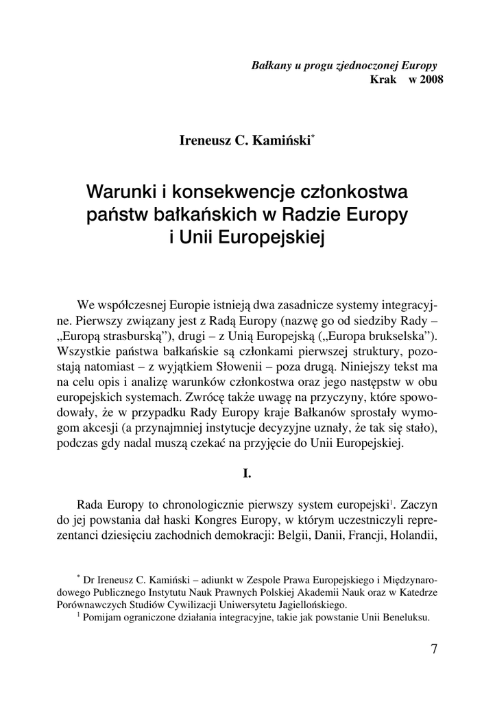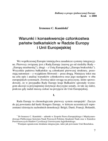 Bałkany u progu zjednoczonej Europy Kraków 2008 Ireneusz C. Kamiński* Warunki i konsekwencje członkostwa państw bałkańskich w Radzie Europy i Unii Europejskiej We współczesnej Europie istnieją dwa zasadnicze systemy integracyjne. Pierwszy związany jest z Radą Europy (nazwę go od siedziby Rady – „Europą strasburską”), drugi – z Unią Europejską („Europa brukselska”). Wszystkie państwa bałkańskie są członkami pierwszej struktury, pozostają natomiast – z wyjątkiem Słowenii – poza drugą. Niniejszy tekst ma na celu opis i analizę warunków członkostwa oraz jego następstw w obu europejskich systemach. Zwrócę także uwagę na przyczyny, które spowodowały, że w przypadku Rady Europy kraje Bałkanów sprostały wymogom akcesji (a przynajmniej instytucje decyzyjne uznały, że tak się stało), podczas gdy nadal muszą czekać na przyjęcie do Unii Europejskiej. I. Rada Europy to chronologicznie pierwszy system europejski1. Zaczyn do jej powstania dał haski Kongres Europy, w którym uczestniczyli reprezentanci dziesięciu zachodnich demokracji: Belgii, Danii, Francji, Holandii, * Dr Ireneusz C. Kamiński – adiunkt w Zespole Prawa Europejskiego i Międzynarodowego Publicznego Instytutu Nauk Prawnych Polskiej Akademii Nauk oraz w Katedrze Porównawczych Studiów Cywilizacji Uniwersytetu Jagiellońskiego. 1 Pomijam ograniczone działania integracyjne, takie jak powstanie Unii Beneluksu. Irlandii, Luksemburga, Norwegii, Szwecji, Wielkiej Brytania i Włoch. Już rok później 5 maja 1949 r. w Londynie uchwalono statut Rady Europy, dokument konstytuujący w sensie prawnym tę organizację2. Rada Europy została pomyślana jako struktura oparta na „wspólnocie wartości”, która w powojennej Europie miała służyć – z jednej strony – budowaniu i pogłębianiu związków między państwami członkowskimi, a z drugiej stanowić polityczną alternatywę dla pokonanego nazizmu, a zwłaszcza dla rosnącego w siłę komunizmu. Państwa członkowskie musiały wykazać przywiązanie do dwóch wartości: poszanowania praw człowieka i rządów prawa. Do tej diady, o której wprost mówi statut (akapit 3 preambuły i art. 3), dodano następnie wymóg posiadania pluralistycznej demokracji. Kryterium to wyprowadzono z aksjologii statutu i rozwinięto w dokumentach Rady, zwłaszcza w opiniach przedakcesyjnych przygotowywanych przez Zgromadzenie Parlamentarne3. Do czasu upadku systemu komunistycznego Rada Europy powiększyła się o 13 państw4. Później zaczęły do niej wstępować młode demokracje Europy Środkowo-Wschodniej. Obecnie Rada obejmuje 47 państw5. Chociaż na mocy art. 4 Statutu jedynie organ decyzyjny Rady Europy – Komitet Ministrów (złożony z ministrów spraw zagranicznych lub ich pełnomocników) może zapraszać państwa do członkostwa, niemal od po2 European Treaty Series (ETS) nr 1; polski tekst Dz.U. z 1994 Nr 118, poz. 565. Zob. V. Djerić, Admission to membership of the Council of Europe and legal significance of commitments entered into by new member states, Zeitschrift für ausländisches öffentliches Recht und Völkerrecht 2000, t. 60, s. 605–609. 4 Już w sierpniu 1949 r. przystąpiły Grecja i Turcja, a rok później – Islandia i Niemcy. Następnie do Rady dołączyły: Austria (1956), Cypr (1961), Szwajcaria (1963), Malta (1965), Portugalia (1976), Hiszpania (1977), Liechtenstein (1978), San Marino (1988), Finlandia (1989). 5 Podstawowe informacje na temat Rady Europy i jej ewolucji można znaleźć m.in. w: H. Izdebski, Rada Europy. Organizacja demokratycznych państw Europy i jej znaczenie dla Polski, Warszawa 1996; Z.M. Klepacki, Rada Europy 1949–1991, Białystok 1991; Rada Europy. Geneza, cele, struktura i działalność, Warszawa 1992; Rada Europy. Działania i efekty, Warszawa 2000; I.C. Kamiński, System integracji w ramach Rady Europy (w:) Integracja europejska, red. M. Perkowski, Warszawa 2002. Z literatury obcej należy zwłaszcza wskazać świetną, choć nienową monografię A.H. Robertsona, The Council of Europe: its Structure, Functions and Achievements, wyd. 2, London 1961. Ponadto: D. Huber, A decade which made history – the Council of Europe 1989–1999, Strasbourg 1999; 50 Jahre Europarat, red. U. Holtz, Baden-Baden 2000; J.-L. Burban, Le Conseil de L‘Europe, wyd. 2, Paris 1993. 3 czątku istnienia Rady Zgromadzenie Parlamentarne6 było proszone o sporządzenie opinii określającej, czy kandydat „jest w stanie i chce” (is able and willing) sprostać warunkom akcesji7. W literaturze prawniczej dopiero niedawno zaczęto się zastanawiać nad charakterem wymogów wskazywanych w opiniach Zgromadzenia Parlamentarnego. Na pewno nie są one umową, gdyż nie dochodzi do ich wspólnego przyjęcia. Wydaje się, że należy je traktować jako zobowiązania polityczne, każdorazowo określane dla państw akcesyjnych. Pogląd sugerujący nadanie zobowiązaniom wiążącego charakteru prawnego skutkowałby zróżnicowaniem warunków członkostwa poszczególnych członków. Przykładowo państwa członkowskie byłyby zobowiązane do ratyfikowania różniącej się liczby konwencji. Obecnie opinie Zgromadzenia są podobne, a zobowiązania dotyczące akcesji do konwencji Rady Europy niemal identyczne, jednak taka praktyka ukształtowała się dopiero w latach 90. Nadanie prawnie wiążącego charakteru zobowiązaniom nakładałoby więcej obowiązków na nowe państwa członkowskie w porównaniu z państwami przyjmowanymi wcześniej8. Inaczej też przedstawiałyby się zobowiązania państw założycieli, dla których warunki członkostwa wynikały wyłącznie ze statutu Rady Europy. Jedynie wyjątkowo, gdy wynika to z dokumentów przekazanych organom Rady Europy przez dane państwo, można konkretne zobowiązanie, ich grupę lub całość zakwalifikować jako prawnie wiążące. Taki wyjątkowy, prawny charakter mają zobowiązania Chorwacji. Prezydent i przewodniczący parlamentu podpisali listę zo