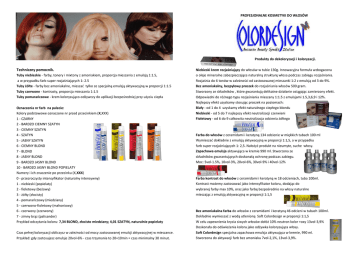 PROFESJONALNE KOSMETYKI DO WŁOSÓW Produkty do dekoloryzacji i koloryzacji. Techniczny pomocnik. Tuby niebieskie - farby, tonery i mixtony z amoniakiem, proporcja mieszania z emulsją 1:1.5, a w przypadku farb super rozjaśniających 1: 2.5 Tuby żółte - farby bez amoniakalne, mieszać tylko ze specjalną emulsją aktywacyjną w proporcji 1:1.5 Tuby czerwone - kontrasty, proporcja mieszania 1:1.5 Tuby pomarańczowe - krem koloryzująco-odżywczy do aplikacji bezpośredniej przy użyciu ciepła Oznaczenia nr farb na palecie: Kolory podstawowe oznaczone nr przed przecinkiem (X,XXX) 1 - CZARNY 2 - BARDZO CIEMNY SZATYN 3 - CIEMNY SZATYN 4 - SZATYN 5 - JASNY SZATYN 6 - CIEMNY BLOND 7 - BLOND 8 - JASNY BLOND 9 - BARDZO JASNY BLOND 10 - BARDZO JASNY BLOND POPIELATY Numery i ich znaczenie po przecinku (X,XXX) 0 - przezroczysty intensyfikator (naturalny intensywny) 1 - niebieski (popielaty) 2 - fioletowy (beżowy) 3 - żółty (złocisty) 4 - pomarańczowy (miedziany) 5 - czerwono-fioletowy (mahoniowy) 6 - czerwony (czerwony) 7 - zimny brąz (palisander) Przykład odczytania koloru: 7,34 BLOND, złocisto miedziany; 4,01 SZATYN, naturalnie popielaty Czas pełnej koloryzacji obliczysz w zależności od mocy zastosowanej emulsji aktywacyjnej w mieszance. Przykład: gdy zastosujesz emulsje 20vol-6% - czas trzymania to 20+10min = czas minimalny 30 minut. Niebieski krem rozjaśniający do włosów w tubie 130g. Innowacyjna formuła wzbogacona o oleje mineralne zabezpieczające naturalną strukturę włosa podczas zabiegu rozjaśniania. Rozjaśnia do 6 tonów w zależności od zastosowanej mieszanki 1:2 z emulsją od 3 do 9%. Bez amoniakalny, bezpyłowy proszek do rozjaśniania włosów 500 gram. Stworzony ze składników , które gwarantują delikatne działanie osiągając zamierzony efekt. Odpowiedni do różnego typu rozjaśniania mieszany 1:1.5 z emulsjami 1.5,3,6,9 i 12%. Najlepszy efekt uzyskamy stosując proszek na poziomach: Biały - od 1 do 4 uzyskamy efekt naturalnego ciepłego blondu Niebieski - od 5 do 7 najlepszy efekt neutralizacji czerwieni Fioletowy - od 6 do 9 całkowita neutralizacja odcienia żółtego Farba do włosów z ceramidami i keratyną 134 odcienie w miękkich tubach 100 ml Wymieszać dokładnie z emulsją aktywacyjną w proporcji 1:1,5, a w przypadku farb super rozjaśniających 1: 2,5. Nałożyć produkt na nieumyte, suche włosy. Zapachowa emulsja aktywująca w kremie 990 ml. Stworzona ze składników gwarantujących doskonałą ochronę podczas zabiegu. Moc: 5vol-1.5%, 10vol-3%, 20vol-6%, 30vol-9% i 40vol-12% Farba kontrast do włosów z ceramidami i keratyną w 18 odcieniach, tuba 100ml. Kontrast możemy zastosować jako intensyfikator koloru, dodając do wybranej farby max 10%, oraz jako farbę bezpośrednio na włosy naturalne mieszając z emulsją aktywacyjną w proporcji 1:1,5 Bez amoniakalna farba do włosów z ceramidami i keratyną 46 odcieni w tubach 100ml. Dokładnie wymieszać z wodą utlenioną Soft Colordesign w proporcji 1:1,5 W celu zapewnienia krycia siwych włosów dołóż 10% neutron kolor +oxy 13vol-3,9% Doskonała do odświeżenia koloru jako odżywka koloryzująca włosy. Soft Colordesign specjalna zapachowa emulsja aktywująca w kremie, 990 ml. Stworzona do aktywacji farb bez amoniaku 7vol-2,1%, 13vol-3,9%. Zabezpieczenie i pielęgnacja włosów Szampon rekonstruujący 300ml z ceramidami i keratyną - zawiera dużą zawartość aktywnych składników pozwalających odbudować i odżywić zmęczone włosy. Idealny do pielęgnacji włosów i skóry głowy po zabiegach technicznych. Ampułki rekonstruujące z ceramidami i keratyną 12 x 10 ml - dzięki zawartości składników leczniczych natychmiast sprawiają, że włosy stają się miękkie i lśniące. Dwa sposoby zastosowania pozwalają zregenerować włosy po zabiegu chemicznych, jak również zabezpieczyć skórę głowy przed rozjaśnieniem, koloryzacją lub ondulacją. Pianka rekonstruująca z ceramidami i keratyną 250 ml. Dzięki zawartości wysokiej jakości protein zbożowych doskonale nawilża i odżywia zniszczone włosy. Może być użyta w połączeniu z mieszanką do koloryzacji lub trwałej ondulacji włosów. Zabezpiecza włosy przed nadmiernym wysuszeniem chroniąc podczas chemicznego zabiegu. Maska rekonstruująca z keratyną i ceramidami 200 i 500ml. Przeznaczona do włosów suchych i zmęczonych zabiegami chemicznymi. Zastosowanie ułatwia natychmiastowe rozczesanie plączących się włosów. Najskuteczniejsza bezpośrednio po zabiegach farbowania, rozjaśniania lub trwałej ondulacji. Szampon przeciw wypadaniu włosów 300ml wzbogacony o ceramidy. Produkt przeznaczony do codziennej pielęgnacji wszystkich rodzajów włosów, szczególnie cienkich i słabych. Działanie szamponu powoduje poprawienie ukrwienia skóry głowy przyczyniając się jednocześnie do zachowania naturalnej równowagi skóry. Ampułki przeciw wypadaniu - dzięki zawartości aktywnych wyciągów z arniki i mentolu skutecznie zwalczają efekty nadmiernego, czasowego lub chronicznego wypadania włosów. Szampon przeciwłupieżowy 300ml, wzbogacony o wyciąg z kiełków pszenicy i ceramidy. Specjalnie dobrana formuła pozwala na prawidłowe utrzymanie równowagi skóry głowy. Ampułki przeciwłupieżowe- wzbogacone o wyciąg z kiełków pszenicy, ceramidy i mentol. Specjalnie dobrana formuła pozwala na prawidłowe zachowanie równowagi skóry głowy. Szampon do włosów przetłuszczających 300ml Formuła wzbogacona o aktywne składniki poprawiające metabolizm skóry głowy co natychmiast skutkuje eliminacją nadmiernego wydzielania sebum. Szampon relaksujący do włosów farbowanych i po trwałej ondulacji 300ml aktywne składniki zawarte w produkcie pomagają uelastycznić i nabłyszczyć włosy oraz aktywne składniki sprawiają, że są miękkie i łatwe do ułożenia. Szampon nawilżający 300ml z ceramidami jedwabiu jest delikatnym produktem odpowiednim do częstego użycia. Idealny do pielęgna