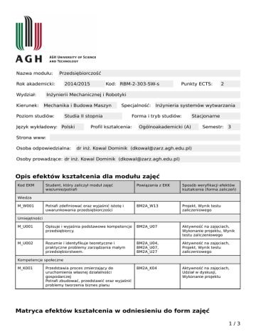 Nazwa modułu: Przedsiębiorczość Rok akademicki: Wydział: Kierunek: 2014/2015 Kod: RBM-2-303-SW-s Punkty ECTS: 2 Inżynierii Mechanicznej i Robotyki Mechanika i Budowa Maszyn Poziom studiów: Specjalność: Studia II stopnia Język wykładowy: Polski Inżynieria systemów wytwarzania Forma i tryb studiów: Profil kształcenia: Stacjonarne Ogólnoakademicki (A) Semestr: 3 Strona www: Osoba odpowiedzialna: dr inż. Kowal Dominik ([email protected]) Osoby prowadzące: dr inż. Kowal Dominik ([email protected]) Opis efektów kształcenia dla modułu zajęć Kod EKM Student, który zaliczył moduł zajęć wie/umie/potrafi Powiązania z EKK Sposób weryfikacji efektów kształcenia (forma zaliczeń) Potrafi zdefiniować oraz wyjaśnić istotę i uwarunkowania przedsiębiorczości BM2A_W13 Projekt, Wynik testu zaliczeniowego M_U001 Opisuje i wyjaśnia podstawowe kompetencje przedsiębiorcy. BM2A_U07 Aktywność na zajęciach, Wykonanie projektu, Wynik testu zaliczeniowego M_U002 Rozumie i identyfikuje teoretyczne i praktyczne problemy zarządzania małym przedsiębiorstwem. BM2A_U04, BM2A_U07, BM2A_U27 Aktywność na zajęciach, Projekt, Wynik testu zaliczeniowego BM2A_K04 Aktywność na zajęciach, Udział w dyskusji, Wykonanie projektu Wiedza M_W001 Umiejętności Kompetencje społeczne M_K001 Przedstawia proces zmierzający do uruchomienia własnej działalności gospodarczej Potrafi zbudować, przedstawić oraz wyjaśnić problemy tworzenia biznes planu Matryca efektów kształcenia w odniesieniu do form zajęć 1/3 Karta modułu - Przedsiębiorczość Konwersatori um Zajęcia seminaryjne Zajęcia praktyczne Zajęcia terenowe Zajęcia warsztatowe + + - - - - - - - - - M_U001 Opisuje i wyjaśnia podstawowe kompetencje przedsiębiorcy. + + - - - - - - - - - M_U002 Rozumie i identyfikuje teoretyczne i praktyczne problemy zarządzania małym przedsiębiorstwem. + + - - - - - - - - - - + - - - - - - - - - E-learning Ćwiczenia projektowe Potrafi zdefiniować oraz wyjaśnić istotę i uwarunkowania przedsiębiorczości Inne Ćwiczenia laboratoryjne Forma zajęć Ćwiczenia audytoryjne Student, który zaliczył moduł zajęć wie/umie/potrafi Wykład Kod EKM Wiedza M_W001 Umiejętności Kompetencje społeczne M_K001 Przedstawia proces zmierzający do uruchomienia własnej działalności gospodarczej Potrafi zbudować, przedstawić oraz wyjaśnić problemy tworzenia biznes planu Treść modułu zajęć (program wykładów i pozostałych zajęć) Wykład 1. 2. 3. 4. 5. 6. 7. Pojęcie oraz istota przedsiębiorczości (definicja, rodzaje) Kompetencje przedsiębiorcze Instytucjonalne warunki prowadzenia własnej działalności gospodarczej Procedury założenia i uruchomienia przedsiębiorstwa w Polsce Źródła finansowania nowego przedsięwzięcia Analiza finansowa małej firmy Innowacyjność jako podstaw działań przedsiębiorczych Ćwiczenia audytoryjne 1. Biznes plan – przyczyny tworzenia, funkcje i formy 2. Typowy układ biznes planu 3. Źródła informacji niezbędnych do opracowania biznesplanu 4. Problemy i zadania występujące przy tworzeniu biznes planu 5. Wybrane, praktyczne aspekty zarządzania w małych przedsiębiorstwach W ramach zajęć seminaryjnych studenci w grupach projektowych opracują biznesplan przykładowej małej firmy. Zajęcia seminaryjne 2/3 Karta modułu - Przedsiębiorczość Sposób obliczania oceny końcowej Ocena końcowa : (40%). test zaliczeniowy z wykładów, seminarium (60%), projekt grupowy biznes planu Wymagania wstępne i dodatkowe Wymagana wiedza z zarządzania przedsiębiorstwem, podstaw marketingu oraz ekonomii. Zalecana literatura i pomoce naukowe 1. P.F. Drucker, Innowacje i przedsiębiorczość. Praktyka i zasady, PWE, Warszawa 1992. 2. S. Kwiatkowski, Przedsiębiorczość intelektualna. Wydawnictwo PWN, Warszawa 2000. 3. B. Wierzba, E. Filipiak, Przedsiębiorczość, ABC small business’u, Warszawa 2002 4. B. Glinka, S. Gudkova, Przedsiębiorczość, Oficyna Wolters Kluwer business, Warszawa 2011. 5. Przedsiębiorczość. Jak założyć i prowadzić własną firmę?, pod red. H. Godlewska-Majkowska, SGH w Warszawie, Warszawa 2009. 6. M. E. Gordon, Przedsiębiorczość, Onepress, Warszawa 2009. 7. K. Wach, Jak założyć firmę w UE, Oficyna Ekonomiczna, Kraków 2004. Publikacje naukowe osób prowadzących zajęcia związane z tematyką modułu Nie podano dodatkowych publikacji Informacje dodatkowe Ogólne warunki zaliczenia i uczestnictwa w zajęciach zgodnie z Regulaminem studiów. Nakład pracy studenta (bilans punktów ECTS) Forma aktywności studenta Obciążenie studenta Udział w wykładach 15 godz Udział w ćwiczeniach audytoryjnych 15 godz Dodatkowe godziny kontaktowe z nauczycielem 5 godz Przygotowanie sprawozdania, pracy pisemnej, prezentacji, itp. 2 godz Samodzielne studiowanie tematyki zajęć 3 godz Wykonanie projektu 10 godz Sumaryczne obciążenie pracą studenta 50 godz Punkty ECTS za moduł 2 ECTS 3/3