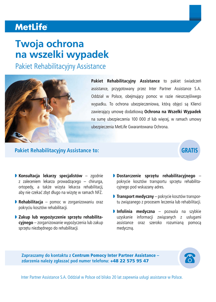 Twoja ochrona na wszelki wypadek Pakiet Rehabilitacyjny Assistance Pakiet Rehabilitacyjny Assistance to pakiet świadczeń assistance, przygotowany przez Inter Partner Assistance S.A. Oddział w Polsce, obejmujący pomoc w razie nieszczęśliwego wypadku. To ochrona ubezpieczeniowa, którą objęci są Klienci zawierający umowę dodatkową Ochrona na Wszelki Wypadek na sumę ubezpieczenia 100 000 zł lub więcej, w ramach umowy ubezpieczenia MetLife Gwarantowana Ochrona. GRATIS Pakiet Rehabilitacyjny Assistance to: Konsultacja lekarzy specjalistów – zgodnie z zaleceniem lekarza prowadzącego – chirurga, ortopedy, a także wizyta lekarza rehabilitacji, aby nie czekać zbyt długo na wizytę w ramach NFZ. Rehabilitacja – pomoc w zorganizowaniu oraz pokryciu kosztów rehabilitacji. Zakup lub wypożyczenie sprzętu rehabilitacyjnego – zorganizowanie wypożyczenia lub zakup sprzętu niezbędnego do rehabilitacji. Dostarczenie sprzętu rehabilitacyjnego – pokrycie kosztów transportu sprzętu rehabilitacyjnego pod wskazany adres. Transport medyczny – pokrycie kosztów transportu związanego z procesem leczenia lub rehabilitacji. Infolinia medyczna – pozwala na szybkie uzyskanie informacji związanych z usługami assistance oraz szeroko rozumianą pomocą medyczną. Zapraszamy do kontaktu z Centrum Pomocy Inter Partner Assistance – zdarzenia należy zgłaszać pod numer telefonu: +48 22 575 95 47 Inter Partner Assistance S.A. Oddział w Polsce od blisko 20 lat zapewnia usługi assistance w Polsce. Warunki Ubezpieczenia „Pakiet Rehabilitacyjny Assistance” Rodzaj informacji Numer zapisu z wzorca umownego 1.Przesłanki,którychzaistnieniezobowiązuje zakładubezpieczeńdowypłatyświadczenia lubwartościwykupuubezpieczenia §3(Tabelanr1),§4WU 2.Ograniczeniaorazwyłączenia odpowiedzialnościzakładuubezpieczeń uprawniającedoodmowywypłaty świadczenialubjegoobniżenia §3ust.1-3(Tabelanr1),§9,§10ust.2WU Postanowienia ogólne §1 1. Niniejsze Warunki Ubezpieczenia „Pakiet Rehabilitacyjny Assistance”, zwane dalej „WU”, mają zastosowanie do Umowy Ramowej Ubezpieczenia zawartej pomiędzy Inter Partner Assistance S.A. Oddział w Polsce z siedzibą w Warszawie, zwanym dalej „Ubezpieczycielem”, a MetLife Towarzystwo Ubezpieczeń na Życie i Reasekuracji S.A., zwanym dalej „Ubezpieczającym” lub „MetLife”. 2. Umowę ubezpieczenia zawiera się na rachunek klientów Ubezpieczającego, zdefiniowanych dalej jako „Ubezpieczeni”, przystępujących do umowy ubezpieczenia „Pakiet Rehabilitacyjny Assistance” w ramach umowy dodatkowej Ubezpieczenie na wypadek trwałego inwalidztwa NW wraz ze świadczeniem miesięcznym „Ochrona na Wszelki Wypadek”. Definicje §2 Pojęciom określonym w niniejszych WU nadaje się znaczenie określone poniżej. 1. Amatorskie uprawianie sportów – aktywność sportowa, której celem jest rekreacja i rozrywka. 2. Centrum Pomocy – Inter Partner Assistance Polska S.A. z siedzibą w Warszawie przy ul. Chłodnej 51 – przedstawiciel Ubezpieczyciela, za pośrednictwem którego udzielane są świadczenia assistance, którego numer telefonu podany jest do wiadomości Ubezpieczonych przez Ubezpieczającego. 3. Choroba przewlekła – diagnozowany przed rozpoczęciem okresu ubezpieczenia stan chorobowy, charakteryzujący się powolnym rozwojem oraz długookresowym przebiegiem, leczony stale lub okresowo, lub będący przyczyną hospitalizacji w okresie 12 miesięcy przed rozpoczęciem okresu ubezpieczenia. 4. Choroba psychiczna – choroba zakwalifikowana w Międzynarodowej Kwalifikacji Chorób i Problemów Zdrowotnych ICD-10 jako zaburzenia psychiczne i zaburzenia zachowania. 5. Lekarz Centrum Pomocy – osoba uprawniona do wykonywania zawodu lekarza zgodnie z polskim prawem, wskazana przez Centrum Pomocy i uprawniona do występowania w imieniu Centrum Pomocy. 6. Lekarz prowadzący – lekarz przydzielony do opieki nad Ubezpieczonym z ramienia Placówki medycznej, w której Ubezpieczony poddał się leczeniu. 7. Miejsce pobytu – znajdujące się na terytorium Polski miejsce, w którym przebywa Ubezpieczony. 8. Miejsce zamieszkania – adres miejsca zamieszkania Ubezpieczonego na terytorium Polski, podany w momencie zgłoszenia roszczenia do Centrum Pomocy. 9. Nieszczęśliwy wypadek – gwałtowne i nagłe zdarzenie, które miało miejsce w okresie trwania ochrony ubezpieczeniowej, wywołane przyczyną zewnętrzną, w następstwie którego Ubezpieczony – niezależnie od swojej woli oraz stanu zdrowia – doznał uszkodzenia ciała lub rozstroju zdrowia, skutkujące koniecznością uzyskania pomocy medycznej. 10. Placówka medyczna – działający zgodnie z odpowiednimi przepisami prawa podmiot prowadzący działalność leczniczą, którego zadaniem jest świadczenie przez wykwalifikowaną kadrę pielęgniarską i lekarską całodobowej, całodziennej lub doraźnej opieki medycznej, leczenie lub wykonywanie zabiegów chirurgicznych. Za Placówkę medyczną nie uważa się ośrodka opieki społecznej, ośrodka dla psychicznie chorych, hospicjum, ośrodka leczenia uzależnień od alkoholu, narkotyków, leków i innych tego typu środków, ośrodka sanatoryjnego, ośrodka wypoczynkowego, ośrodka SPA. 11. Rehabilitacja narządu ruchu – obejmuje czynności, których celem jest utrzymanie, przywrócenie lub poprawa stanu narządu ruchu w zakresie układu kostno-mięśniowo-szkieletowego, tj. kręgosłupa, kończyn dolnych i górnych. 12. Sprzęt rehabilitacyjny – sprzęt niezbędny w okresie rehabilitacji, umożliwiający Ubezpieczonemu samodzielne funkcjonowanie. 13. Szpital – działający zgodnie z prawem podmiot prowadzący działalność leczniczą, udzielający świadczeń szpitalnych, przeznaczony dla chorych wymagających opieki leczniczej, zabiegów operacyjnych lub zabiegów diagnostycznych, zapewniający chorym całodobową opiekę średniego i wyższego personelu medycznego. Za szpital nie uważa się ośrodka opi