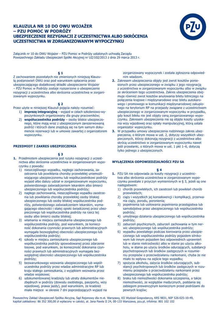 Klauzula nr 10 do OWU Wojażer – PZU Pomoc w Podróży Ubezpieczenie rezygnacji z uczestnictwa albo skrócenia uczestnictwa w zorganizowanym wypoczynku Załącznik nr 10 do OWU Wojażer – PZU Pomoc w Podróży ustalonych uchwałą Zarządu Powszechnego Zakładu Ubezpieczeń Spółki Akcyjnej nr UZ/102/2013 z dnia 29 marca 2013 r. §1 Z zachowaniem pozostałych nie zmienionych niniejszą Klauzulą postanowień OWU oraz pod warunkiem opłacenia przez ubezpieczającego dodatkowej składki ubezpieczenie Wojażer – PZU Pomoc w Podróży zostaje rozszerzone o ubezpieczenie rezygnacji z uczestnictwa albo skrócenia uczestnictwa w zorganizowanym wypoczynku. §2 Przez użyte w niniejszej Klauzuli pojęcia należy rozumieć: 1) imprezę integracyjną – wyjazd w celach szkoleniowo-wypoczynkowych organizowany dla grupy pracowników; 2) współuczestnika podróży – osoby bliskie ubezpieczonego, które mają wraz z ubezpieczonym zarezerwowaną podróż i których dane znajdują się na tym samym dokumencie rezerwacji lub w umowie zawartej z organizatorem wypoczynku. Przedmiot i zakres ubezpieczenia §3 1. Przedmiotem ubezpieczenia jest ryzyko rezygnacji z uczestnictwa albo skrócenia uczestnictwa w zorganizowanym wypoczynku z powodu: 1) nieszczęśliwego wypadku, nagłego zachorowania, zaostrzenia lub powikłania choroby przewlekłej uniemożliwiającego ubezpieczonemu lub współuczestnikowi podróży wyjazd albo dalszy udział w zorganizowanym wypoczynku, potwierdzonego zaświadczeniem lekarskim albo śmierci ubezpieczonego lub współuczestnika podróży; 2) nagłego zachorowania, nieszczęśliwego wypadku zaostrzenia lub powikłania choroby przewlekłej osoby bliskiej ubezpieczonego lub osoby bliskiej współuczestnika podróży, potwierdzonego zaświadczeniem lekarskim, wymagającego obecności i stałej opieki świadczonej przez ubezpieczonego lub współuczestnika podróży na rzecz tej osoby albo śmierci osoby bliskiej; 3) włamania w miejscu zamieszkania ubezpieczonego lub współuczestnika podróży, pod warunkiem, że konieczność dokonania czynności prawnych lub administracyjnych wymagała bezwzględnej obecności ubezpieczonego lub współuczestnika podróży; 4) szkody w miejscu zamieszkania ubezpieczonego lub współuczestnika podróży spowodowanej przez zdarzenie losowe, pod warunkiem, że konieczność dokonania czynności prawnych lub administracyjnych wymagała bezwzględnej obecności ubezpieczonego lub współuczestnika podróży; 5) bezwarunkowego wezwania ubezpieczonego lub współuczestnika podróży przez władze administracyjne RP lub kraju stałego zamieszkania, z wyjątkiem wezwania przez władze wojskowe; 6) udokumentowanej kradzieży lub utraty dokumentów niezbędnych w podróży (dowodu osobistego, paszportu, wizy wjazdowej, prawa jazdy), pod warunkiem, że kradzież miała miejsce w okresie 7 dni poprzedzających wyjazd na zorganizowany wypoczynek i została zgłoszona odpowiednim władzom. 2. Zakresem ubezpieczenia objęty jest zwrot kosztów poniesionych przez ubezpieczonego w związku z jego rezygnacją z uczestnictwa w zorganizowanym wypoczynku albo w związku ze skróceniem tego uczestnictwa. Zakres ubezpieczenia obejmuje również zwrot kosztów anulowania biletu lotniczego na połączenia krajowe i międzynarodowe oraz biletu autokarowego i promowego w komunikacji międzynarodowej zakupionego na terytorium RP na przejazdy związane z uczestnictwem ubezpieczonego w zorganizowanym wypoczynku w przypadku, gdy koszt biletu nie jest objęty ceną zorganizowanego wypoczynku. Zakresem ubezpieczenia nie są objęte koszty uzyskania wizy wjazdowej oraz opłaty manipulacyjnej, którą ustala organizator wypoczynku. 3. W przypadku umowy ubezpieczenia rodzinnego zakres ubezpieczenia, o którym mowa w ust. 2, dotyczy wszystkich ubezpieczonych, którzy dokonają rezygnacji z uczestnictwa albo skrócą uczestnictwo w zorganizowanym wypoczynku nawet jeśli przesłanki, o których mowa w ust. 1 pkt 1–6, dotyczą tylko jednego z ubezpieczonych. Wyłączenia odpowiedzialności PZU SA §4 1. PZU SA nie odpowiada za koszty rezygnacji z uczestnictwa albo skrócenia uczestnictwa w zorganizowanym wypoczynku powstałe z przyczyn wymienionych w § 3, jeżeli są one następstwem: 1) chorób przewlekłych, ich zaostrzeń lub powikłań chorób przewlekłych; 2) ciąży i wszystkich jej konsekwencji i komplikacji, przerwania ciąży, porodu, poronienia; 3) popełnienia lub usiłowania popełnienia przestępstwa lub samobójstwa przez ubezpieczonego lub współuczestnika podróży; 4) umyślnego działania ubezpieczonego lub współuczestnika podróży; 5) zaburzeń psychicznych, zaburzeń zachowania w tym nerwic ubezpieczonego lub współuczestnika podróży; 6) wypadku powstałego podczas kierowania przez ubezpieczonego lub współuczestnika podróży pojazdem silnikowym lub innym pojazdem bez odpowiednich uprawnień lub w stanie nietrzeźwości albo w stanie po użyciu alkoholu, w stanie po użyciu środków odurzających, substancji psychotropowych lub środków zastępczych w rozumieniu przepisów o przeciwdziałaniu narkomanii, chyba że nie miało to wpływu na zajście tego wypadku; 7) spożycia alkoholu, zażycia środków odurzających, substancji psychotropowych lub środków zastępczych w rozumieniu przepisów o przeciwdziałaniu narkomanii przez ubezpieczonego lub współuczestnika podróży; 8) braku lub niemożliwości dokonania szczepienia, a także niemożliwości, ze względów medycznych, poddania się zabiegom prewencyjnym koniecznym przed podróżami do pewnych krajów; Powszechny Zakład Ubezpieczeń Spółka Akcyjna, Sąd Rejonowy dla m.st. Warszawy, XII Wydział Gospodarczy, KRS 9831, NIP 526-025-10-49, kapitał zakładowy: 86 352 300,00 zł wpłacony w całości, al. Jana Pawła II 24, 00-133 Warszawa, pzu.pl, infolinia: 801 102 102 9) aktów terroryzmu, działań wojennych, stanu wojennego lub stanu wyjątkowego występujących lub mogących wyst