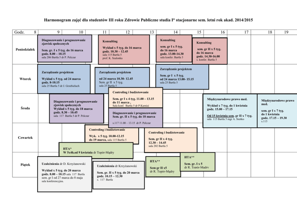 Harmonogram zajęć dla studentów III roku Zdrowie Publiczne studia I° stacjonarne sem. letni rok akad. 2014/2015 Godz. 8 9 10 11 Diagnozowanie i prognozowanie zjawisk społecznych Poniedziałek Sem. gr. I x 5 tyg. do 16 marca godz. 8.00 – 10.15 13 14 Konsulting Konsulting Wykład x 5 tyg. do 16 marca godz. 10.30 – 12.45 sem. gr I x 5 tyg. do 16 marca godz. 13.00-14.30 sala 115 Bartla 5 prof. K. Szalonka sala 206 Bartla 5 dr P. Pelczar Wtorek 12 Zarządzanie projektem Zarządzanie projektem Wykład x 5 tyg. od 24 marca godz. 8-10.15 od 24 marca 10.30- 12.45 Sem. gr II x 5 tyg. sala 25 Bartla 5 dr J. Grzebieluch sala 25 Bartla 5 15 16 17 18 19 Konsulting sem. gr II x 5 tyg. do 16 marca godz. 14.30-16.00 sala konfer. Bartla 5 s. konfer. Bartla 5 Zarządzanie projektem Sem. gr I x 5 tyg. od 24 marca 13.00- 15.15 sala 25 Bartla 5 Controling i budżetowanie Środa Diagnozowanie i prognozowanie zjawisk społecznych Wykład x 5 tyg. do 18 marca godz. 8.30 – 10.45 sala 117 Bartla 5 dr P. Pelczar Sem. gr I x 4 tyg. 11.00 – 13.15 do 11 marca , Międzynarodowe prawo med. Sala konf. Bartla 5 dr P.Karniej Wykład x 7 tyg. do 1 kwietnia godz. 15.00 – 17.15 Diagnozowanie i prognozowanie Sem. gr. II x 5 tyg. do 18 marca Od 15 kwietnia sem. gr II x 7 tyg. sala 115 Bartla 5 mgr A. Sieńko s.117 11.00 – 13.15 dr P. Pelczar Controling i budżetowanie Wyk. x 5 tyg. 10.00-12.15 do 19 marca, sala 115 Bartla 5 dr P. Karniej Czwartek Controling i budżetowanie Sem. gr II x 4 tyg. 12.30 – 14.45 sala 202 Bartla 5 HTA* W 5x4h.od 9 kwietnia dr Topór-Mądry HTA** Piątek Uzależnienia dr D. Krzyżanowski Wykład x 5 tyg. do 20 marca godz. 8.00 – 10.15 sala 117 Bartla sem. gr I od 27 marca do 8 maja sala konferencyjna. HTA** Uzależnienia dr Krzyżanowski Sem. gr. II x 5 tyg. do 20 marca godz. 10.15 – 12.30 s. 117 Bartla Sem gr II x5 dr R. Topór-Mądry Sem. gr. I x 5 dr R. Topór-Mądry Międzynarodowe prawo med. sem. gr I x 7 tyg. do 1 kwietnia godz. 17.15 – 19.30 s.115 * HTA wykłady z dr Toporem-Mądrym od godz. 9.00 – 12.00 w terminach i salach Ul. Bartla 5: 9 i 16 IV – sala 106 7 i 28 V; 4 VI – sala 117 ** HTA seminaria: 10 i 17 IV– gr II godz. 12. 30 – 14 sala konferencyjna oraz 8 V gr. I godz. 14.00 – 15.30 s. 115 29 V i 5 VIgr II godz. 12. 30 – 14 sala 10 gr. I godz. 14.00 – 15.30 sala 10
