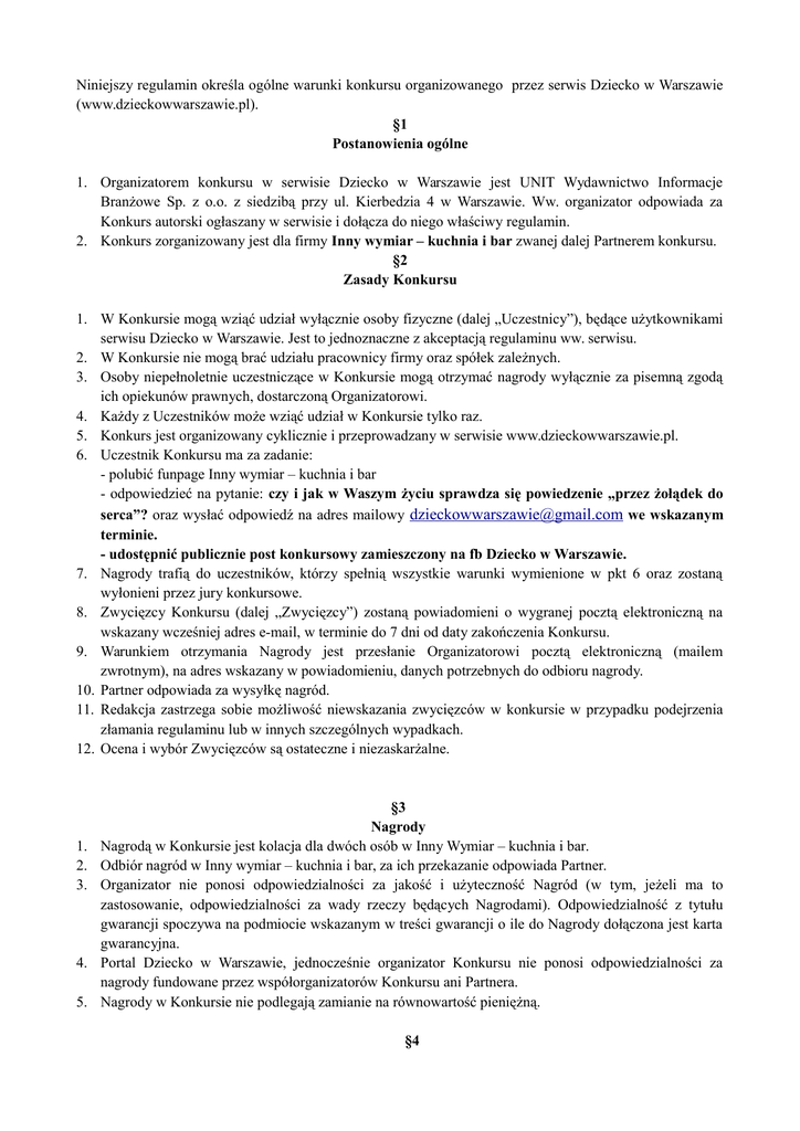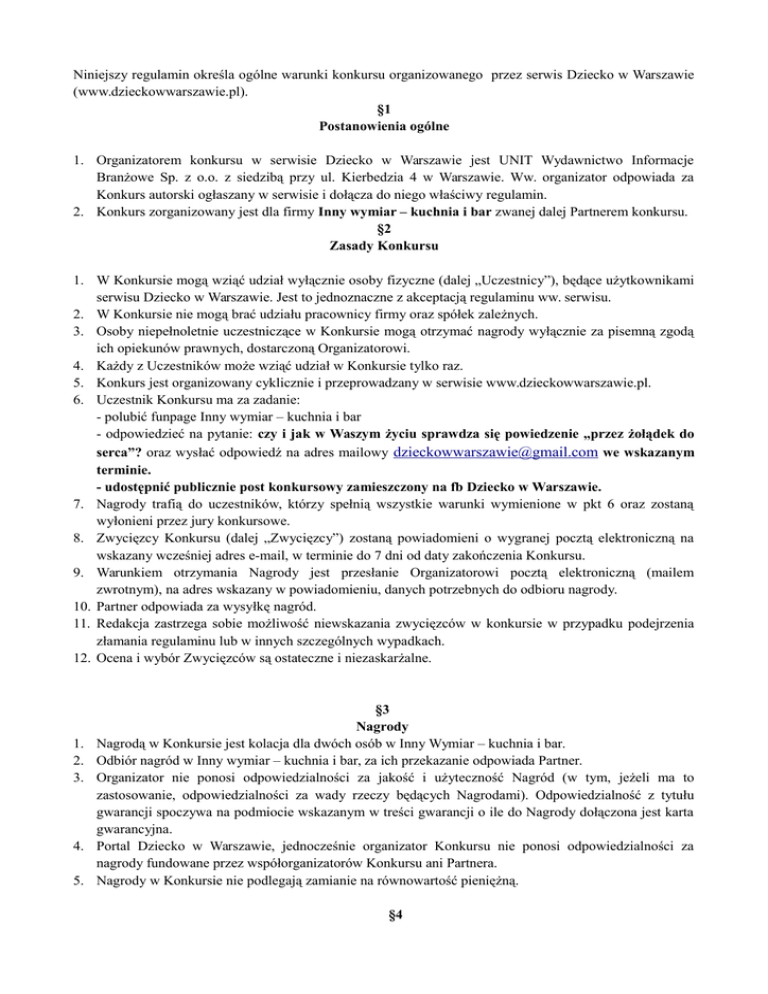 Niniejszy regulamin określa ogólne warunki konkursu organizowanego przez serwis Dziecko w Warszawie (www.dzieckowwarszawie.pl). §1 Postanowienia ogólne 1. Organizatorem konkursu w serwisie Dziecko w Warszawie jest UNIT Wydawnictwo Informacje Branżowe Sp. z o.o. z siedzibą przy ul. Kierbedzia 4 w Warszawie. Ww. organizator odpowiada za Konkurs autorski ogłaszany w serwisie i dołącza do niego właściwy regulamin. 2. Konkurs zorganizowany jest dla firmy Inny wymiar – kuchnia i bar zwanej dalej Partnerem konkursu. §2 Zasady Konkursu 1. W Konkursie mogą wziąć udział wyłącznie osoby fizyczne (dalej „Uczestnicy”), będące użytkownikami serwisu Dziecko w Warszawie. Jest to jednoznaczne z akceptacją regulaminu ww. serwisu. 2. W Konkursie nie mogą brać udziału pracownicy firmy oraz spółek zależnych. 3. Osoby niepełnoletnie uczestniczące w Konkursie mogą otrzymać nagrody wyłącznie za pisemną zgodą ich opiekunów prawnych, dostarczoną Organizatorowi. 4. Każdy z Uczestników może wziąć udział w Konkursie tylko raz. 5. Konkurs jest organizowany cyklicznie i przeprowadzany w serwisie www.dzieckowwarszawie.pl. 6. Uczestnik Konkursu ma za zadanie: - polubić funpage Inny wymiar – kuchnia i bar - odpowiedzieć na pytanie: czy i jak w Waszym życiu sprawdza się powiedzenie „przez żołądek do serca”? oraz wysłać odpowiedź na adres mailowy [email protected] we wskazanym terminie. - udostępnić publicznie post konkursowy zamieszczony na fb Dziecko w Warszawie. 7. Nagrody trafią do uczestników, którzy spełnią wszystkie warunki wymienione w pkt 6 oraz zostaną wyłonieni przez jury konkursowe. 8. Zwycięzcy Konkursu (dalej „Zwycięzcy”) zostaną powiadomieni o wygranej pocztą elektroniczną na wskazany wcześniej adres e-mail, w terminie do 7 dni od daty zakończenia Konkursu. 9. Warunkiem otrzymania Nagrody jest przesłanie Organizatorowi pocztą elektroniczną (mailem zwrotnym), na adres wskazany w powiadomieniu, danych potrzebnych do odbioru nagrody. 10. Partner odpowiada za wysyłkę nagród. 11. Redakcja zastrzega sobie możliwość niewskazania zwycięzców w konkursie w przypadku podejrzenia złamania regulaminu lub w innych szczególnych wypadkach. 12. Ocena i wybór Zwycięzców są ostateczne i niezaskarżalne. 1. 2. 3. 4. 5. §3 Nagrody Nagrodą w Konkursie jest kolacja dla dwóch osób w Inny Wymiar – kuchnia i bar. Odbiór nagród w Inny wymiar – kuchnia i bar, za ich przekazanie odpowiada Partner. Organizator nie ponosi odpowiedzialności za jakość i użyteczność Nagród (w tym, jeżeli ma to zastosowanie, odpowiedzialności za wady rzeczy będących Nagrodami). Odpowiedzialność z tytułu gwarancji spoczywa na podmiocie wskazanym w treści gwarancji o ile do Nagrody dołączona jest karta gwarancyjna. Portal Dziecko w Warszawie, jednocześnie organizator Konkursu nie ponosi odpowiedzialności za nagrody fundowane przez współorganizatorów Konkursu ani Partnera. Nagrody w Konkursie nie podlegają zamianie na równowartość pieniężną. §4 Postanowienia końcowe 1. Udział w Konkursie jest jednoznaczny z udzieleniem prawa do nieodpłatnego wykorzystywania materiałów w następujących polach eksploatacji: druku w dowolnej liczbie publikacji i w dowolnym nakładzie, używania ich w Internecie oraz w innych formach utrwaleń, nadających się do rozpowszechniania w ramach działań serwisu Dziecko w Warszawie. 2. Akceptując treść niniejszego regulaminu i biorąc udział w konkursie uczestnik wyraża zgodę na otrzymywanie newslettera wysyłanego przez Dziecko w Warszawie oraz na przetwarzanie swoich danych osobowych podanych Organizatorowi w poniższym zakresie. Podane dane osobowe będą przetwarzane zgodnie z ustawą z dnia 29 sierpnia 1997 r. o ochronie danych osobowych przez UNIT Wydawnictwo Informacje Branżowe Sp. Z o.o. z siedzibą w Warszawie, 00-728, ul. Kierbedzia 4, zarejestrowanym w Sądzie Rejonowym dla m.st. Warszawy, XIII Wydział Gospodarczy pod numerem KRS: 0000030149, będącym czynnym płatnikiem podatku VAT o numerze identyfikacji podatkowej NIP: 527-10-48-139, Kapitał zakładowy 1. 000.000,00 PLN, wydawcą magazynu Dziecko w Warszawie, reprezentowanym przez: Członka Zarządu – Beatę Łuczyńską dla celów organizacji i przeprowadzenia konkursu, wyłonienia i powiadomienia ewentualnych zwycięzców oraz przekazania ewentualnych nagród, w szeroko pojętych celach marketingowych i promocyjnych towarów i usług, a także w celach statystycznych, analitycznych oraz nawiązywania kontaktu z właścicielem danych. Podanie danych jest dobrowolne jednak konieczne do wzięcia udziału w konkursie. 3. UNIT Wydawnictwo Informacje Branżowe Sp. z o.o. informuje, że jest administratorem danych osobowych w rozumieniu w/w ustawy. Właściciel danych ma prawo do wglądu do swoich danych oraz ich poprawiania w siedzibie spółki. Nadto właściciel danych ma prawo w każdym czasie wyrazić sprzeciw co do przetwarzania jego danych przez Spółkę w zakresie dozwolonym przez w/w ustawę. 4. Nadesłanie odpowiedzi oznacza akceptację warunków Konkursu i Regulaminu, którego ostateczna interpretacja należy do organizatorów konkursu. Żadne odwołania nie zostaną uwzględnione. 5. Organizatorzy zastrzegają sobie prawo do dyskwalifikowania odpowiedzi niespełniających wymogów uwzględnionych w Konkursie. 6. Organizator zastrzega sobie prawo do niewydania nagrody w przypadku pozostającego w związku z Konkursem naruszenia przez Uczestników przepisów Regulaminu lub powszechnie obowiązujących przepisów prawa. 7. Zwycięzca jest zwolniony z obowiązku płacenia podatku od nagrody. Jeśli jednorazowa wartość wygranej nie przekracza kwoty 760 zł, a konkurs był organizowany i emitowany (ogłaszany) przez środki masowego przekazu takie jak prasa, radio, telewizja, przychód uzyskany przez podatnika w postaci nagrody będzie wolny od podatku. Podstawa prawna: ustawa z dnia 26.07.1991 r. o podatku doc
