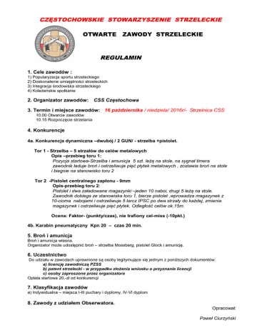 CZĘSTOCHOWSKIE STOWARZYSZENIE STRZELECKIE OTWARTE ZAWODY STRZELECKIE REGULAMIN 1. Cele zawodów : 1) Popularyzacja sportu strzeleckiego 2) Doskonalenie umiejętności strzeleckich 3) Integracja środowiska strzeleckiego 4) Koleżeńskie spotkanie 2. Organizator zawodów: CSS Częstochowa 3. Termin i miejsce zawodów: 16 października / niedziela/ 2016r/- Strzelnica CSS 10.00 Otwarcie zawodów 10.15 Rozpoczęcie strzelania 4. Konkurencje 4a. Konkurencja dynamiczna –dwubój / 2 GUN/ - strzelba +pistolet. Tor 1 - Strzelba – 5 strzałów do celów metalowych Opis –przebieg toru 1: Pozycja startowa-Strzelba i amunicja 5 szt. leżą na stole, na sygnał timera zawodnik ładuje broń i ostrzeliwuje pięć płytek metalowych , zostawia broń na stole i biegnie na stanowisko toru 2 Tor 2 -Pistolet centralnego zapłonu - 9mm Opis-przebieg toru 2: Pistolet i dwa załadowane magazynki –jeden 10 naboi, drugi 5 leżą na stole. Zawodnik dobiega ze stanowiska toru 1, bierze pistolet ,wprowadza magazynek z 10-cioma nabojami i ostrzeliwuje 5 tarcz IPSC po dwa strzały do każdej, zmienia magazynek i ostrzeliwuje pięć płytek. Odległość celów ok.15m. Ocena: Faktor- (punkty/czas), nie trafiony cel-miss (-10pkt.) 4b. Karabin pneumatyczny Kpn 20 – czas 20 min. 5. Broń i amunicja Broń i amunicja własna. Organizator może udostępnić broń – strzelba Mossberg, pistolet Glock i amunicję. 6. Uczestnictwo Do udziału w zawodach uprawnione są osoby legitymujące się jednym z poniższych dokumentów: a) licencję zawodniczą PZSS b) patent strzelecki - w przypadku złożenia wniosku o przyznanie licencji c) osoby zaproszone przez organizatora Opłata startowa 20,-zł od konkurencji 7. Klasyfikacja zawodów a) Indywidualna – miejsca I-III puchary i dyplomy, IV-VI dyplom 8. Zawody z udziałem Obserwatora. Opracował: Paweł Ciurzyński