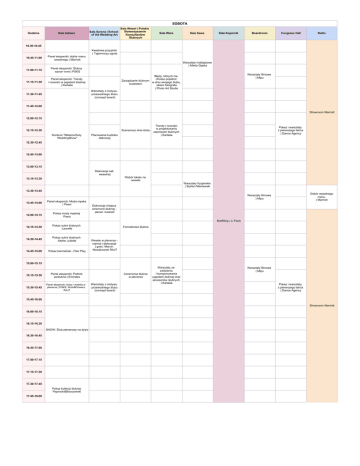 SOBOTA Godzina Sala balowa Sala Syrena | School of the Wedding Art Sala Wawel | Polskie Stowarzyszenie Konsultantów Ślubnych Sala Wars Sala Sawa Sala Kopernik Boardroom Congress Hall Baltic 10.30-10.45 10.45-11.00 Panel ekspercki: dobór menu weselnego | Marriott 11.00-11.15 Panel ekspercki: Ślubny savoir vivre | PSKŚ 11.15-11.30 Panel ekspercki: Trendy i nowości w papeterii ślubnej | Kartalia Kwiatowe przypinki | Tajemniczy ogród Warsztaty makijażowe | Marta Gąska Warsztaty z motywu przewodniego ślubu (concept board) 11.30-11.45 Warsztaty filmowe | Mipu Błędy, których nie chcesz popełnić Zarządzanie ślubnym w dniu swojego ślubu, budżetem okiem fotografa | Photo Art Studio 11.45-12.00 Showroom Marriott 12.00-12.15 12.15-12.30 Scenariusz dnia ślubu Konkurs "Metamorfozy WeddingShow" Planowanie budżetu dekoracji Trendy i nowości w projektowaniu zaproszeń ślubnych | Kartalia Pokaz i warsztaty z pierwszego tańca | Dance Agency 12.30-12.45 12.45-13.00 13.00-13.15 Dekoracje sali weselnej 13.15-13.30 Wybór lokalu na wesele Warsztaty fryzjerskie | Styliści Maniewski 13.30-13.45 13.45-14.00 Panel ekspercki: Moda męska | Pawo 14.00-14.15 Pokaz mody męskiej Pawo 14.15-14.30 Pokaz sukni ślubnych Laurelle 14.30-14.45 Pokaz sukni ślubnych Atelier Juliette 14.45-15.00 Pokaz barmański - Flair Play Dobór weselnego menu | Marriott Warsztaty filmowe | Mipu Dekoracje miejsca ceremonii ślubnej plener i kościół Braffiting | Li Parie Formalności ślubne Wesele w plenerze namiot i dekoracje | gość: Marcin Nowakowski RAJT 15.00-15.15 15.15-15.30 Panel ekspercki: Podróż poślubna | Emirates 15.30-15.45 Panel ekspercki: śluby i wesela w plenerze | PSKŚ, Rock&Flowers, RAJT Ceremonia ślubna w plenerze Warsztaty z motywu przewodniego ślubu (concept board) Warsztaty ze zdobienia i komponowania papeterii ślubnej oraz akcesoriów ślubnych | Kartalia Warsztaty filmowe | Mipu Pokaz i warsztaty z pierwszego tańca | Dance Agency 15.45-16.00 Showroom Marriott 16.00-16.15 16.15-16.30 SHOW: Ślub plenerowy na żywo 16.30-16.45 16.45-17.00 17.00-17.15 17.15-17.30 17.30-17.45 Pokaz kolekcji ślubnej Paprocki&Brzozowski 17.45-18.00 NIEDZIELA Godzina Sala balowa Sala Kometa Sala Syrena | School of the Wedding Art Sala Wawel | Polskie Stowarzyszenie Konsultantów Ślubnych Sala Wars Sala Sawa Sala Kopernik Boardroom Congress Hall Baltic 10.30-10.45 7 grzechów mody ślubnej | Karolina Trębacz 10.45-11.00 11.00-11.15 11.15-11.30 Kwiatowe przypinki | Tajemniczy ogród Panel ekspercki: Dobór bielizny do ślubnej kreacji | Li Parie Warsztaty makijażowe | Marta Gąska Zarządzanie ślubnym budżetem Pokaz barmański - Flair Play Warsztaty filmowe | Mipu Pokaz i warsztaty z pierwszego tańca | Dance Agency Warsztaty z motywu przewodniego ślubu (concept board) 11.30-11.45 11.45-12.00 Showroom Marriott 12.00-12.15 Konkurs "Metamorfozy WeddingShow" 12.15-12.30 Scenariusz dnia ślubu Planowanie budżetu dekoracji Trendy i nowości w projektowaniu zaproszeń ślubnych | Kartalia 12.30-12.45 12.45-13.00 13.00-13.15 Dekoracje sali weselnej 13.15-13.30 Koncert M-art Wybór lokalu na wesele Para młoda od A do Z | Karolina Trębacz 13.30-13.45 Dobór weselnego menu | Marriott Warsztaty filmowe | Mipu 13.45-14.00 Dekoracje miejsca ceremonii ślubnej plener i kościół 14.00-14.15 Warsztaty fryzjerskie | Styliści Maniewski 14.15-14.30 Pokaz barmański - Flair Play 14.30-14.45 Panel ekspercki: Ślub okiem mężczyzny i kobiety | Dariusz Zwadowski i AJ Event & Wedding Planner 14.45-15.00 Formalności ślubne Pokaz i warsztaty z pierwszego tańca | Dance Agency Braffiting | Li Parie Wesele w plenerze namiot i dekoracje | gość: Marcin Nowakowski RAJT 15.00-15.15 15.15-15.30 Pokaz Live cooking | Tomasz Jakubiak Ceremonia ślubna w plenerze Warsztaty z motywu przewodniego ślubu (concept board) 15.30-15.45 Warsztaty ze zdobienia i komponowania papeterii ślubnej oraz akcesoriów ślubnych | Kartalia Warsztaty filmowe | Mipu 15.45-16.00 16.00-16.15 Showroom Marriott Pokaz mody - Let's celebrate! 16.15-16.30 16.30-16.45 Panel ekspercki: Dekoracje na ślub jak z bajki | Rock&Flowers, Tajemniczy Ogród, Magnus Kwiaty, OZ export 16.45-17.00 17.00-17.15 17.15-17.30 SHOW: Pokaz dekoratorski | Rock&Flowers, Tajemniczy ogród, Magnus Kwiaty, Oz export 17.30-17.45 17.45-18.00 Panel ekspercki: Podróż poślubna | Emirates 18:00 Ogłoszenie wyników konkursów Emirates, Arenart Warsztaty makijażowe | Marta Gąska