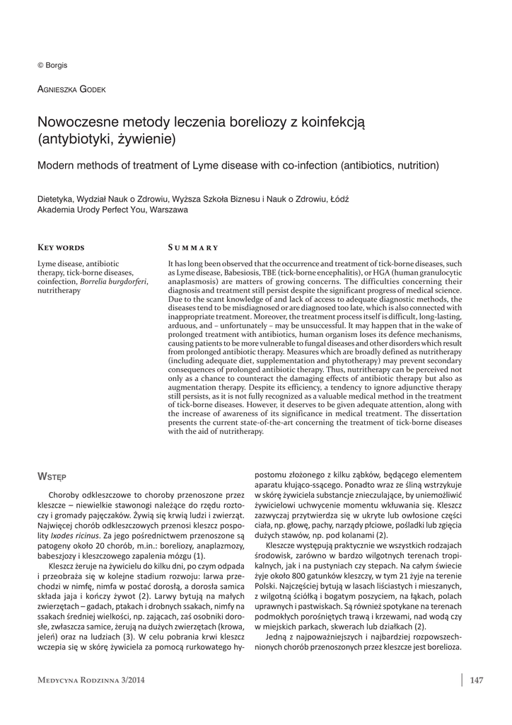 © Borgis Agnieszka Godek Nowoczesne metody leczenia boreliozy z koinfekcją (antybiotyki, żywienie) Modern methods of treatment of Lyme disease with co-infection (antibiotics, nutrition) Dietetyka, Wydział Nauk o Zdrowiu, Wyższa Szkoła Biznesu i Nauk o Zdrowiu, Łódź Akademia Urody Perfect You, Warszawa Key words Summary Lyme disease, antibiotic therapy, tick-borne diseases, coinfection, Borrelia burgdorferi, nutritherapy It has long been observed that the occurrence and treatment of tick-borne diseases, such as Lyme disease, Babesiosis, TBE (tick-borne encephalitis), or HGA (human granulocytic anaplasmosis) are matters of growing concerns. The difficulties concerning their diagnosis and treatment still persist despite the significant progress of medical science. Due to the scant knowledge of and lack of access to adequate diagnostic methods, the diseases tend to be misdiagnosed or are diagnosed too late, which is also connected with inappropriate treatment. Moreover, the treatment process itself is difficult, long-lasting, arduous, and – unfortunately – may be unsuccessful. It may happen that in the wake of prolonged treatment with antibiotics, human organism loses its defence mechanisms, causing patients to be more vulnerable to fungal diseases and other disorders which result from prolonged antibiotic therapy. Measures which are broadly defined as nutritherapy (including adequate diet, supplementation and phytotherapy) may prevent secondary consequences of prolonged antibiotic therapy. Thus, nutritherapy can be perceived not only as a chance to counteract the damaging effects of antibiotic therapy but also as augmentation therapy. Despite its efficiency, a tendency to ignore adjunctive therapy still persists, as it is not fully recognized as a valuable medical method in the treatment of tick-borne diseases. However, it deserves to be given adequate attention, along with the increase of awareness of its significance in medical treatment. The dissertation presents the current state-of-the-art concerning the treatment of tick-borne diseases with the aid of nutritherapy. Wstęp Choroby odkleszczowe to choroby przenoszone przez kleszcze – niewielkie stawonogi należące do rzędu roztoczy i gromady pajęczaków. Żywią się krwią ludzi i zwierząt. Najwięcej chorób odkleszczowych przenosi kleszcz pospolity Ixodes ricinus. Za jego pośrednictwem przenoszone są patogeny około 20 chorób, m.in.: boreliozy, anaplazmozy, babeszjozy i kleszczowego zapalenia mózgu (1). Kleszcz żeruje na żywicielu do kilku dni, po czym odpada i przeobraża się w kolejne stadium rozwoju: larwa przechodzi w nimfę, nimfa w postać dorosłą, a dorosła samica składa jaja i kończy żywot (2). Larwy bytują na małych zwierzętach – gadach, ptakach i drobnych ssakach, nimfy na ssakach średniej wielkości, np. zającach, zaś osobniki dorosłe, zwłaszcza samice, żerują na dużych zwierzętach (krowa, jeleń) oraz na ludziach (3). W celu pobrania krwi kleszcz wczepia się w skórę żywiciela za pomocą rurkowatego hyMedycyna Rodzinna 3/2014 postomu złożonego z kilku ząbków, będącego elementem aparatu kłująco-ssącego. Ponadto wraz ze śliną wstrzykuje w skórę żywiciela substancje znieczulające, by uniemożliwić żywicielowi uchwycenie momentu wkłuwania się. Kleszcz zazwyczaj przytwierdza się w ukryte lub owłosione części ciała, np. głowę, pachy, narządy płciowe, pośladki lub zgięcia dużych stawów, np. pod kolanami (2). Kleszcze występują praktycznie we wszystkich rodzajach środowisk, zarówno w bardzo wilgotnych terenach tropikalnych, jak i na pustyniach czy stepach. Na całym świecie żyje około 800 gatunków kleszczy, w tym 21 żyje na terenie Polski. Najczęściej bytują w lasach liściastych i mieszanych, z wilgotną ściółką i bogatym poszyciem, na łąkach, polach uprawnych i pastwiskach. Są również spotykane na terenach podmokłych porośniętych trawą i krzewami, nad wodą czy w miejskich parkach, skwerach lub działkach (2). Jedną z najpoważniejszych i najbardziej rozpowszechnionych chorób przenoszonych przez kleszcze jest borelioza. 147 Agnieszka Godek Stanowi ona najczęściej występującą chorobę transmisyjną w Europie, w tym również w Polsce. Od wielu lat obserwowany jest stały wzrost częstości jej występowania (3). Niektóre tereny w Polsce są wyjątkowo narażone na występowanie zakażonych kleszczy. Największy wskaźnik zapadalności w poprzednich latach odnotowano w województwie podlaskim, czyli terenie o znacznej ilości ognisk przyrodniczych (4). Charakterystyka boreliozy Borelioza, zwana też chorobą z Lyme, to przewlekła, wieloukładowa i wielopostaciowa choroba wywoływana przez Gram-ujemną, spiralną bakterię – krętka Borrelia burgdorferi przenoszonego przez kleszcze. Do zakażenia boreliozą dochodzi na skutek bezpośredniego kontaktu kleszcza zakażonego krętkiem Borrelia ze skórą człowieka. W momencie kontaktu krętek wnika do organizmu ludzkiego wraz ze śliną lub wymiocinami kleszcza. Zakażenie zazwyczaj następuje po 24-48 godzinach bytowania pasożyta w ciele człowieka, dlatego tak istotne jest jak najszybsze usunięcie go (5). Jeżeli kleszcz pozostaje w skórze ponad 72 godziny, zakażenie boreliozą jest praktycznie stuprocentowe (3). Bakterie Borrelia burgdorferi mają złożoną strukturę genetyczną, zapewniającą im wyjątkowo efektywną adaptację do organizmu ludzkiego. Po dostaniu się do organizmu człowieka mają zdolność przechodzenia z ruchliwych form aktywnych w formy nieruchome, tzw. cysty. W takiej utajonej postaci są w stanie przebywać długo – jest to tzw. okres latencji, podczas którego nie występują u człowieka żadne symptomy choroby. Taka postać bakterii jest pozbawiona ściany komórkowej, co tłumaczy niską skuteczność leczenia boreliozy niektórymi antybiotykami, których działanie polega głównie na hamowaniu syntezy ściany komórkowej bakter