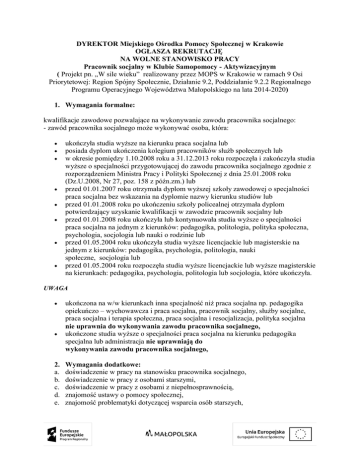 DYREKTOR Miejskiego Ośrodka Pomocy Społecznej w Krakowie OGŁASZA REKRUTACJĘ NA WOLNE STANOWISKO PRACY Pracownik socjalny w Klubie Samopomocy - Aktywizacyjnym ( Projekt pn. „W sile wieku” realizowany przez MOPS w Krakowie w ramach 9 Osi Priorytetowej: Region Spójny Społecznie, Działanie 9.2, Poddziałanie 9.2.2 Regionalnego Programu Operacyjnego Województwa Małopolskiego na lata 2014-2020) 1. Wymagania formalne: kwalifikacje zawodowe pozwalające na wykonywanie zawodu pracownika socjalnego: - zawód pracownika socjalnego może wykonywać osoba, która: ukończyła studia wyższe na kierunku praca socjalna lub posiada dyplom ukończenia kolegium pracowników służb społecznych lub w okresie pomiędzy 1.10.2008 roku a 31.12.2013 roku rozpoczęła i zakończyła studia wyższe o specjalności przygotowującej do zawodu pracownika socjalnego zgodnie z rozporządzeniem Ministra Pracy i Polityki Społecznej z dnia 25.01.2008 roku (Dz.U.2008, Nr 27, poz. 158 z późn.zm.) lub przed 01.01.2007 roku otrzymała dyplom wyższej szkoły zawodowej o specjalności praca socjalna bez wskazania na dyplomie nazwy kierunku studiów lub przed 01.01.2008 roku po ukończeniu szkoły policealnej otrzymała dyplom potwierdzający uzyskanie kwalifikacji w zawodzie pracownik socjalny lub przed 01.01.2008 roku ukończyła lub kontynuowała studia wyższe o specjalności praca socjalna na jednym z kierunków: pedagogika, politologia, polityka społeczna, psychologia, socjologia lub nauki o rodzinie lub przed 01.05.2004 roku ukończyła studia wyższe licencjackie lub magisterskie na jednym z kierunków: pedagogika, psychologia, politologia, nauki społeczne, socjologia lub przed 01.05.2004 roku rozpoczęła studia wyższe licencjackie lub wyższe magisterskie na kierunkach: pedagogika, psychologia, politologia lub socjologia, które ukończyła. UWAGA 2. a. b. c. d. e. ukończona na w/w kierunkach inna specjalność niż praca socjalna np. pedagogika opiekuńczo – wychowawcza i praca socjalna, pracownik socjalny, służby socjalne, praca socjalna i terapia społeczna, praca socjalna i resocjalizacja, polityka socjalna nie uprawnia do wykonywania zawodu pracownika socjalnego, ukończone studia wyższe o specjalności praca socjalna na kierunku pedagogika specjalna lub administracja nie uprawniają do wykonywania zawodu pracownika socjalnego, Wymagania dodatkowe: doświadczenie w pracy na stanowisku pracownika socjalnego, doświadczenie w pracy z osobami starszymi, doświadczenie w pracy z osobami z niepełnosprawnością, znajomość ustawy o pomocy społecznej, znajomość problematyki dotyczącej wsparcia osób starszych, f. znajomość obsługi komputera w zakresie środowiska Windows i pakietu Office w stopniu bardzo dobrym. 3. a. b. c. d. e. f. g. h. i. j. k. l. m. n. Zakres obowiązków: prowadzenie pracy socjalnej z podopiecznymi i ich rodzinami, prowadzenie warsztatów z zakresu poradnictwa, profilaktyki oraz gerontologii, świadczenie usług opiekuńczo- pielęgnacyjnych, aktywizująco- usprawniających oraz usług wspomagających na rzecz podopiecznych, organizowanie działań wynikających ze świadczonych usług na rzecz podopiecznych, udzielanie wsparcia emocjonalnego osobie starszej i jej rodzinie, udział w tworzeniu i realizacji programów mających na celu usprawnienie podopiecznych realizacja zadań wynikających z Regulaminu placówki oraz Indywidualnych Planów Działań podopiecznych, wsparcie i pomoc w czynnościach dnia codziennego podopiecznych, nawiązywanie kontaktu z podopiecznym, diagnozowanie potrzeb i problemów osoby starszej, kształtowanie pożądanych zachowań i postaw podopiecznych, współpraca ze specjalistami świadczącymi usługi na rzecz osób starszych, prowadzenie dokumentacji podopiecznych, inne zlecone przez Kierownika placówki. Warunki pracy i płacy: umowa o pracę na czas określony, praca dzielona pomiędzy 2 placówki – Kluby Samopomocy – Aktywizacyjne, wynagrodzenie zasadnicze: w przedziale od 2 400,00 zł do 2 500,00 zł. inne elementy wynagrodzenia zgodnie z Regulaminem Wynagradzania MOPS w Krakowie. d. wynagrodzenie współfinansowane ze środków Regionalnego Programu Operacyjnego Województwa Małopolskiego na lata 2014-2020 w ramach 9 Osi Priorytetowej Region spójny społecznie, Działania 9.2 Usługi społeczne i zdrowotne, Poddziałania 9.2.2 Usługi opiekuńcze oraz interwencja kryzysowa - ZIT, Typ projektu: B. wsparcie dla tworzenia i/lub działalności placówek zapewniających dzienną opiekę i aktywizację osób niesamodzielnych”, w ramach projektu pn. „W sile wieku”. 4. a. b. b. c. 5. a. b. c. Wymagane dokumenty: list motywacyjny, cv, kopie dokumentów poświadczających wykształcenie oraz dodatkowe kwalifikacje (kursy, szkolenia), d. kopie dokumentów poświadczających dotychczasowe zatrudnienie, e. zaświadczenie, że osoba nie była skazana prawomocnym wyrokiem sądu za umyślne przestępstwo ścigane z oskarżenia publicznego lub umyślne przestępstwo skarbowe i o pełnej zdolności do czynności prawnych oraz o korzystaniu z pełni praw publicznych. f. oświadczenie o treści: „Wyrażam zgodę na przetwarzanie przez Miejski Ośrodek Pomocy Społecznej w Krakowie moich danych osobowych wskazanych w dokumentach rekrutacyjnych w związku z prowadzonym naborem na stanowisko pracownika socjalnego w Klubie Samopomocy- Aktywizacyjnym.” g. opcjonalnie w przypadku braku propozycji zatrudnienia w wyniku w/w naboru kandydat może złożyć oświadczenie o treści: „Wyrażam zgodę na przetwarzanie przez Miejski Ośrodek Pomocy Społecznej w Krakowie moich danych osobowych wskazanych w dokumentach rekrutacyjnych w celu włączenia do zbioru ofert osób ubiegających się o zatrudnienie w MOPS.” 6. Termin i miejsce składania dokumentów: Powyższe dokumenty należy złożyć osobiście lub przesłać pocztą na adres: Kancelaria MOPS, 30-529 Kraków, ul. Józefińska 14. w terminie do 2 lutego 2017 roku (zaliczamy dat