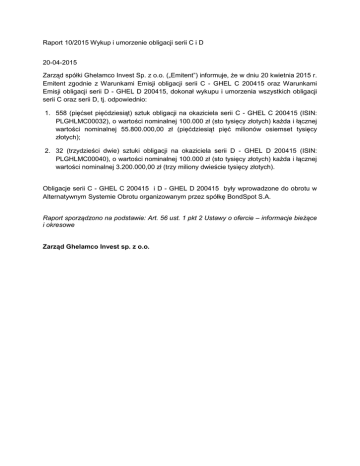 Raport 10/2015 Wykup i umorzenie obligacji serii C i D 20-04-2015 Zarząd spółki Ghelamco Invest Sp. z o.o. („Emitent”) informuje, że w dniu 20 kwietnia 2015 r. Emitent zgodnie z Warunkami Emisji obligacji serii C - GHEL C 200415 oraz Warunkami Emisji obligacji serii D - GHEL D 200415, dokonał wykupu i umorzenia wszystkich obligacji serii C oraz serii D, tj. odpowiednio: 1. 558 (pięćset pięćdziesiąt) sztuk obligacji na okaziciela serii C - GHEL C 200415 (ISIN: PLGHLMC00032), o wartości nominalnej 100.000 zł (sto tysięcy złotych) każda i łącznej wartości nominalnej 55.800.000,00 zł (pięćdziesiąt pięć milionów osiemset tysięcy złotych); 2. 32 (trzydzieści dwie) sztuki obligacji na okaziciela serii D - GHEL D 200415 (ISIN: PLGHLMC00040), o wartości nominalnej 100.000 zł (sto tysięcy złotych) każda i łącznej wartości nominalnej 3.200.000,00 zł (trzy miliony dwieście tysięcy złotych). Obligacje serii C - GHEL C 200415 i D - GHEL D 200415 były wprowadzone do obrotu w Alternatywnym Systemie Obrotu organizowanym przez spółkę BondSpot S.A. Raport sporządzono na podstawie: Art. 56 ust. 1 pkt 2 Ustawy o ofercie – informacje bieżące i okresowe Zarząd Ghelamco Invest sp. z o.o.