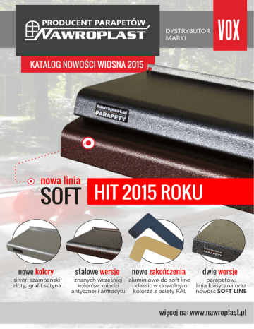 nowa linia SOFT nowe kolory silver, szampański złoty, grafit satyna stalowe wersje nowe zakończenia dwie wersje znanych wcześniej aluminiowe do soft line parapetów: kolorów: miedzi i classic w dowolnym linia klasyczna oraz antycznej i antracytu kolorze z palety RAL nowość SOFT LINE KATALOG NOWOŚCI WIOSNA 2015: nowa linia parapetów SOFT LINE Szanowni klienci, z przyjemnością informujemy, że od kwietnia 2015 roku nasza oferta wzbogaca się o nową linię SOFT, co oznacza, że znacznie zwiększa to asortyment naszej Firmy. Jest to odpowiedź na zapotrzebowanie rynku na parapety zaokrąglone, a nie jak do tej pory zaginane pod kątem 90 stopni. Po sukcesie parapetów aluminiowych typu płytka w wersji SOFT przyszedł czas na wprowadzenie do sprzedaży najbardziej popularnych parapetów w naszej firmie także w wersji zaokrąglonej i nieco subtelniejszej. Oferta dostępna jest zarówno w naszym sklepie w Tokarni k.Kielc jak i w sprzedaży wysyłkowej. Dostępne szerokości: 12cm; 15cm; 18cm; 20cm; 22,5cm; 25cm; 27,5cm; 30cm; 35cm; 40 cm Długość parapetu: dowolna do 6mb nowa linia linia CLASSIC SOFT zagięcie typu NARĄBEK bez konieczności stosowania zakończeń aluminiowych lub PCV STRONA 2 Grubość parapetu: 1,2mm NOWA LINIA I CENA BEZ ZMIAN Uwaga klienci ! cena parapetów stalowych dostępnych w wersji kolorystycznej palety RAL jak i drewnopodobnych w nowej linii SOFT LINE pozostaje bez zmian w stosunku do linii classic. Do nowej linii proponujemy zakup zakończeń PCV lub aluminiowych. Istnienie także możliwość wykonania parapetów, do których nie trzeba stosować zakończeń. Są one zagięte na końcówkach z tzw. narąbkiem aby woda mogła swobodnie spływać. WIOSNA 2015: stalowe wersje kolorów miedzi antycznej i antracytu CO WYRÓŻNIA TE PARAPETY Kolory antracyt oraz miedź antyczna to kolory bardzo charakterystyczne spośród naszej oferty i niewątpliwie wyróżniające się wśród innych. Nasze nowe parapety stalowe różnią się od swoich poprzedników przede wszystkim wyglądem, brak im bowiem przetłoczeń (imitacji płytki). Są one malowane proszkowo (lakierowane). Posiadają jedyną w swoim rodzaju strukturę młotkową. W momencie udostępnienia do sprzedaży kolorów miedź antyczna oraz antracyt, wpływało do naszej firmy coraz więcej zapytań odnośnie parapetów stalowych w wyżej wymienionych kolorach. W związku z powyższym podjęliśmy decyzję o wprowadzeniu tańszych stalowych odpowiedników, dobrze znanych klientom aluminiowych parapetów. Mamy nadzieję, że nasze parapety w nowej wersji przypadną Państwu do gustu. DOSTĘPNE WERSJE: SOFT line CLASSIC line malowanie PROSZKOWE struktura MŁOTKOWA HIT W OFERCIE TAKŻE: nowe aluminiowe zakończenia w kolorach z palety RAL większa ŻYWOTNOŚĆ odporne na PROMIENIE UV elegancki WYGLĄD Kolejną nowością w sprzedaży są zakończenia parapetów o długościach 30 oraz 40 cm. Dotychczas występowały w kolorach miedź antyczna i antracyt jako standard, lecz od kwietnia wprowadzamy do sprzedaży eleganckie aluminiowe zakończenia parapetów dostępne we wszystkich w kolorach palety RAL. STRONA 3 KATALOG NOWOŚCI WIOSNA 2015: nowe kolory parapetów w ofercie NOWA LINIA KOLORYSTYCZNA Wprowadzenie nowej linii soft to nie jedyna nowość w sprzedaży naszej firmy. Idąc z duchem czasu, biorąc jednocześnie pod uwagę nie tylko gusta naszych klientów lecz także nowoczesne trendy w kwietniu 2015 roku wprowadzamy do sprzedaży nowe kolory parapetów: silver, szampański, złoty oraz grafit satyna. Jak przystało na nowości w ofercie nasza nowa gama kolorystyczna dostępna jest w obydwu liniach, czyli classic oraz soft. PARAPETY STALOWE W NOWEJ KONFIGURACJI kolor parapetu: SOFT line CLASSIC line kolor parapetu: MIEDŹ ANTYCZNA ANTRACYT NOWY KOLOR NOWY KOLOR kolor parapetu: kolor parapetu: ZŁOTY / GOLD SREBRNY / SILVER NOWY KOLOR kolor parapetu: STRONA 4 GRAFIT RAL7017 kolor parapetu: SZAMPAŃSKI KATALOG NOWOŚCI WIOSNA 2015: nowe kolory parapetów w ofercie kolor parapetu: BRĄZ RAL8017 kolor parapetu: CZARNY RAL9005 TO JEST NOWOŚĆ kolor parapetu: WINCHESTER kolor parapetu: ORZECH BRAZYLIJSKI MACORE kolor parapetu: DĄB BAGIENNY WENGE kolor parapetu: ZŁOTY DĄB kolor parapetu: ORZECH kolor parapetu: MAHOŃ STRONA 5
