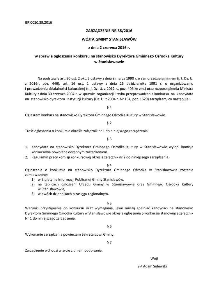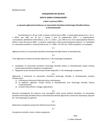 BR.0050.39.2016 ZARZĄDZENIE NR 38/2016 WÓJTA GMINY STANISŁAWÓW z dnia 2 czerwca 2016 r. w sprawie ogłoszenia konkursu na stanowisko Dyrektora Gminnego Ośrodka Kultury w Stanisławowie Na podstawie art. 30 ust. 2 pkt. 5 ustawy z dnia 8 marca 1990 r. o samorządzie gminnym (j. t. Dz. U. z 2016r. poz. 446), art. 16 ust. 1 ustawy z dnia 25 października 1991 r. o organizowaniu i prowadzeniu działalności kulturalnej (t. j. Dz. U. z 2012 r., poz. 406 ze zm.) oraz rozporządzenia Ministra Kultury z dnia 30 czerwca 2004 r. w sprawie organizacji i trybu przeprowadzania konkursu na kandydata na stanowisko dyrektora instytucji kultury (Dz. U. z 2004 r. Nr 154, poz. 1629) zarządzam, co następuje: §1 Ogłaszam konkurs na stanowisko Dyrektora Gminnego Ośrodka Kultury w Stanisławowie. §2 Treść ogłoszenia o konkursie określa załącznik nr 1 do niniejszego zarządzenia. §3 1. Kandydata na stanowisko Dyrektora Gminnego Ośrodka Kultury w Stanisławowie wyłoni komisja konkursowa powołana odrębnym zarządzeniem. 2. Regulamin pracy komisji konkursowej określa załącznik nr 2 do niniejszego zarządzenia. §4 Ogłoszenie o konkursie na stanowisko Dyrektora Gminnego Ośrodka w Stanisławowie zostanie zamieszczone: 1) w Biuletynie Informacji Publicznej Gminy Stanisławów, 2) na tablicach ogłoszeń: Urzędu Gminy w Stanisławowie oraz Gminnego Ośrodka Kultury w Stanisławowie, 3) w dwóch dziennikach o zasięgu regionalnym. §5 Warunki przystąpienia do konkursu oraz wymagania, jakie muszą spełniać kandydaci na stanowisko Dyrektora Gminnego Ośrodka Kultury w Stanisławowie określa ogłoszenie o konkursie stanowiące załącznik Nr 1 do niniejszego zarządzenia. §6 Wykonanie zarządzenia powierzam Sekretarzowi Gminy. §7 Zarządzenie wchodzi w życie z dniem podpisania. Wójt /-/ Adam Sulewski Załącznik Nr 1 do Zarządzenia Nr 38/2016 Wójta Gminy Stanisławów z dnia 2 czerwca 2016 r. w sprawie ogłoszenia konkursu na stanowisko Dyrektora Gminnego Ośrodka Kultury w Stanisławowie WÓJT GMINY STANISŁAWÓW OGŁASZA KONKURS NA STANOWISKO DYREKTORA GMINNEGO OŚRODKA KULTURY W STANISŁAWOWIE UL. Rynek 31, 05-304 Stanisławów Liczba stanowisk: 1 Wymiar etatu: 1 etat (pełny wymiar czasu pracy) I. Do konkursu może przystąpić osoba, która spełnia następujące wymagania: A. Wymagania obowiązkowe: 1. obywatelstwo polskie; 2. wykształcenie: wyższe magisterskie, preferowane o kierunku lub specjalności kulturoznawstwo, zarządzanie kulturą, animacja kultury lub pokrewne; 3. co najmniej 5 letni staż pracy, w tym co najmniej roczny staż pracy w instytucji kultury, 4. stan zdrowia pozwalający na zatrudnienie na danym stanowisku pracy; 5. pełna zdolność do czynności prawnych oraz korzystanie z pełni praw publicznych; 6. niekaralność za umyślne przestępstwo ścigane z oskarżenia publicznego lub umyślne przestępstwo skarbowe; 7. brak zakazu pełnienia funkcji związanych z dysponowaniem środkami publicznymi, o którym mowa w art. 31 ust. 1 pkt. 4 ustawy z dnia 17 grudnia 2004 r. o odpowiedzialności za naruszenie dyscypliny finansów publicznych (Dz. U. z 2013 r., poz. 168); 8. znajomość zasad organizacji i funkcjonowania instytucji kultury; 9. znajomość aktów prawnych dotyczących instytucji kultury i prawa pracy. B. Wymagania dodatkowe: 1. znajomość podstawowych aktów prawnych z zakresu funkcjonowania samorządu gminnego; 2. znajomość zagadnień i doświadczeń w pozyskiwaniu pozabudżetowych środków finansowych, w tym środków z programów Unii Europejskiej; 3. predyspozycje do organizowania i prowadzenia przedsięwzięć promocyjnych związanych z działalnością kulturalną i twórczością artystyczną; 4. umiejętności organizacyjne i zarządcze; 5. kreatywność, dyspozycyjność, rzetelność; 6. posiadanie prawa jazdy kat. B. II. Wymagane dokumenty: 1. pisemna koncepcja funkcjonowania Gminnego Ośrodka Kultury w Stanisławowie na lata 20162020 ( nie więcej niż 4 strony formatu A4), która powinna zawierać: a) propozycje rozwoju nowych oraz istniejących form kultury na terenie gminy; b) zakres współpracy z istniejącymi stowarzyszeniami, fundacjami i grupami nieformalnymi działającymi na terenie Gminy; c) źródła finansowania działalności Gminnego Ośrodka Kultury w Stanisławowie. 2. list motywacyjny; 3. życiorys/CV/ z opisem przebiegu dotychczasowej pracy zawodowej; 4. kopie dokumentów potwierdzających wykształcenie, doświadczenie zawodowe(staż pracy) oraz posiadane kwalifikacje i umiejętności; 5. oświadczenie o niekaralności za umyślne przestępstwo ściągane z oskarżenia publicznego lub umyślne przestępstwo skarbowe; 6. oświadczenie o niekaralności związanej z zakazem pełnienia funkcji związanych z dysponowaniem środkami publicznymi; 7. oświadczenie o stanie zdrowia i braku przeciwskazań do wykonywania pracy na stanowisku kierowniczym; 8. oświadczenie o posiadaniu pełnej zdolności do czynności prawnych oraz korzystaniu w pełni z praw publicznych; 9. kopia dowodu osobistego; 10. kopia prawa jazdy; 11. oświadczenie o wyrażeniu zgody na przetwarzanie danych osobowych o treści: „Wyrażam zgodę na przetwarzanie danych osobowych w celu przeprowadzenia konkursu na stanowisko dyrektora Gminnego Ośrodka Kultury w Stanisławowie zgodnie z ustawą z dnia 19 sierpnia 1997 r. o ochronie danych osobowych (tj. Dz. U. z 2014 r., poz. 1182).” Oświadczenia, koncepcja, list motywacyjny oraz CV powinny być podpisane własnoręcznie przez kandydata, a kserokopie dokumentów potwierdzone za zgodność z oryginałem własnoręcznym podpisem kandydata. III. Informacja o sposobie i terminie składania ofert: Oferty należy składać w zamkniętych kopertach z podanym adresem zwrotnym z dopiskiem "Konkurs na stanowisko Dyrektora Gminnego Ośrodka Kultury w Stanisławowie", w terminie do dnia 11 lipca 2016r. do godziny 12:00 w sekretariacie Urzędu Gminy Stanisławów lub przesłać pocztą na adres: Urząd Gminy St